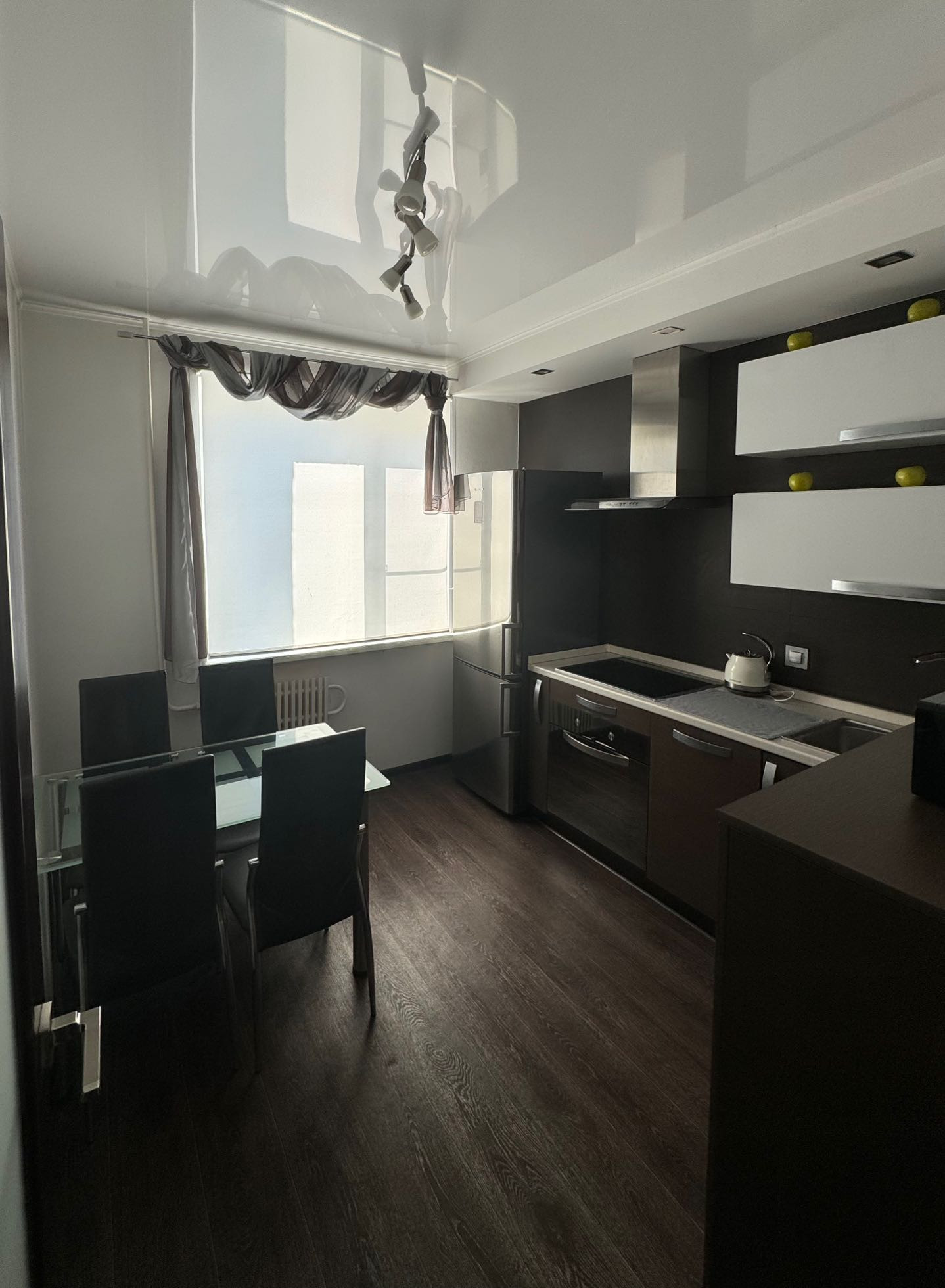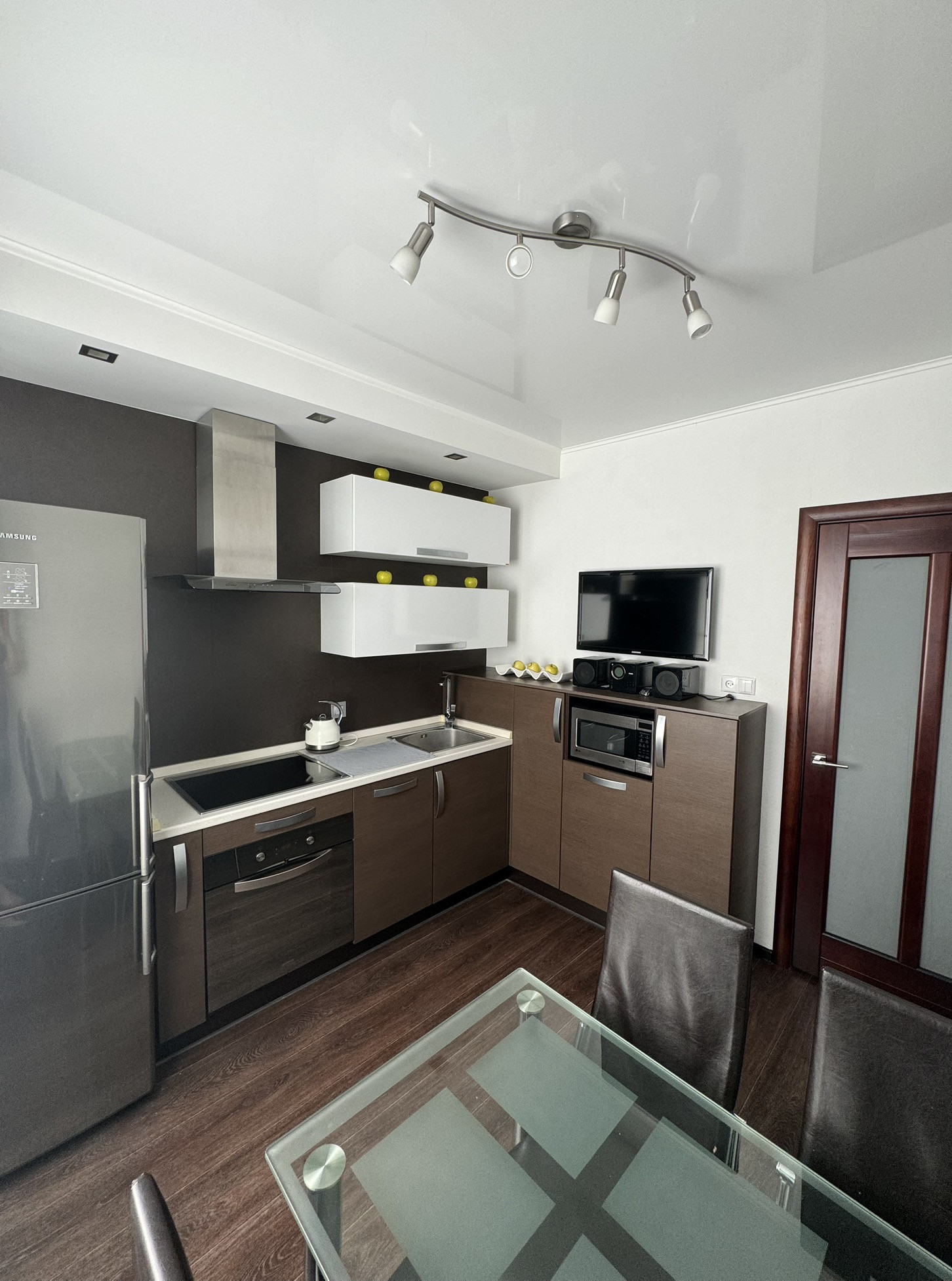- В кухне установлен кухонный гарнитур Bacio, выполнен по индивидуальному заказу. Столешница и фасады производства Италия, фурнитура Blum. Фартук – итальянский керамогранит. В кухне остается вся техника: Холодильник Samsung, варочная панель и духовой шкаф Gorenje, вытяжка, посудомоечная машина Krona, микроволновая печь LG, а так же телевизор Samsung 32”. Стеклянный стол и четыре стула.