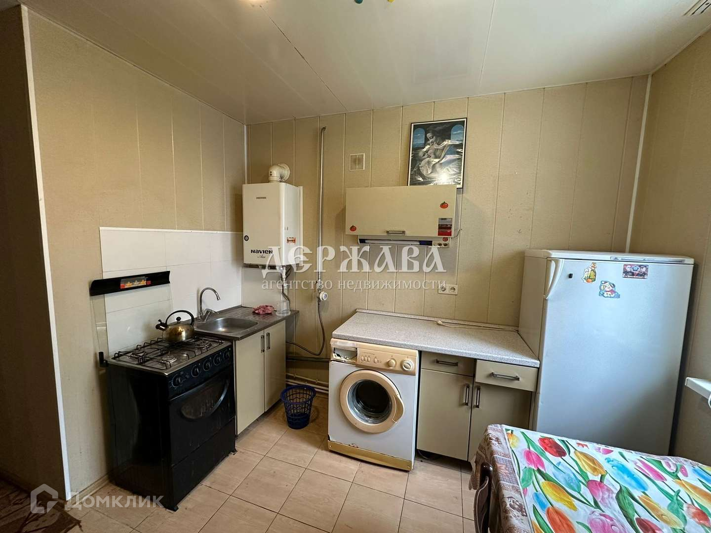 Присутствует мебель и техника, а именно: плита, холодильник, шкаф, кровать, стол, стулья.