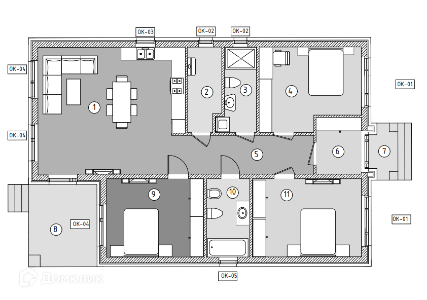 Современная планировка: тамбур, три спальни, кухня-гостинная 36 м2 + крытая терраса 11м2, котельная 5 м2, два санузла.