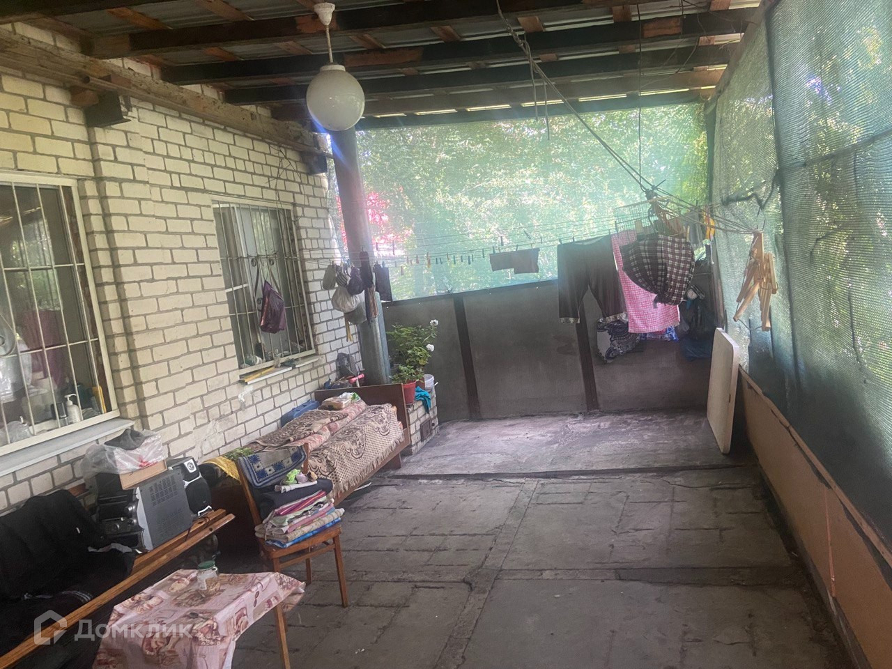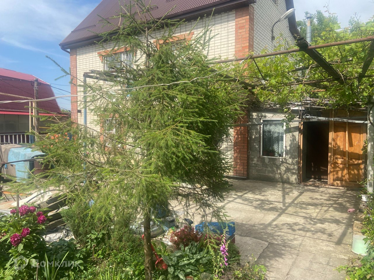 Ухоженный огород с плодовыми деревьями, асфальтированный двор с огороженной зоной отдыха.