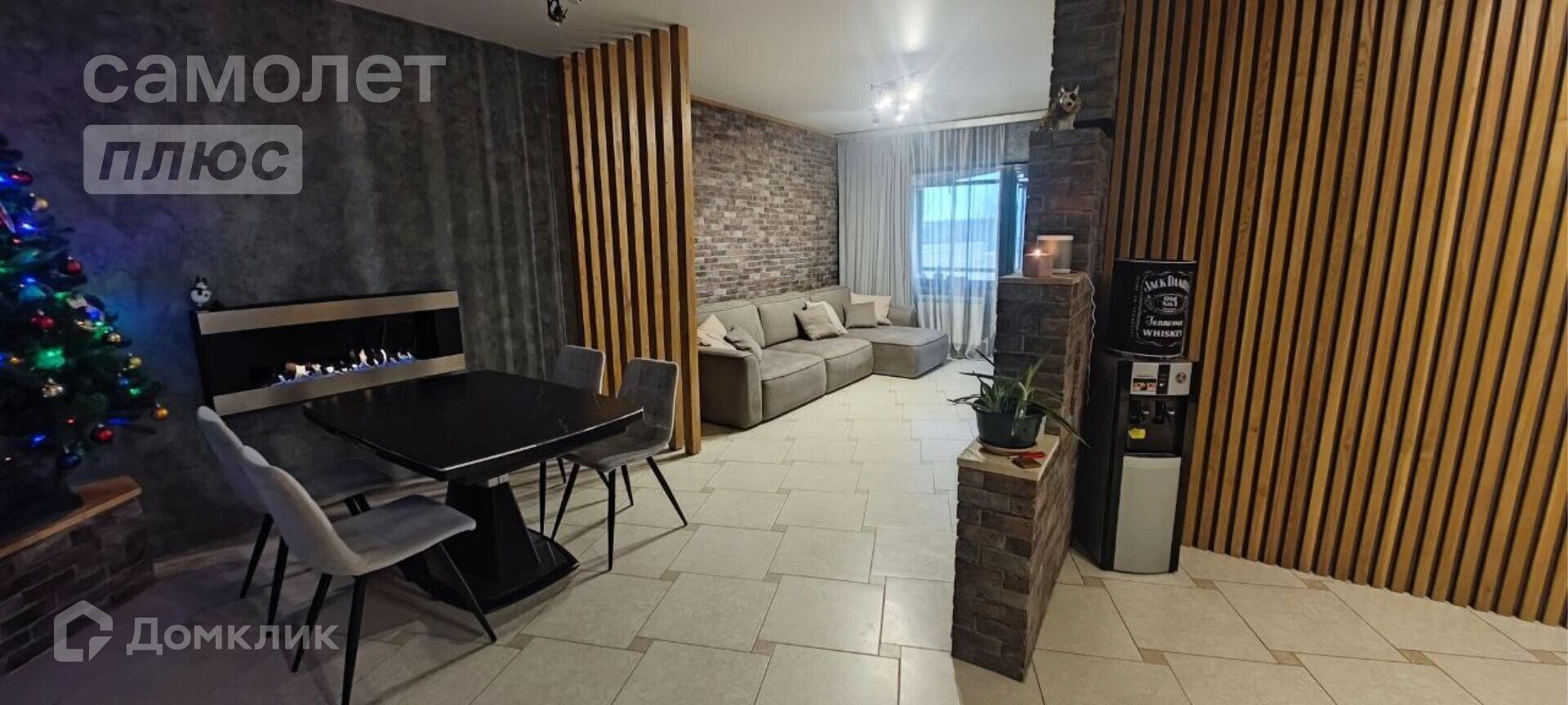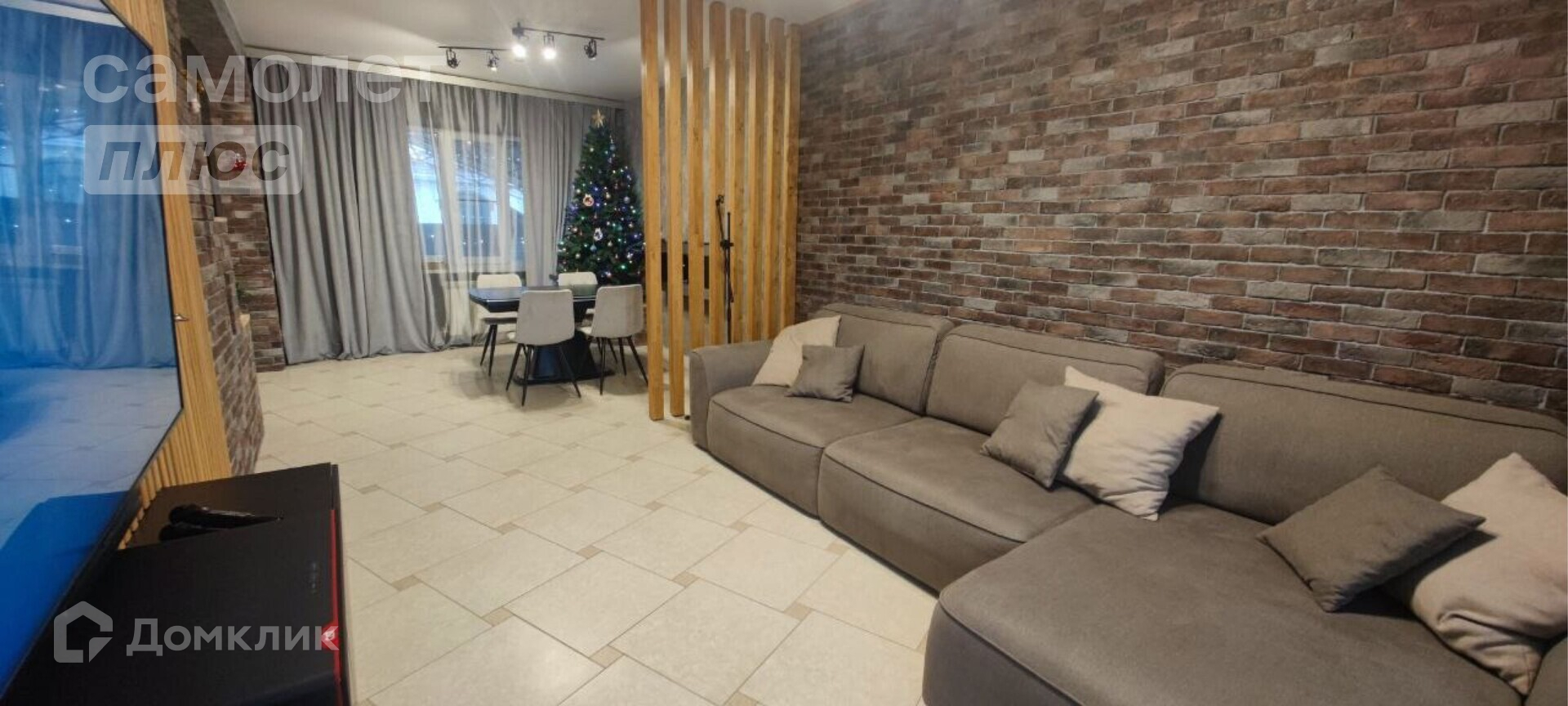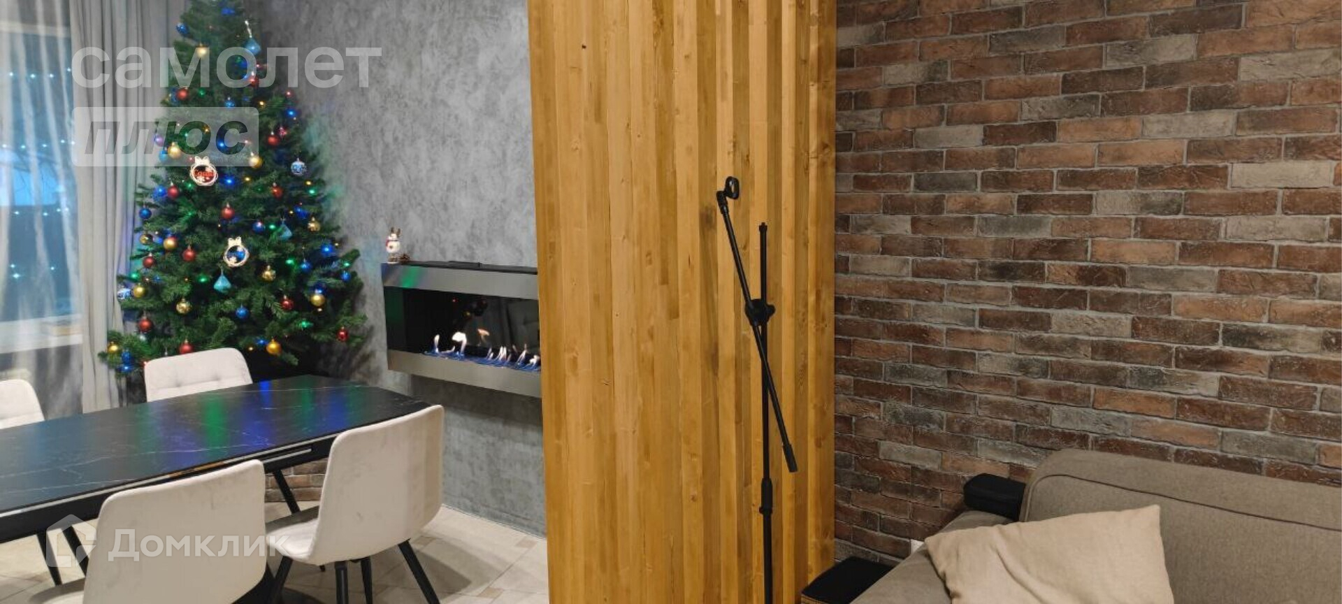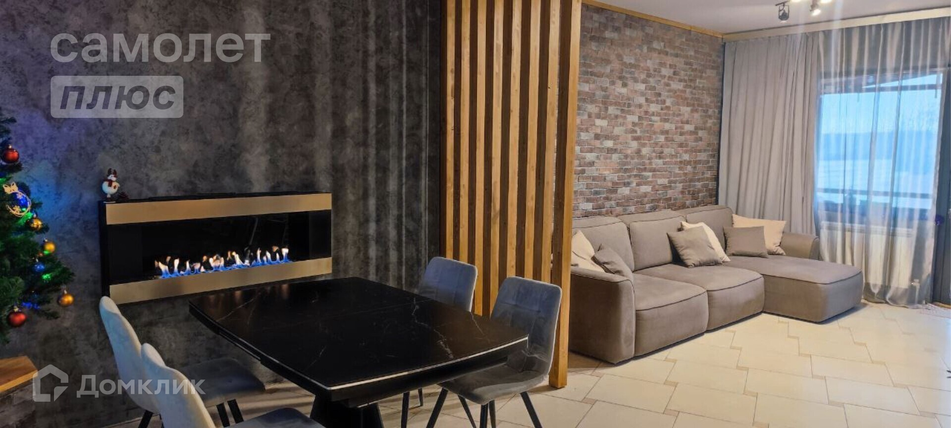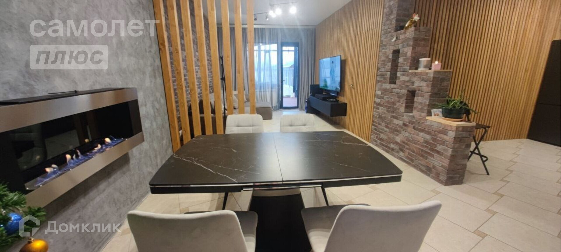 В столовой большой раздвижной стол с керамогранитной столешницей, мягкие стулья, биокамин. В гостиной диван 3,3 метра, большой телевизор самсунг 65 дюймов, саундбар, навесная тумба. Стены из декоративного кирпича и реек из ясеня. Скрытая дверь в спальню (площадь спальни 14,1 кв.м.)