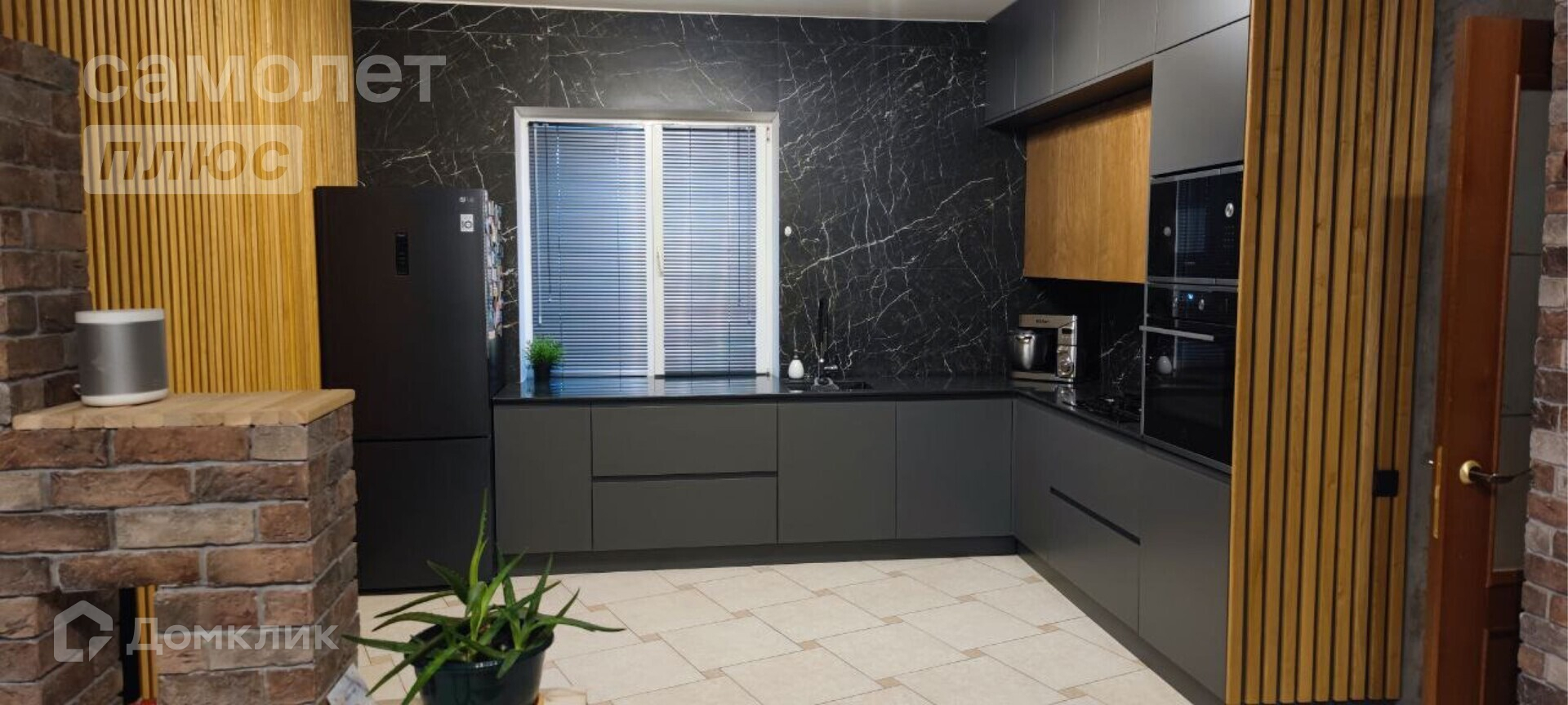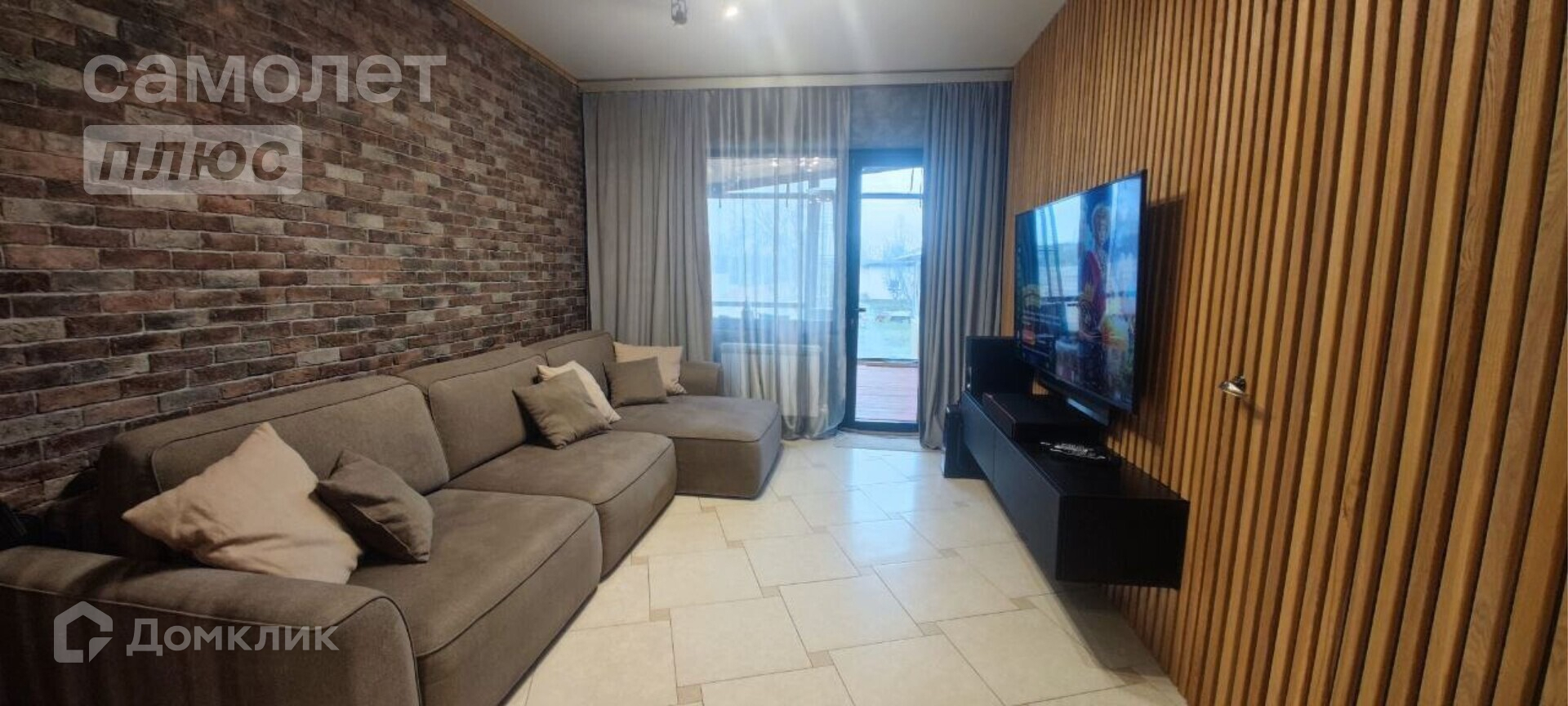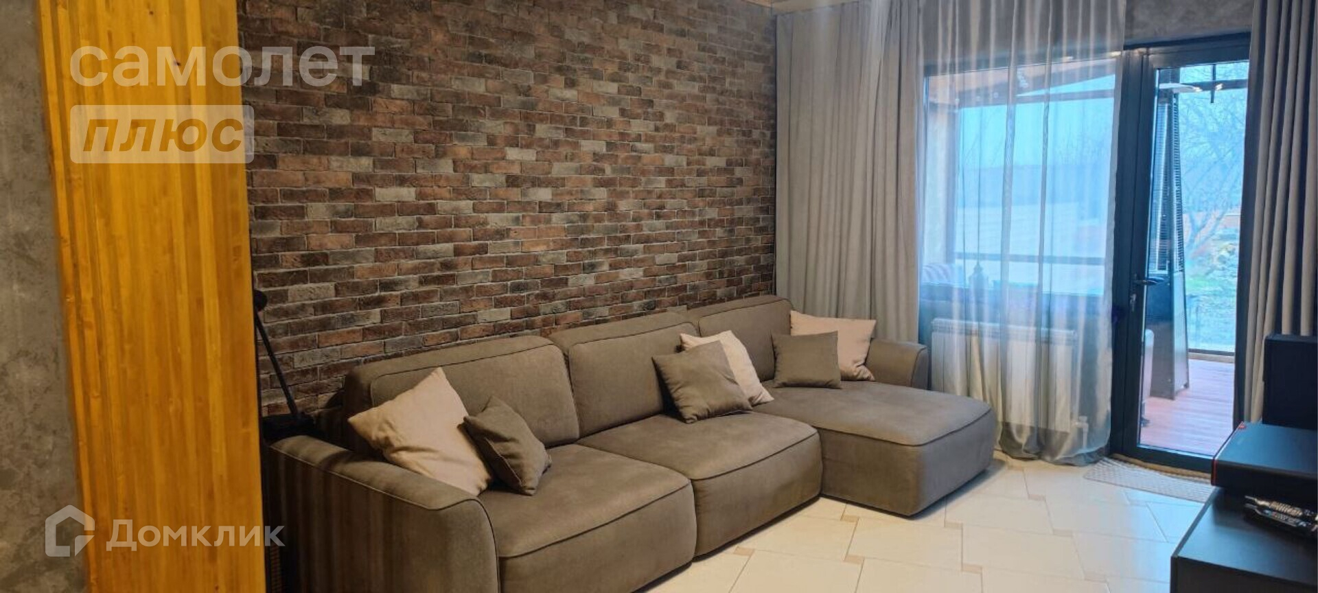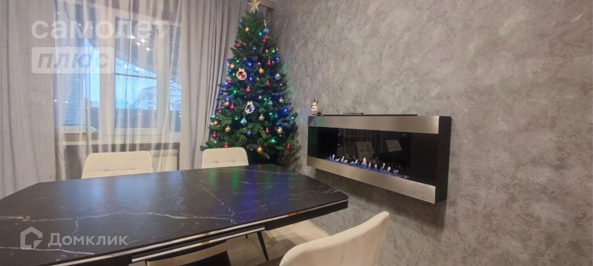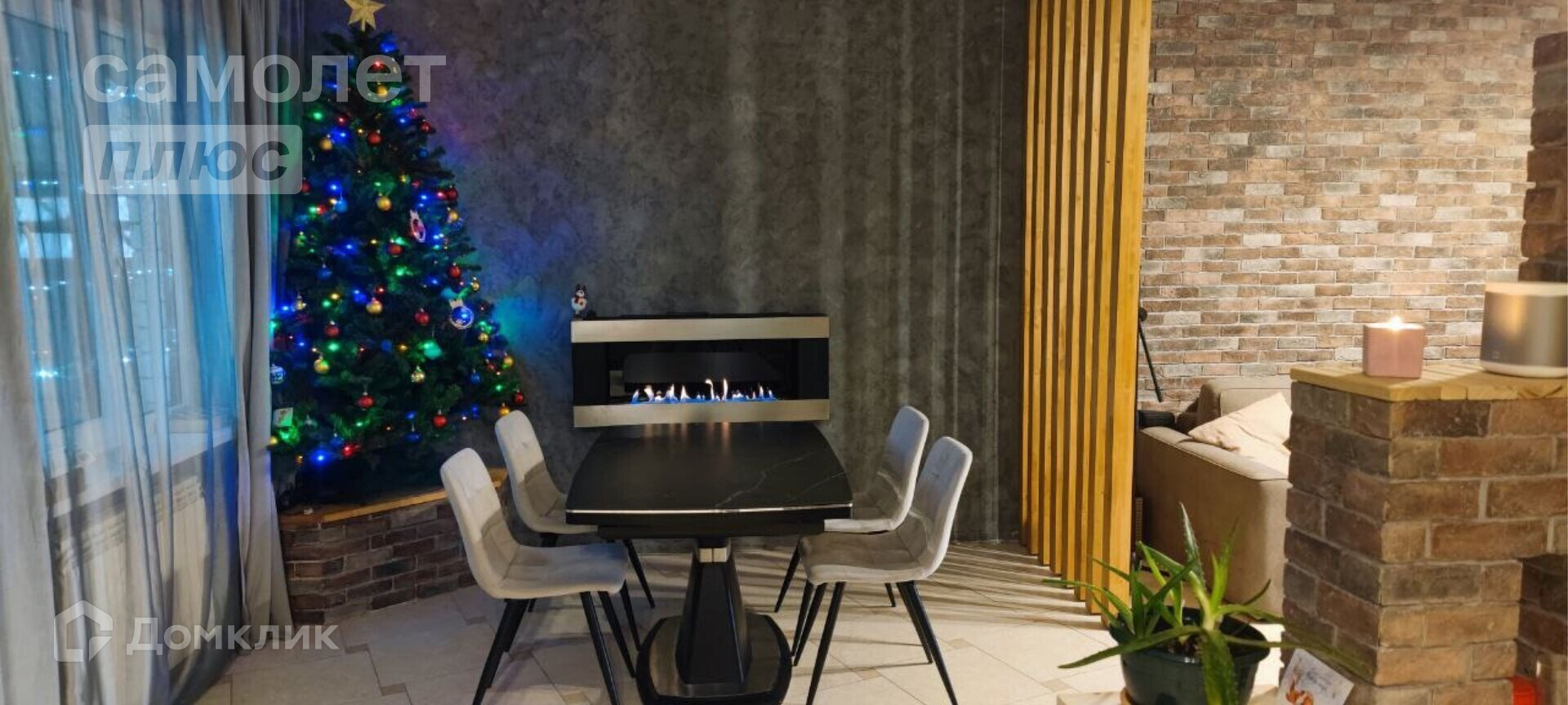 В столовой большой раздвижной стол с керамогранитной столешницей, мягкие стулья, биокамин. В гостиной диван 3,3 метра, большой телевизор самсунг 65 дюймов, саундбар, навесная тумба. Стены из декоративного кирпича и реек из ясеня. Скрытая дверь в спальню (площадь спальни 14,1 кв.м.)