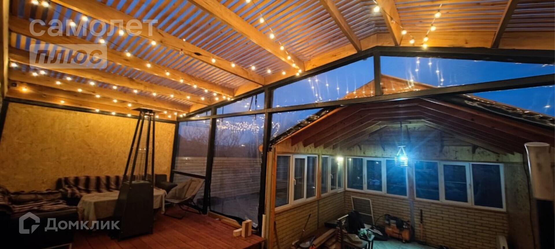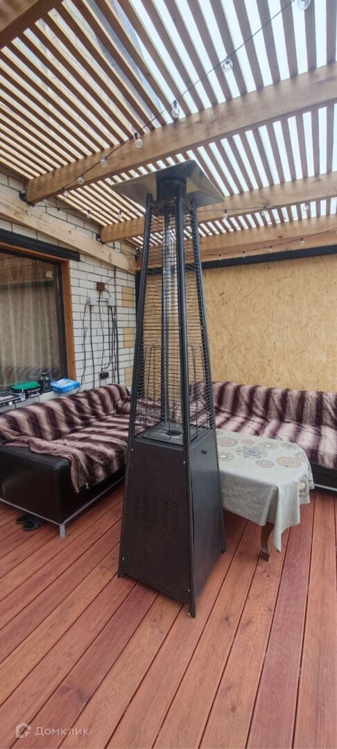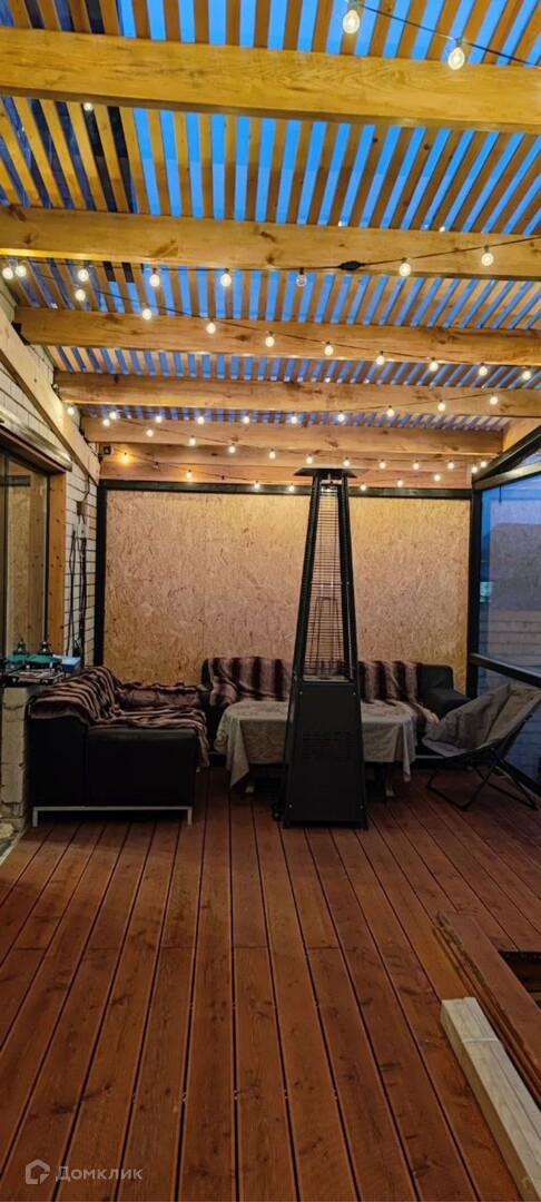 Выход из гостиной на террасу, которая выполнена в 2-х уровнях: на верхнем уровне уложена террасная доска из лиственницы и реечная крыша, зона отдыха с 2-мя кожаными диванами, столом и уличным газовым инфракрасным обогревателем, на нижнем уровне уложена плитка - планировалась зона с очагом. Терраса выполнена на 95%.