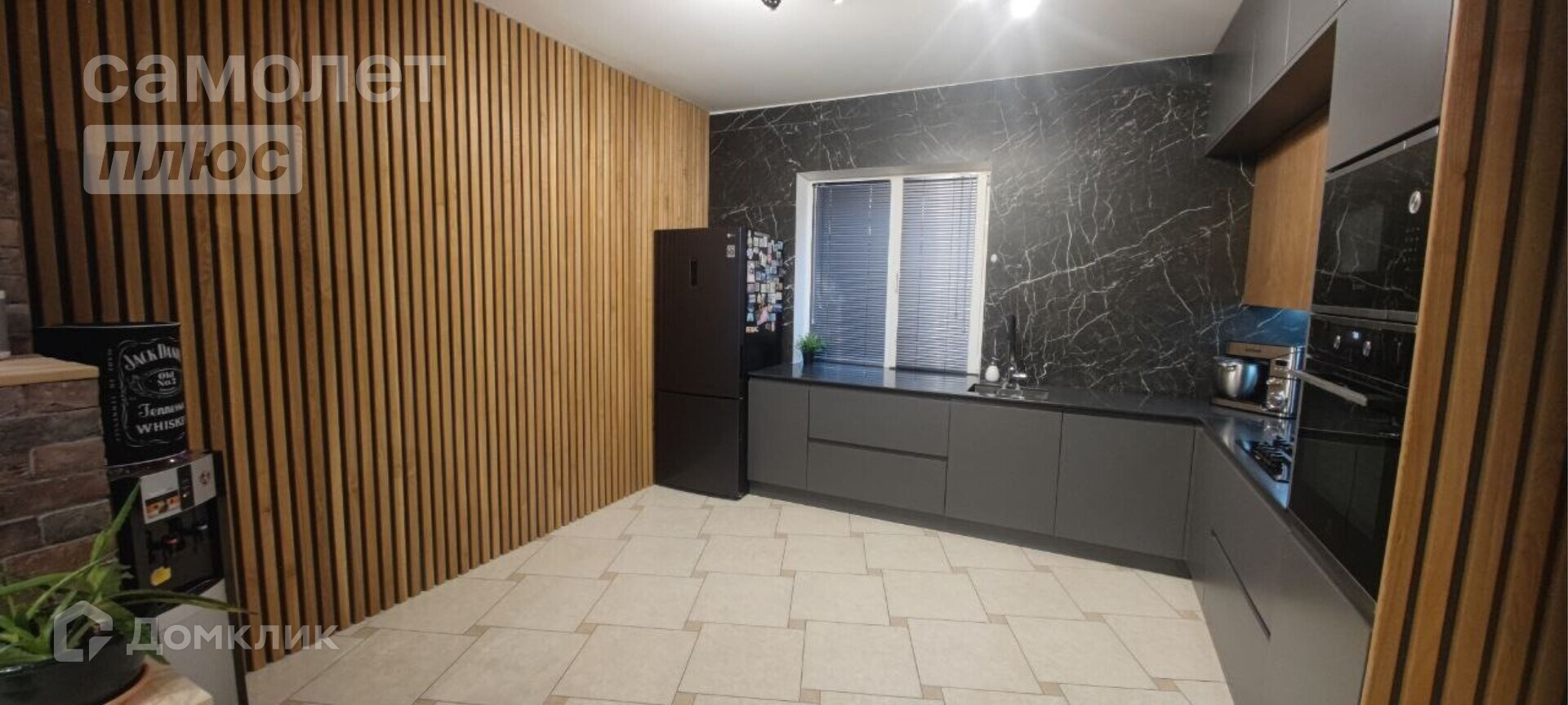 1 этаж: большая ванная комната 10 кв.м с душевой кабиной и большой ванной. Огромная кухня-гостиная 40 кв.м. с дизайнерским ремонтом, на стенах рейки из натуральной дорогой породы дерева - массива ясеня.