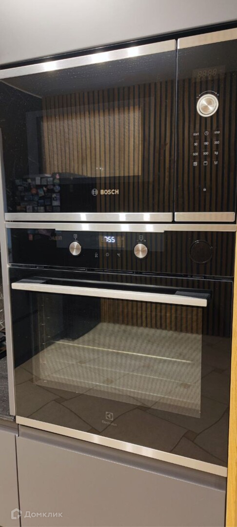 Премиальная качественная кухня: фасады - эмаль и шпон ясеня, фартук и стена из керамогранита, столешница из акрилового камня, качественная встраиваемая техника: микроволновка и варочная панель газовая Воsсh, духовка и посудомойка Еlесtrоluх, большой холодильник LG, мощная вытяжка.