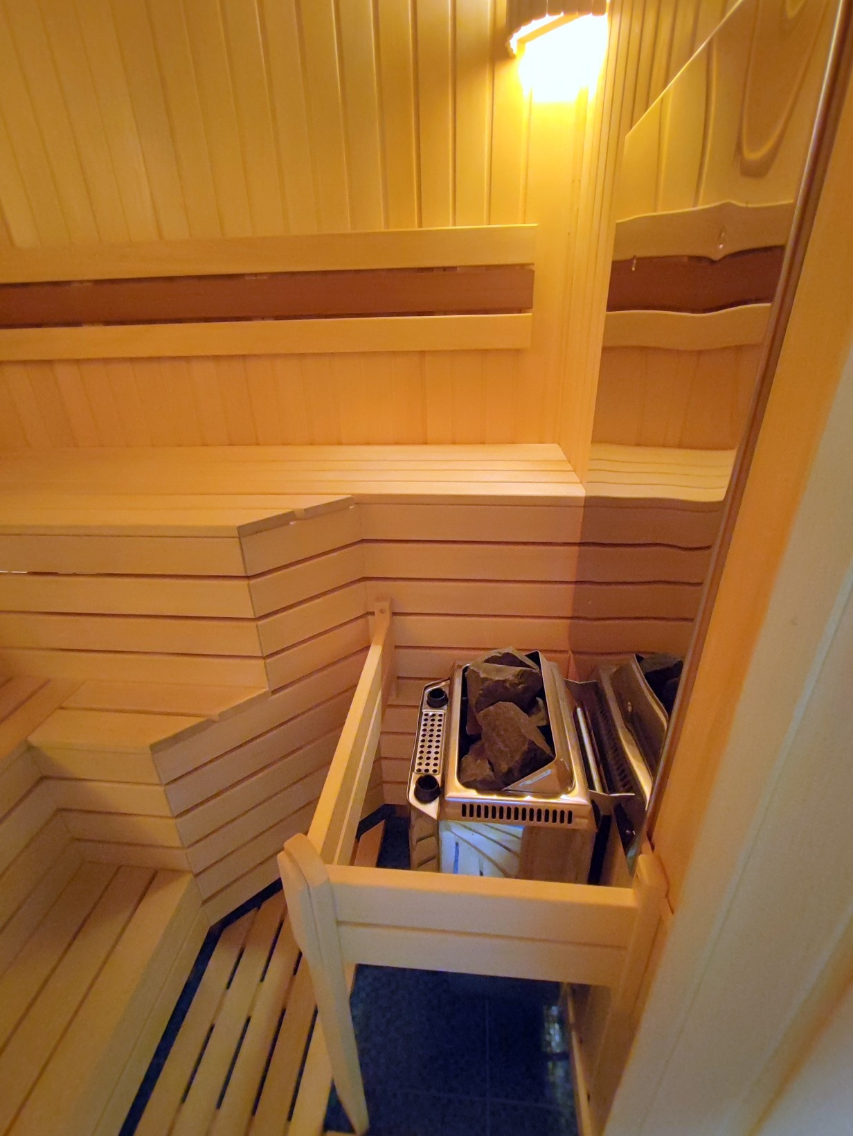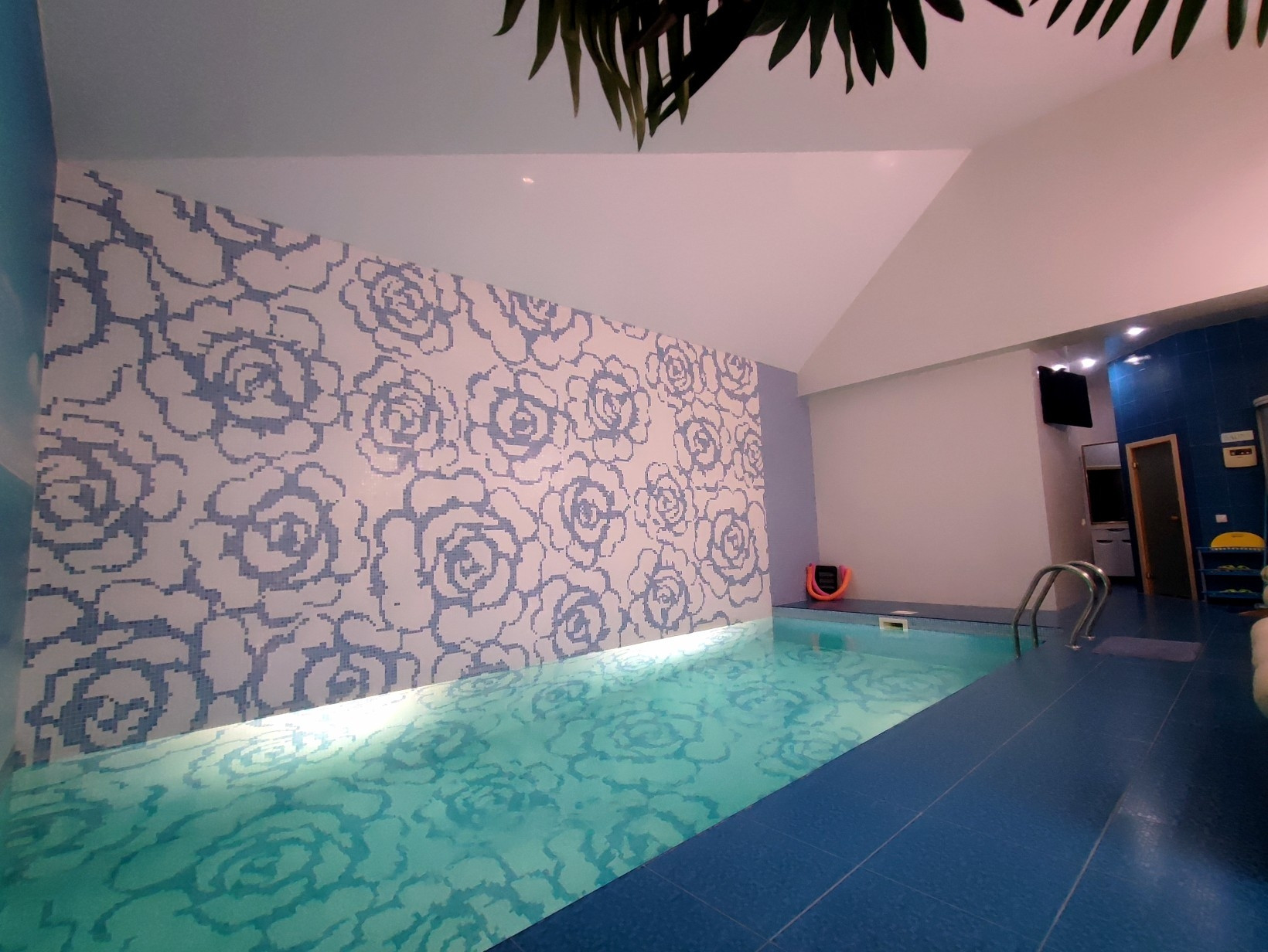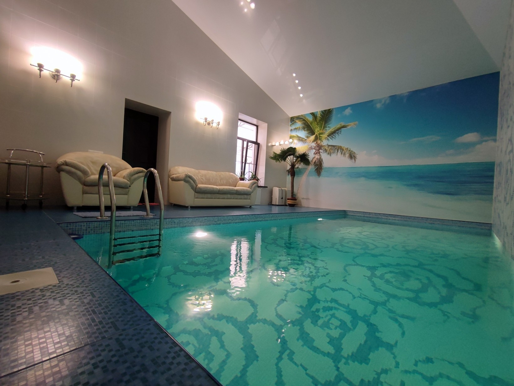 Первый этаж – каминный зал с «Французским камином», Финской кожаной мебелью и «вторым светом» - высотой потолков 9 метров, кухня – гостиная с выходом на закрытую террасу, кабинет, спальня, бассейн отделанный итальянской мозаикой, сауна с финским паронагревательным оборудованием.