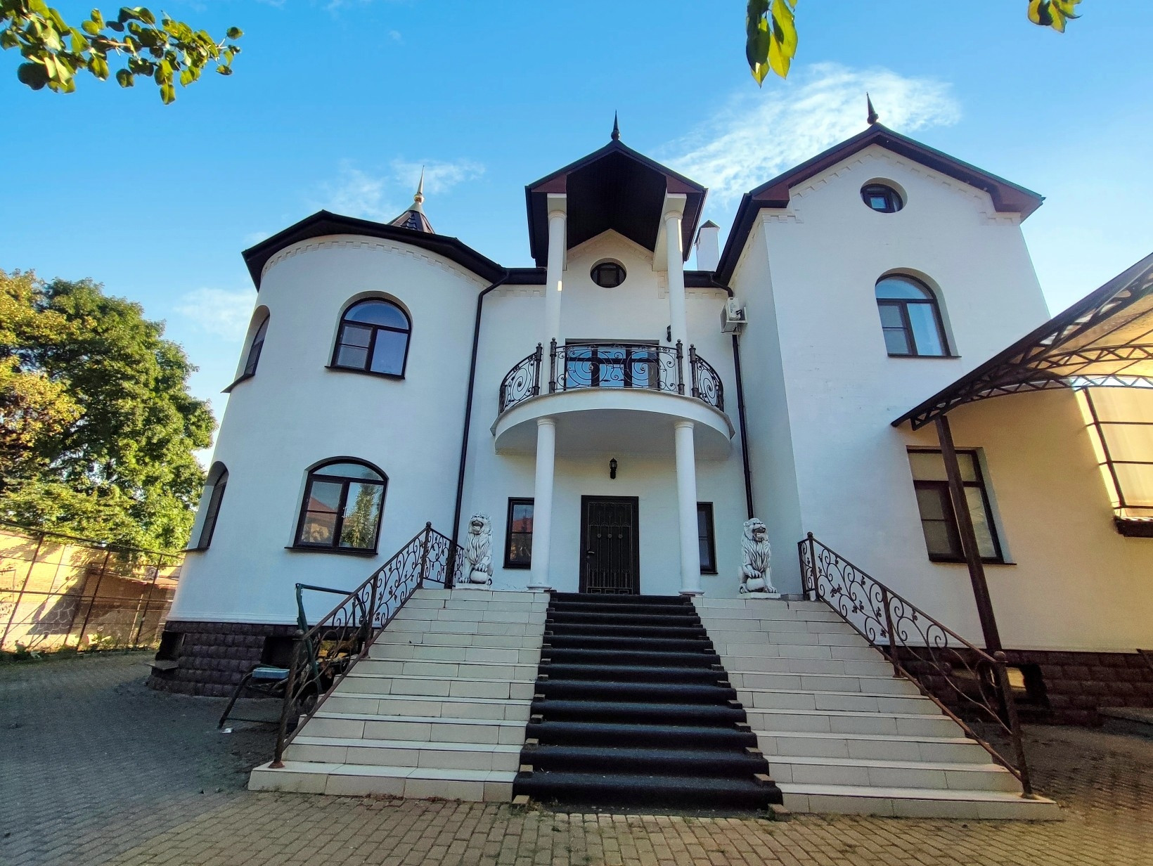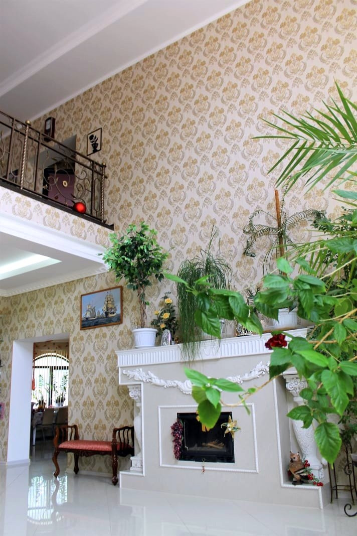 Сам дом (4 уровня) выполнен из красного кирпича отделан дагестанским камнем. Ширина стен 65 см. Так же на территории имеется небольшой автономный домик (для охраны)