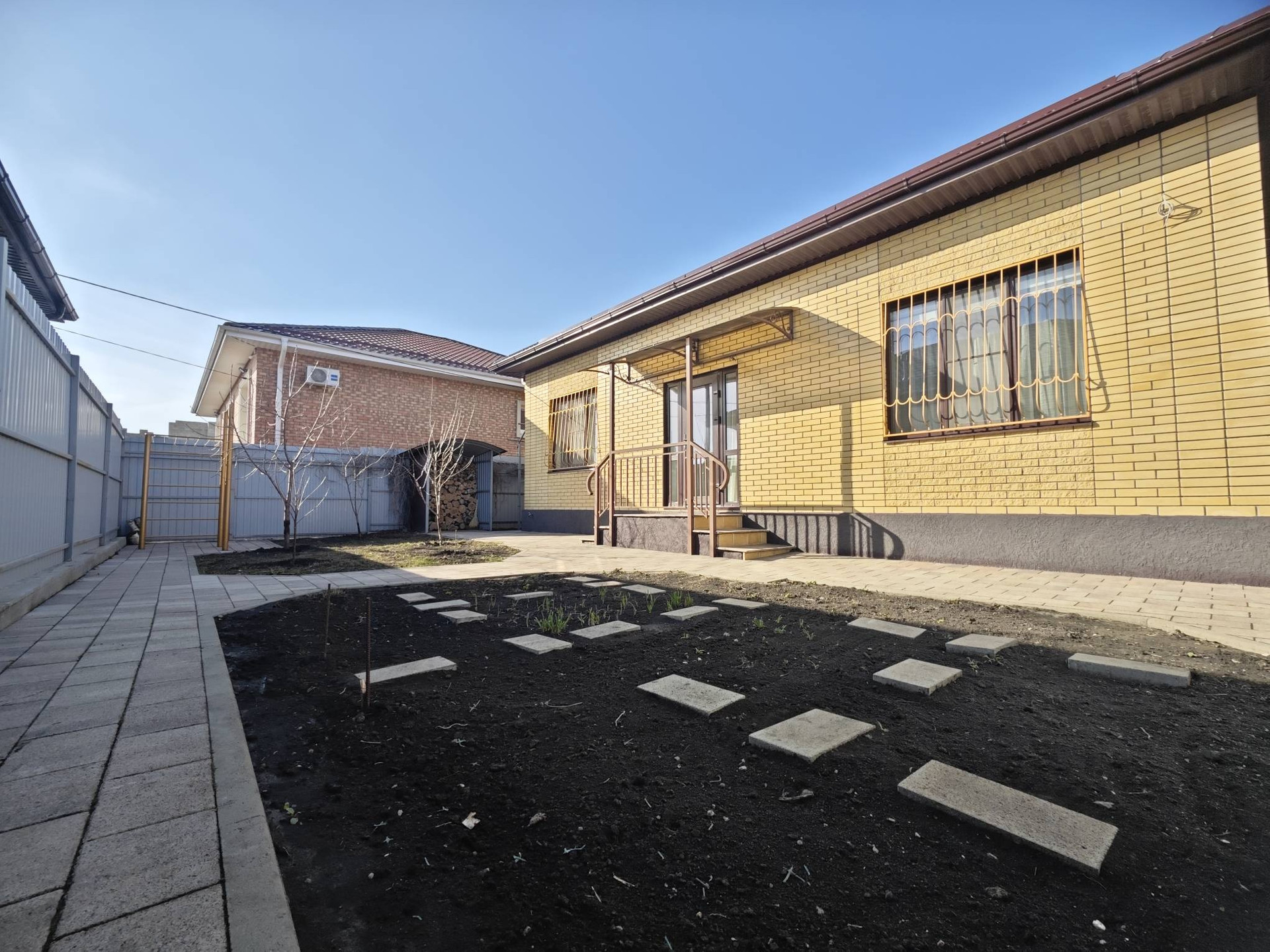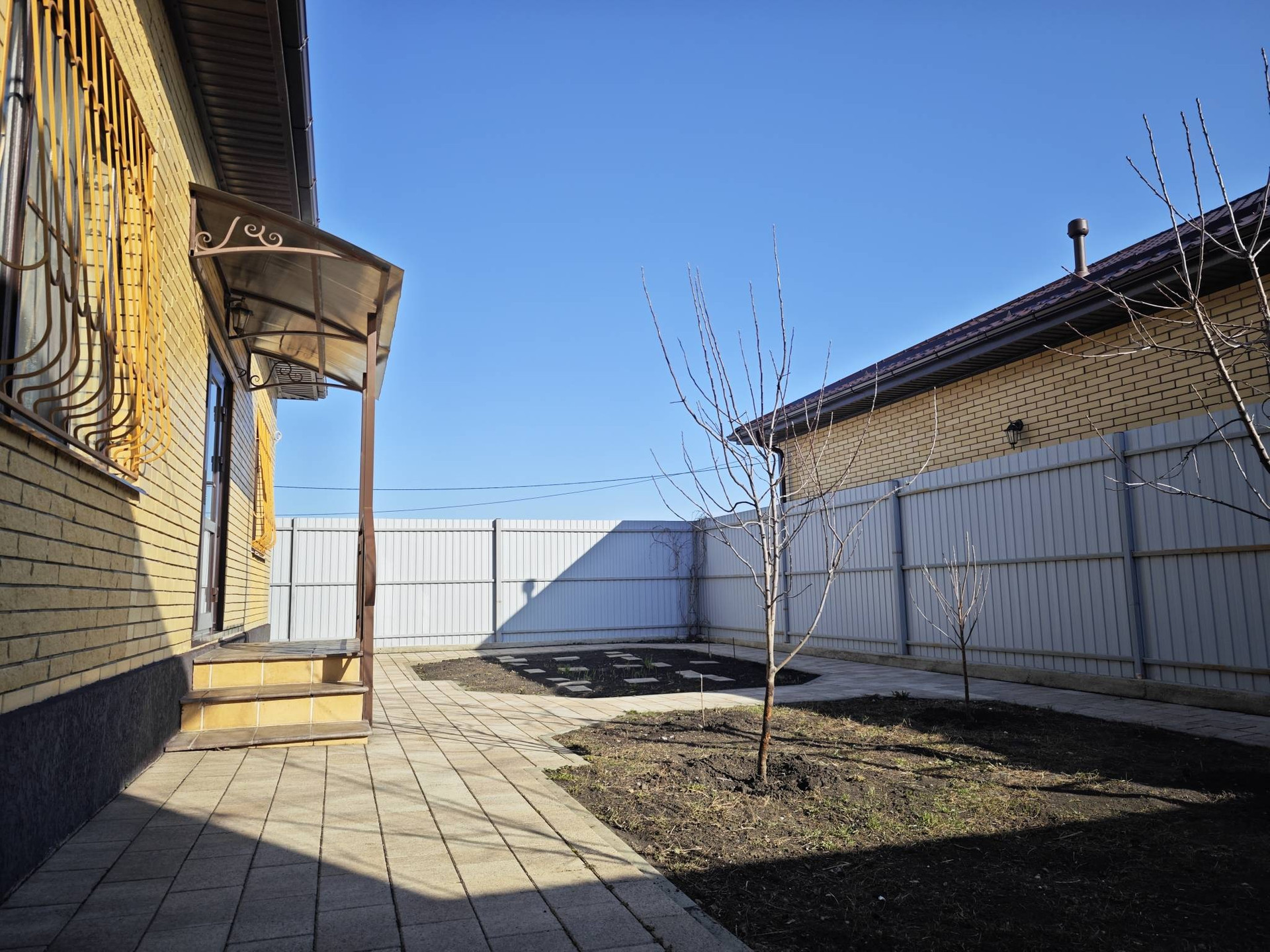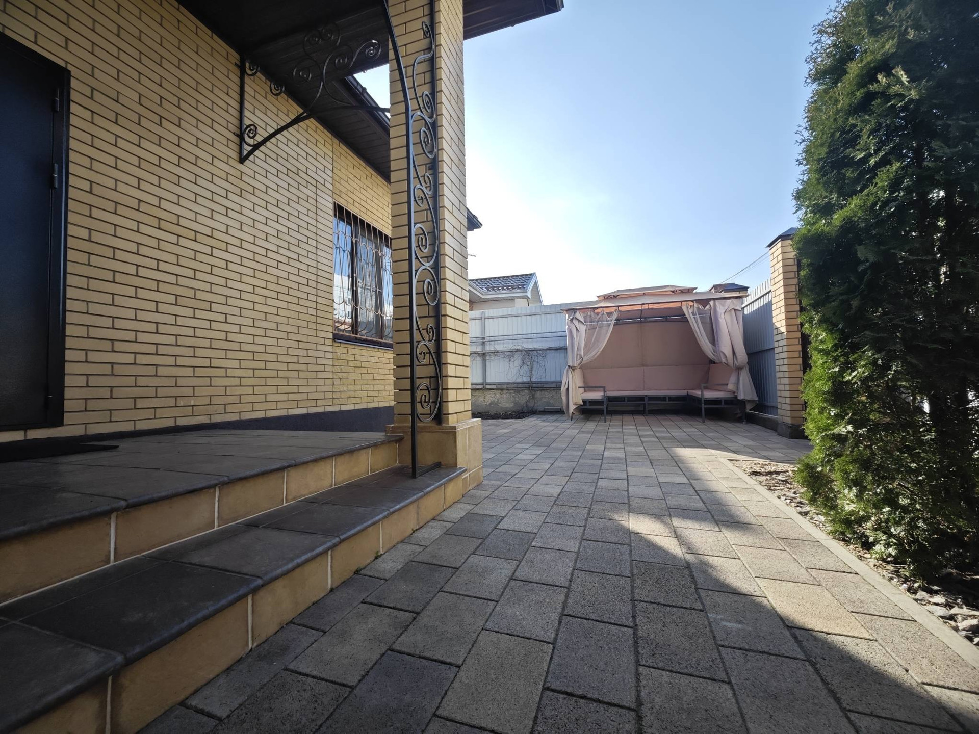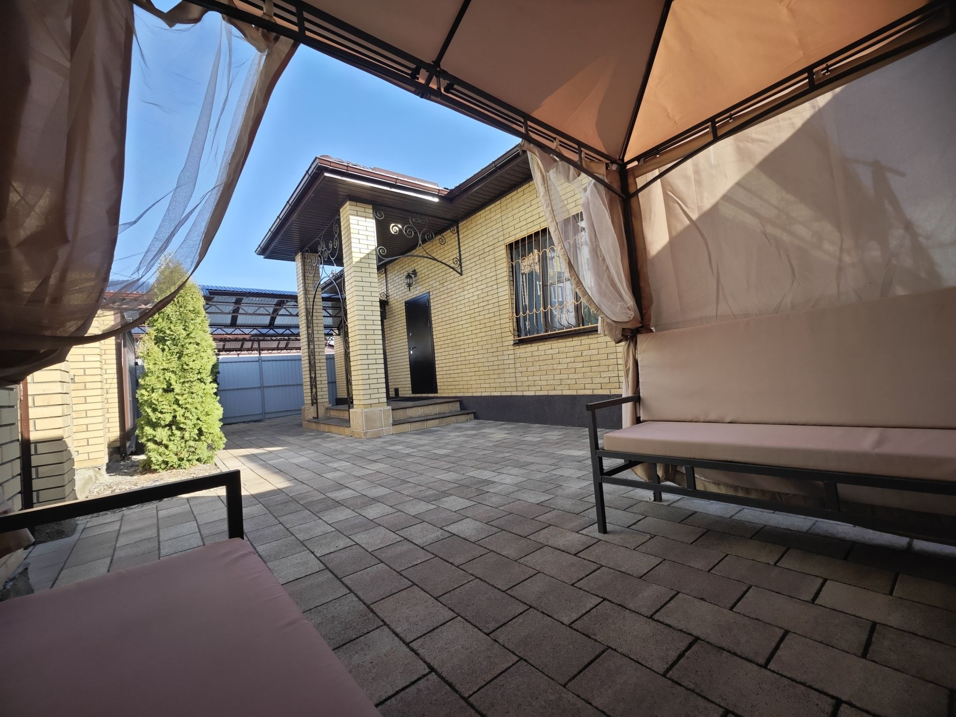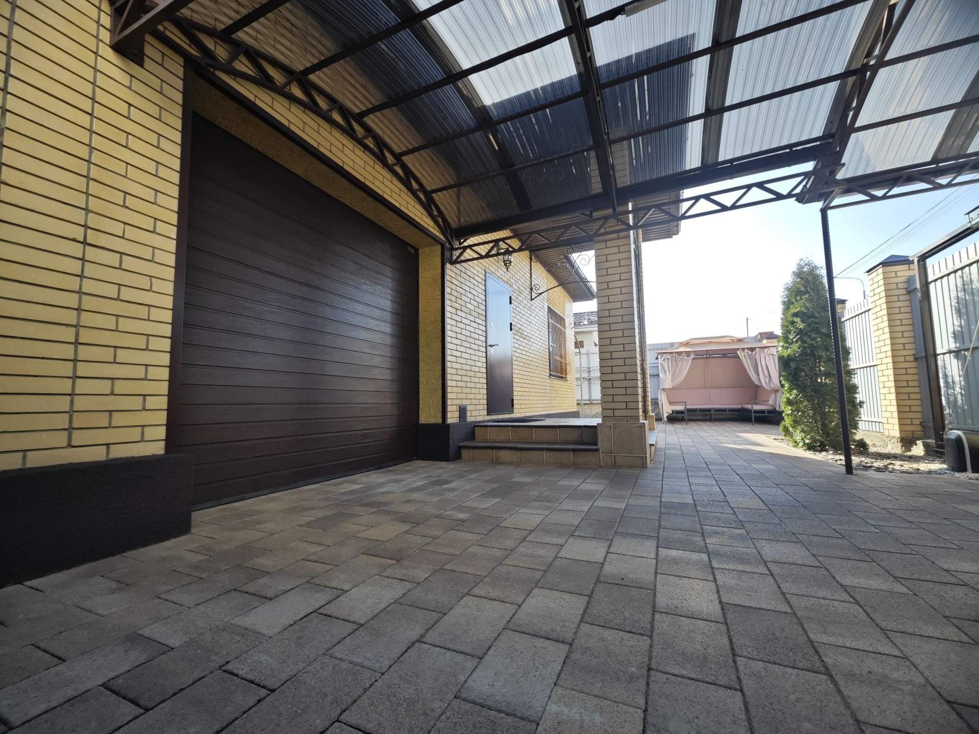 Во дворе установлен навес для автомобиля, мангальная зона, дворовое освещение по периметру.