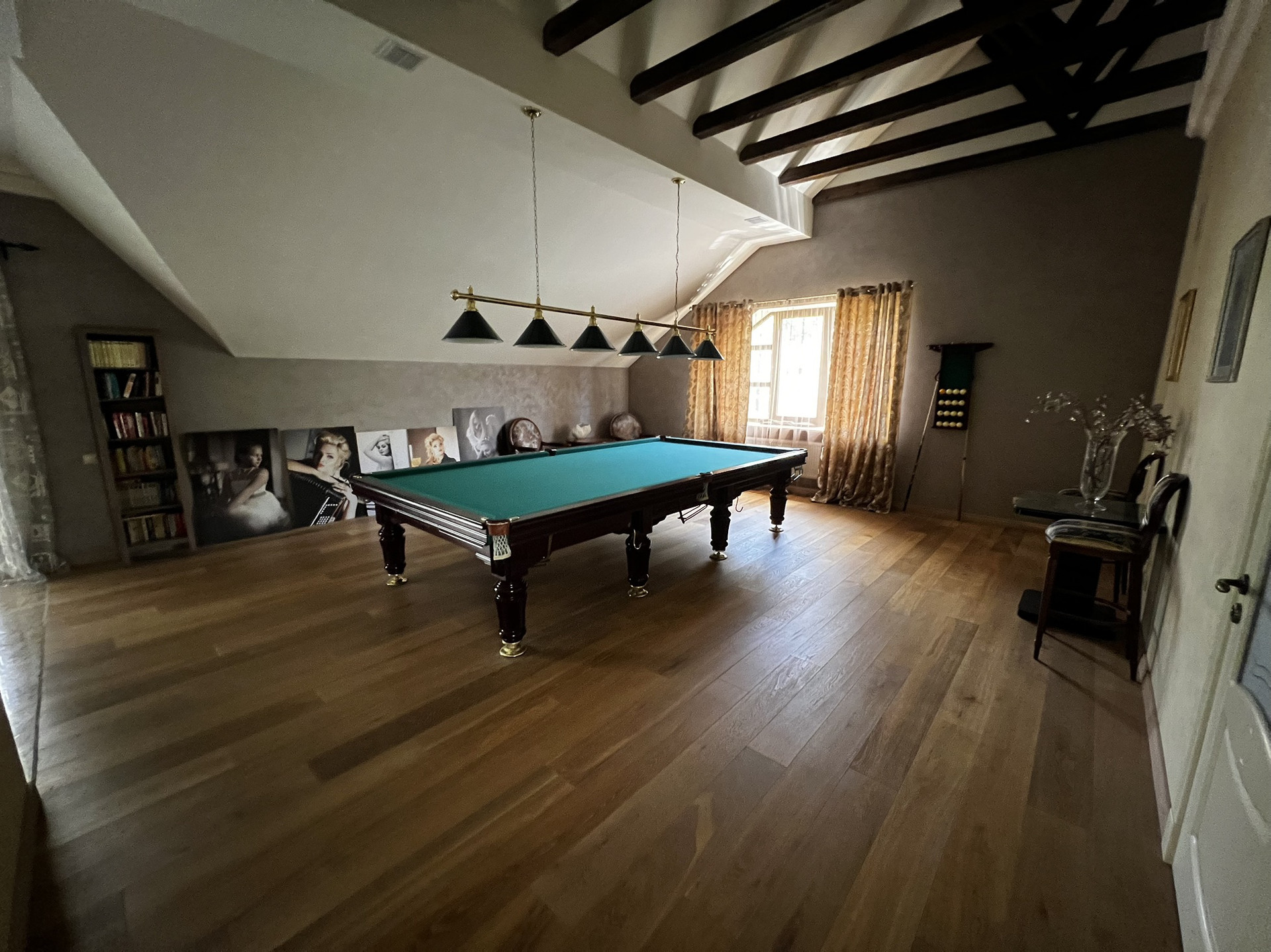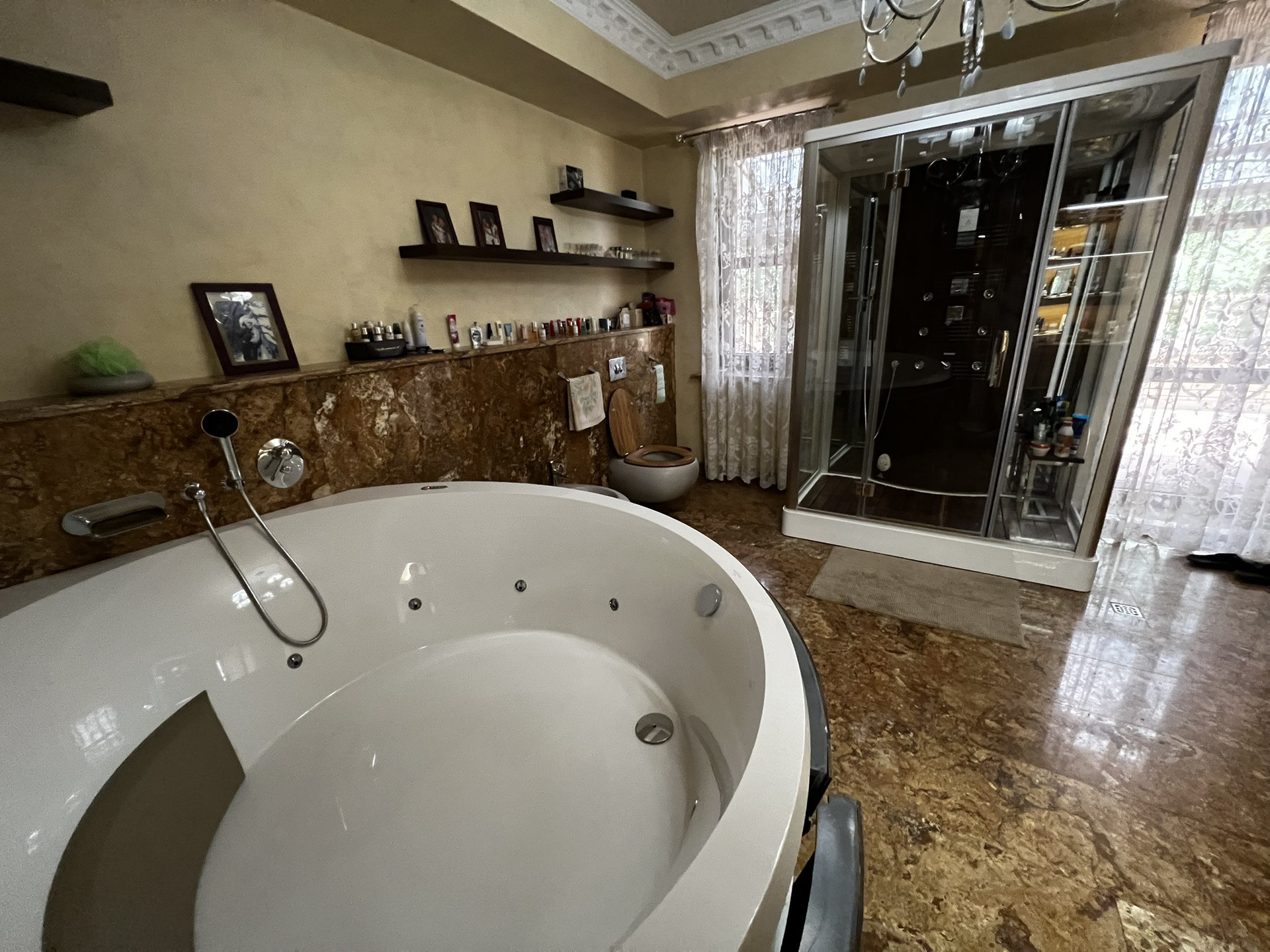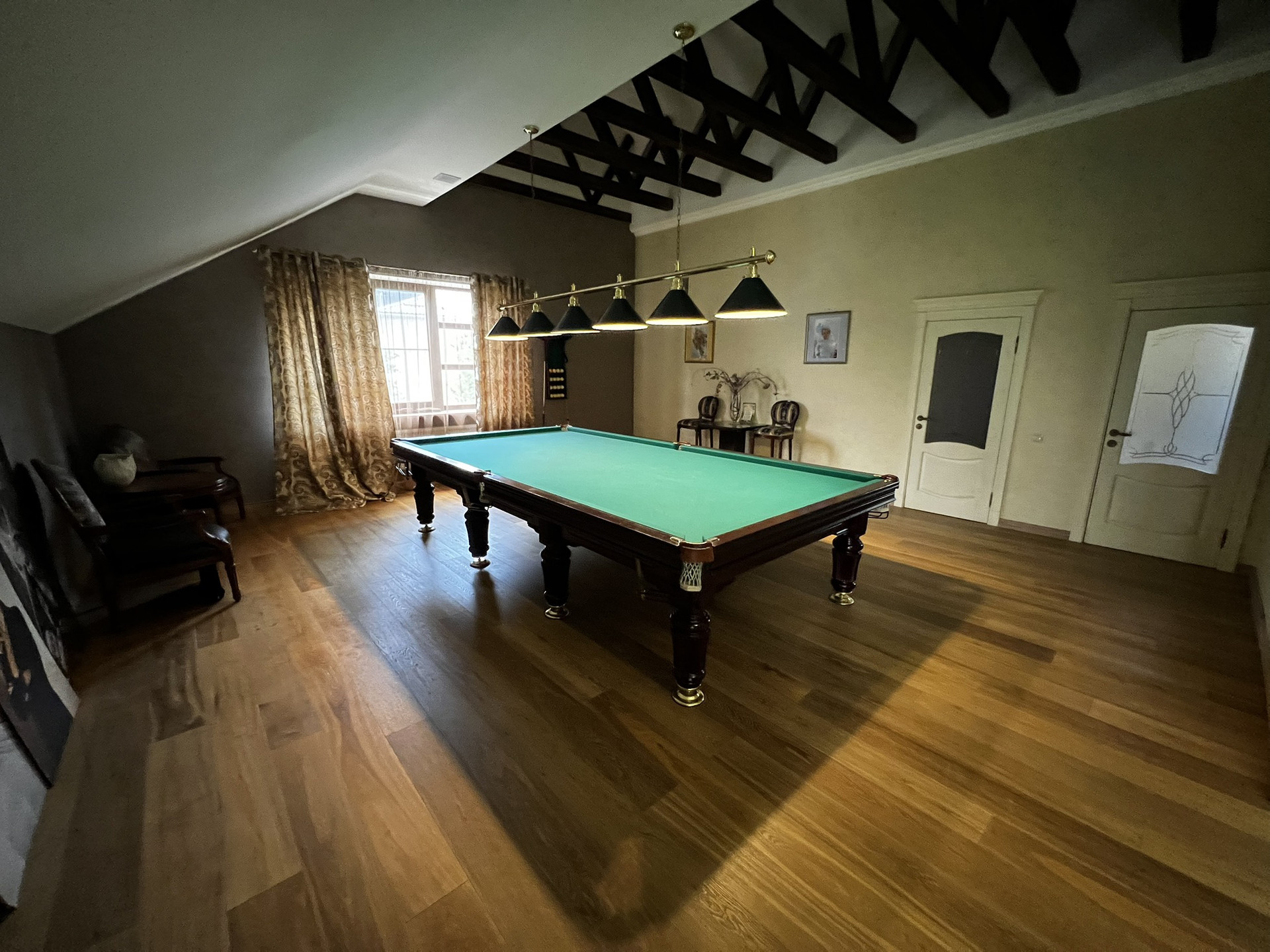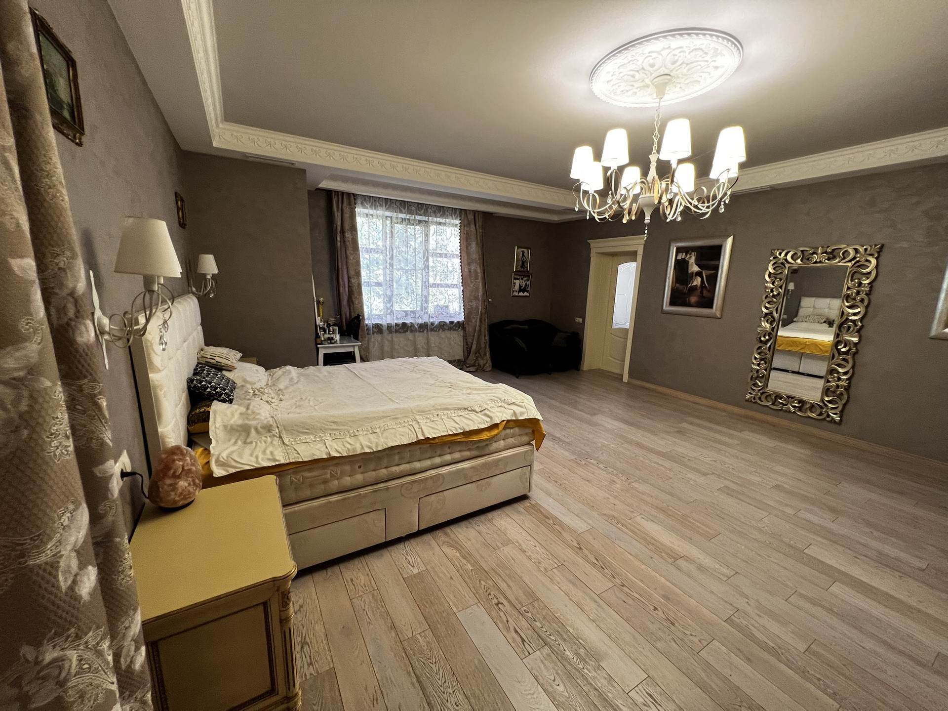 Центральным парком культуры и отдыха. Очень удобное расположение. Можно в центре ходить пешком. Сад, 2 летних веранды, мангал, лифт, камин, бассейн, сауна. 5 с/у, 2 зала, алюминиевые анодированные двухкамерные окна произ-ва Турция, Сантехника villeroy&boch, в том числе джакузи. Полностью мебелирован. Мебель производства Италии.