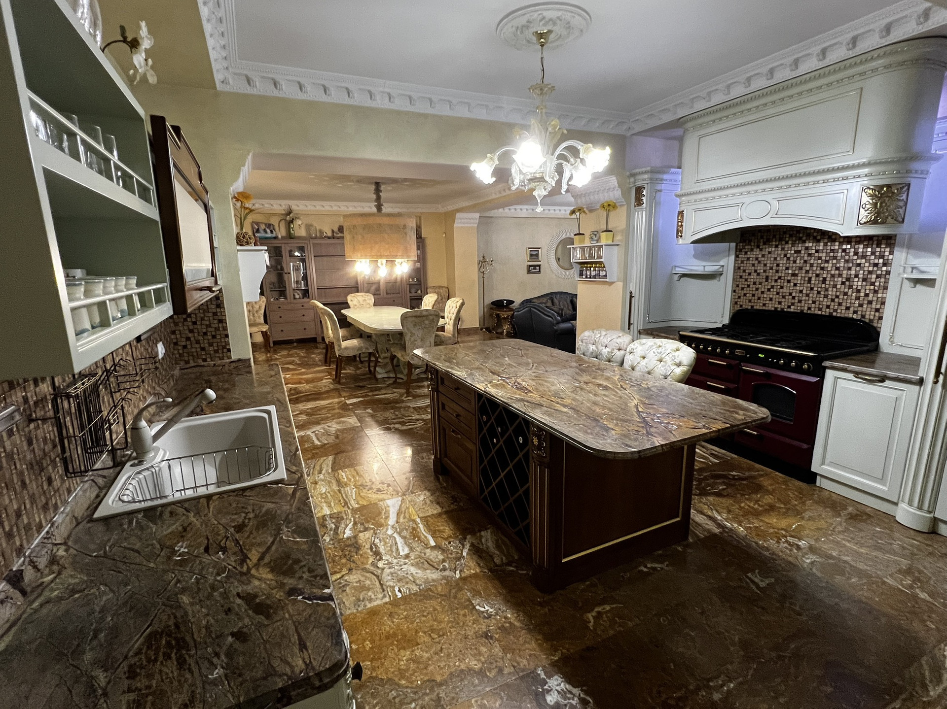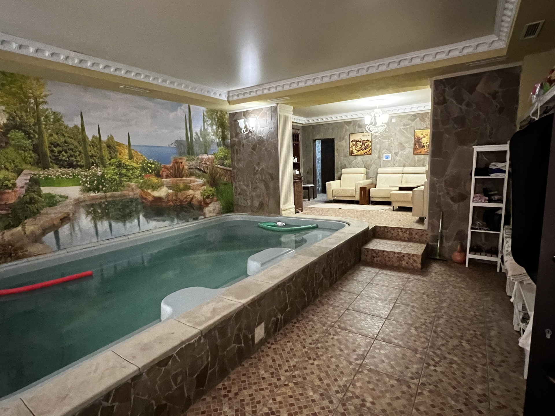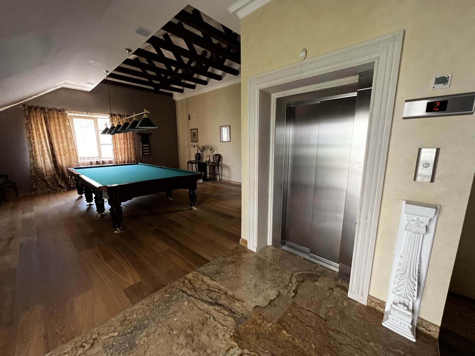 Лифт итальянский Отис на 5-6 человек. Камин французский с лифтом. Зона барбекю полностью оборудована. Двор выложен гранитом. Имеется волейбольная площадка, спортивная, теннисный стол, батут. Кухня Мартини (Италия). Полы из травертина с ониксом и массива паркетной доски. приточно-вытяжная вентиляция проведена в доме. Гараж на з машины. Комната караоке и 2 комнаты для хранения продуктов. Русский бильярд.