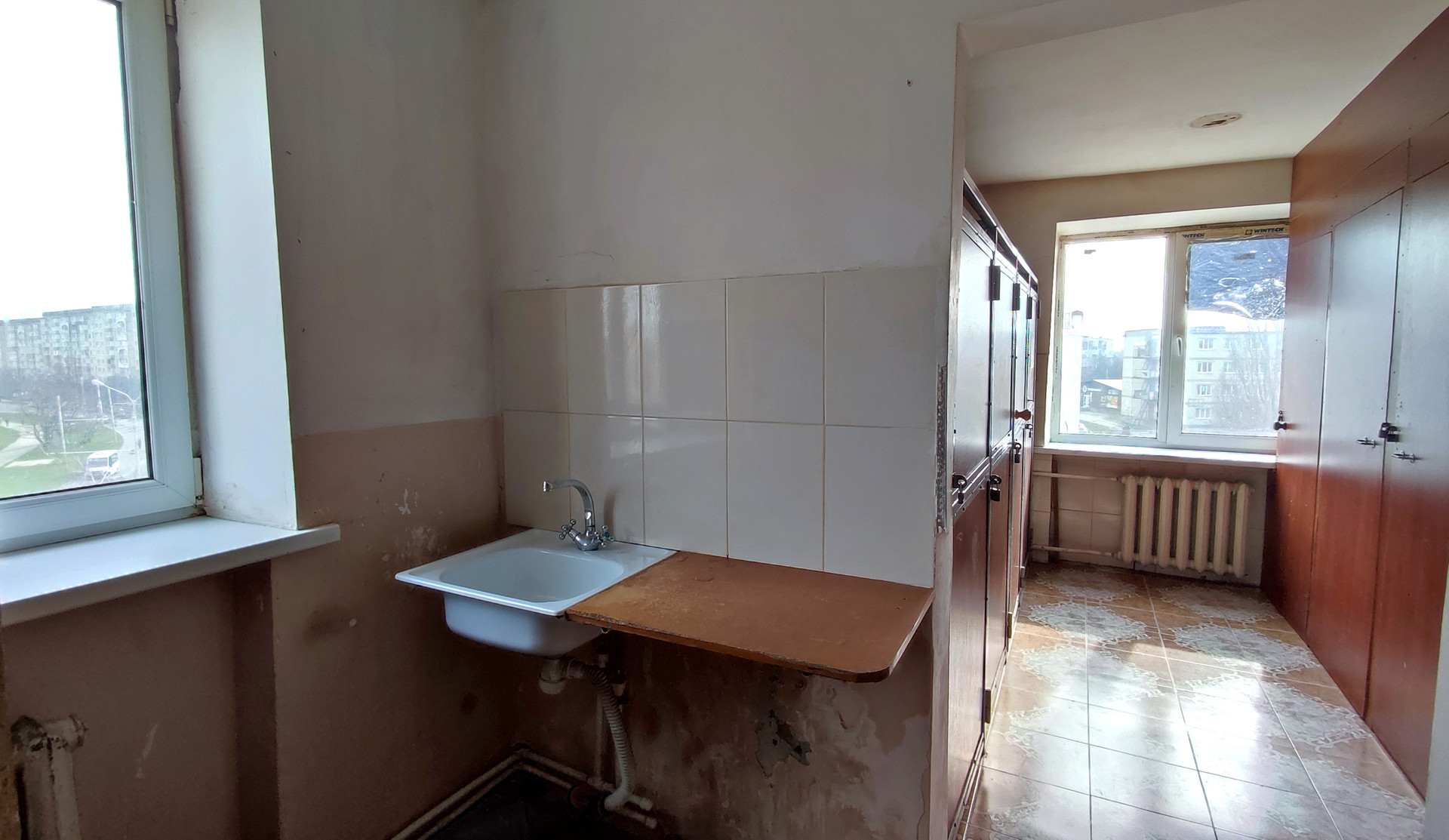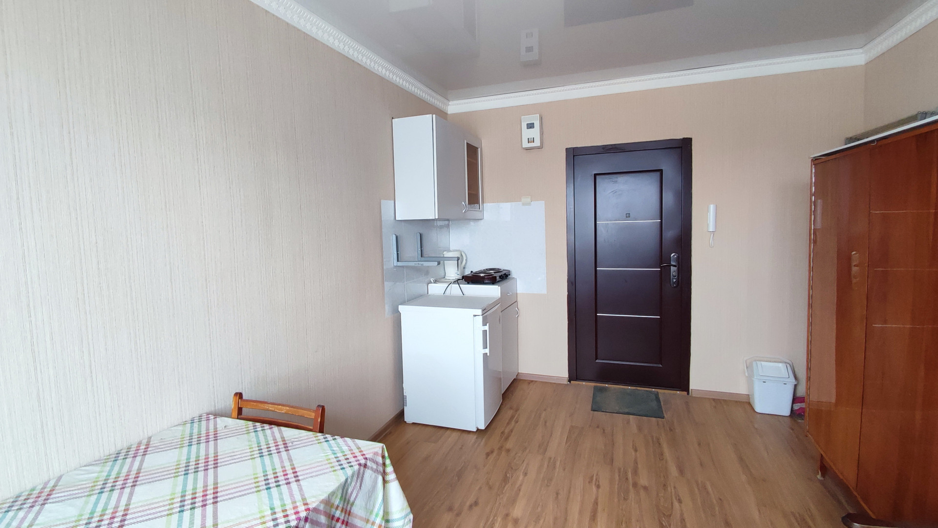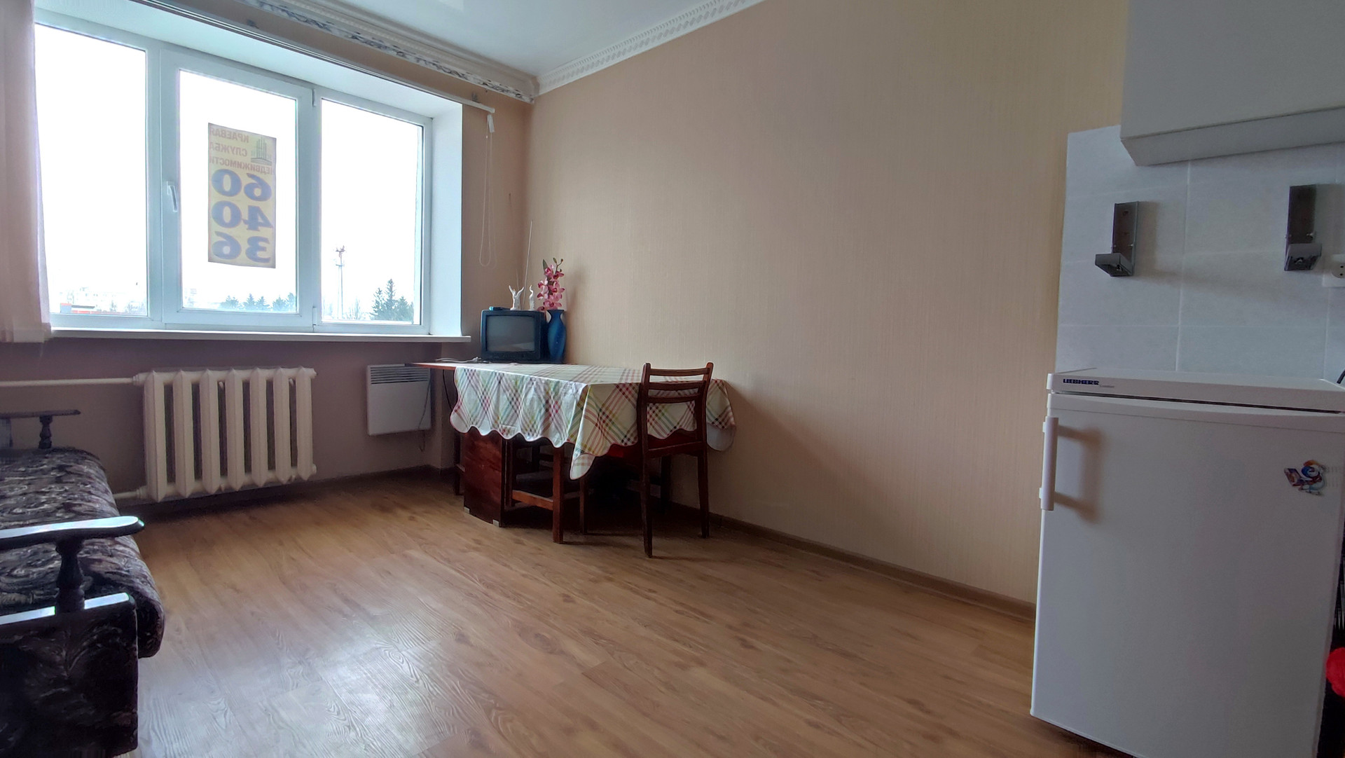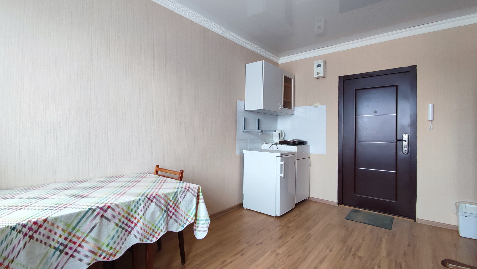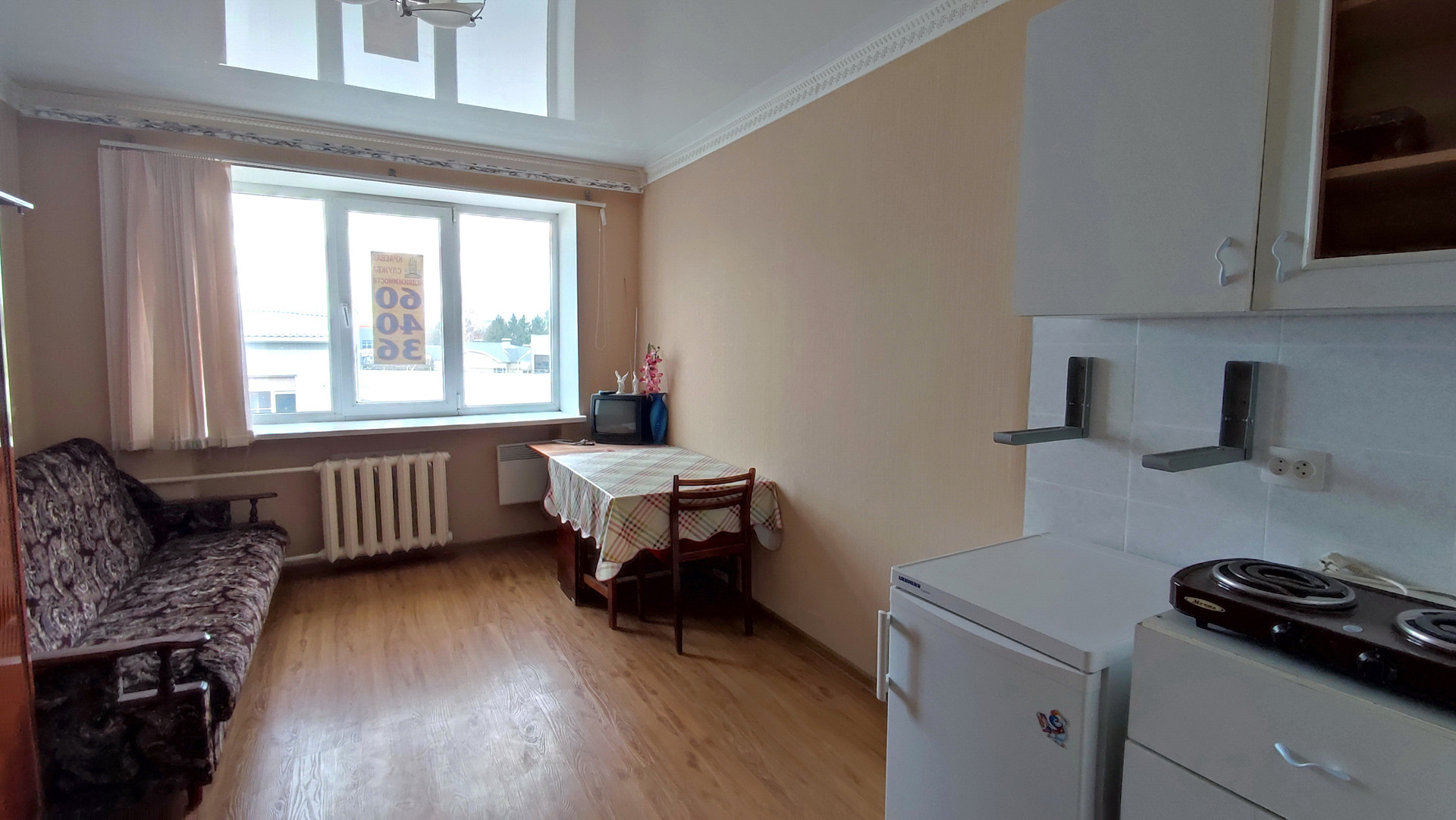 Комната очень светлая, с ремонтом: ламинат, светлые обои, натяжной потолок, окно ПВХ, хорошая входная дверь.