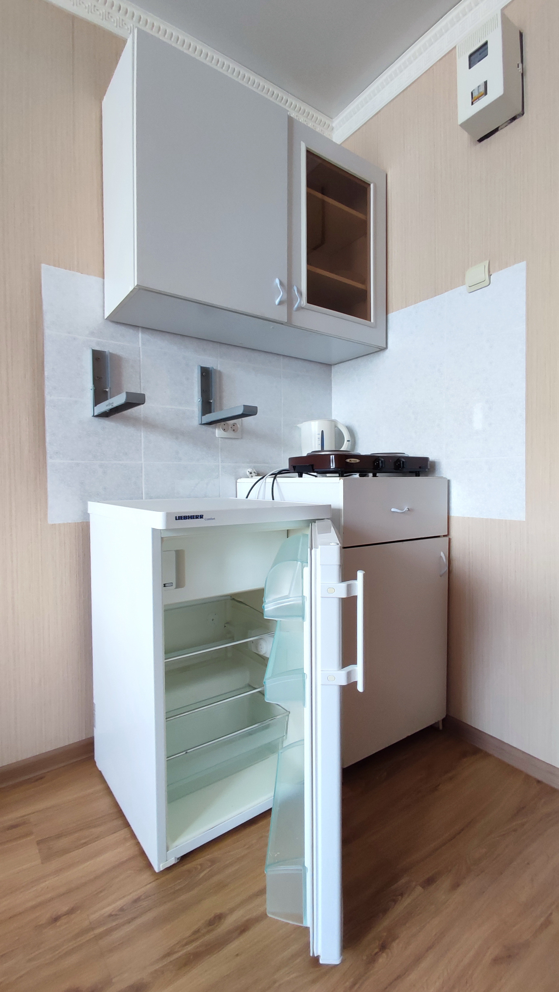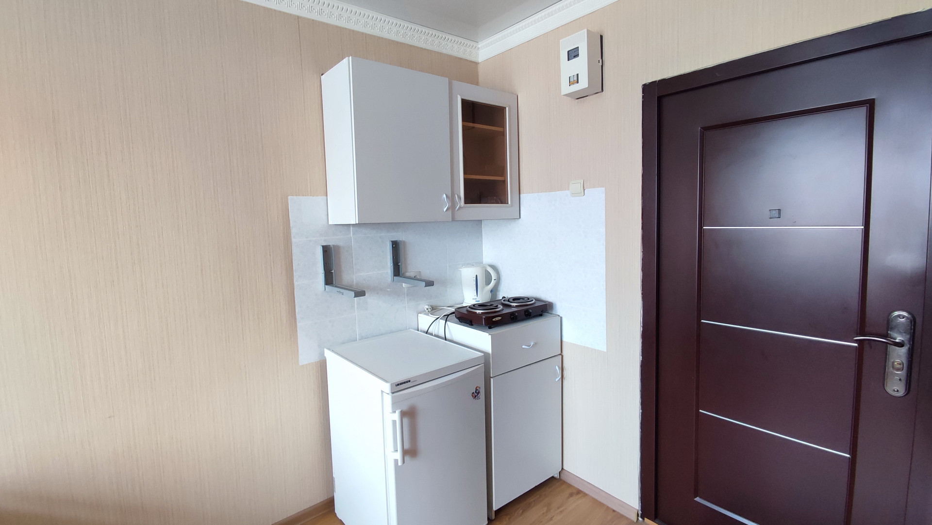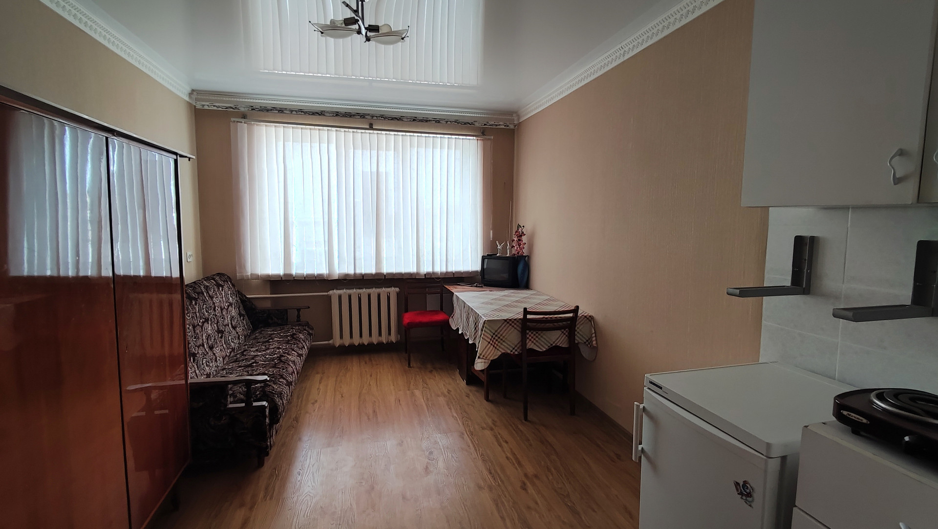 В комнате остается все необходимое для комфортного проживания: диван, стол и стулья, шкаф, кухонный уголок, холодильник, плита.