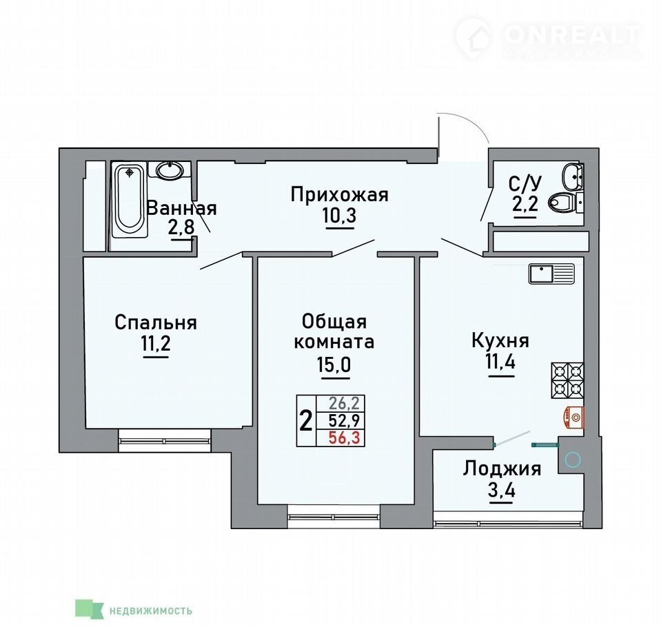 Общая площадь 56.3 м2