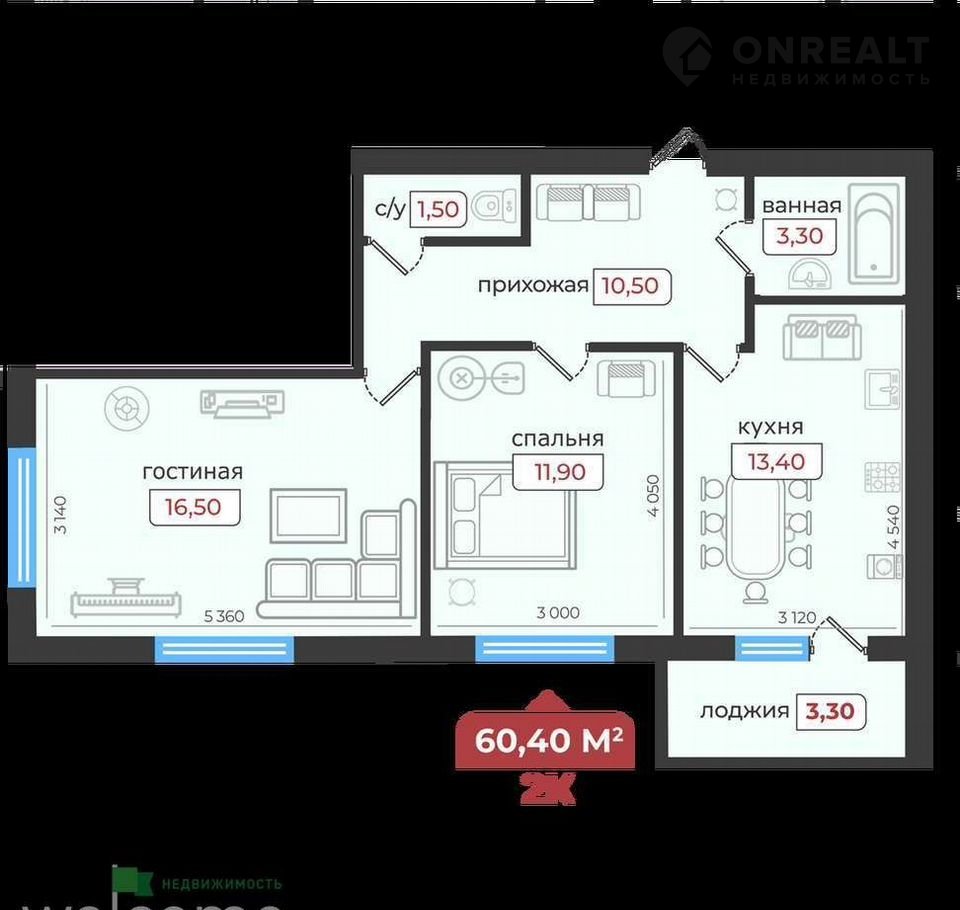 Общая площадь 60.4 м2