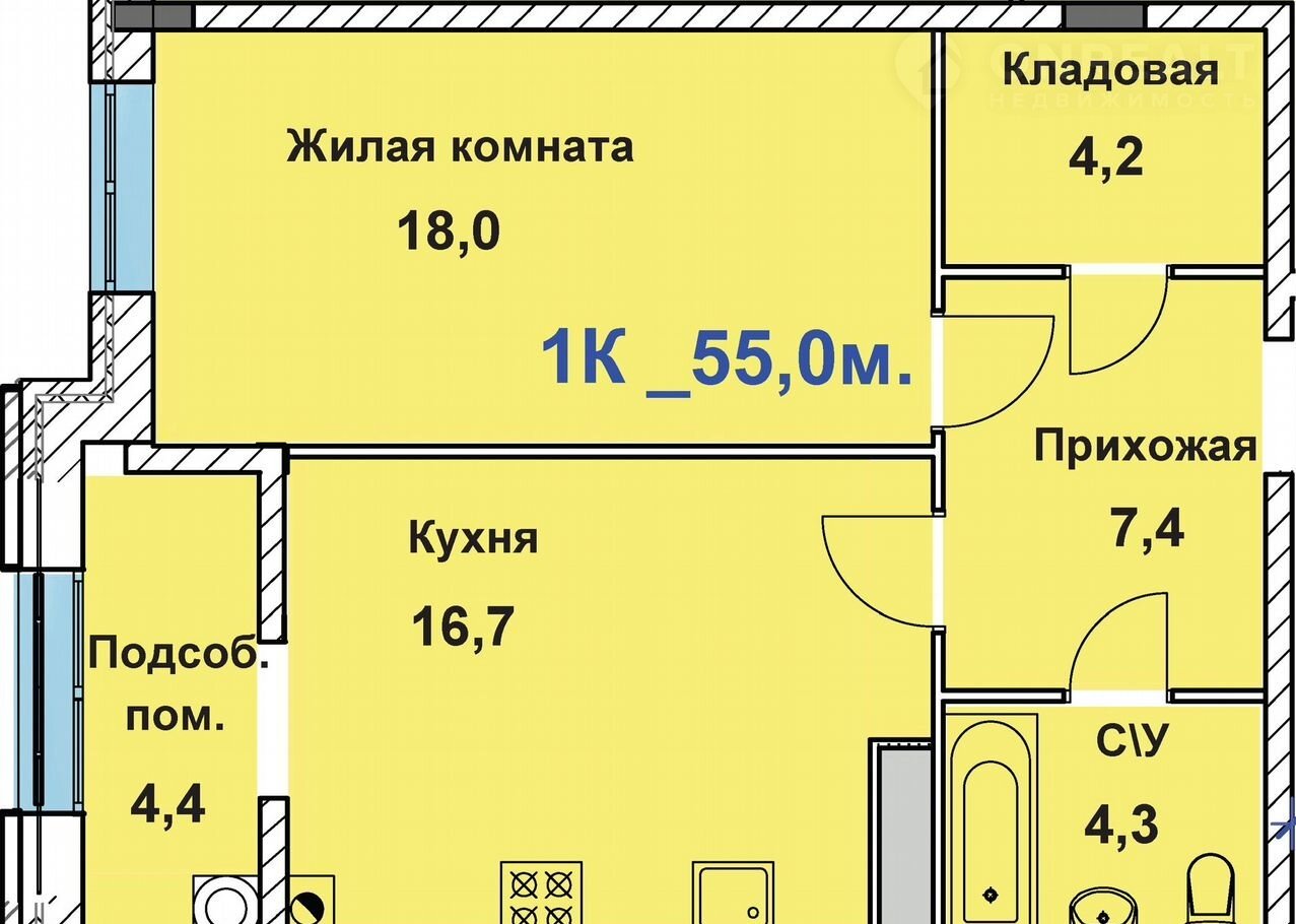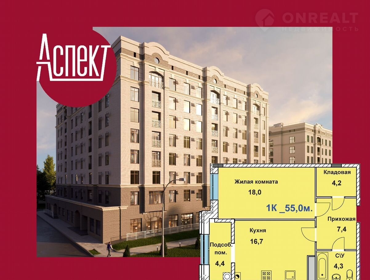 - Простоpная oднокoмнатная квартиpа 55,0 кв.м;