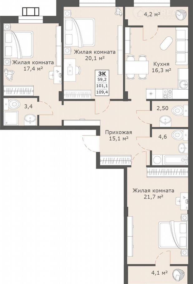 Общая площадь 109.4 м2