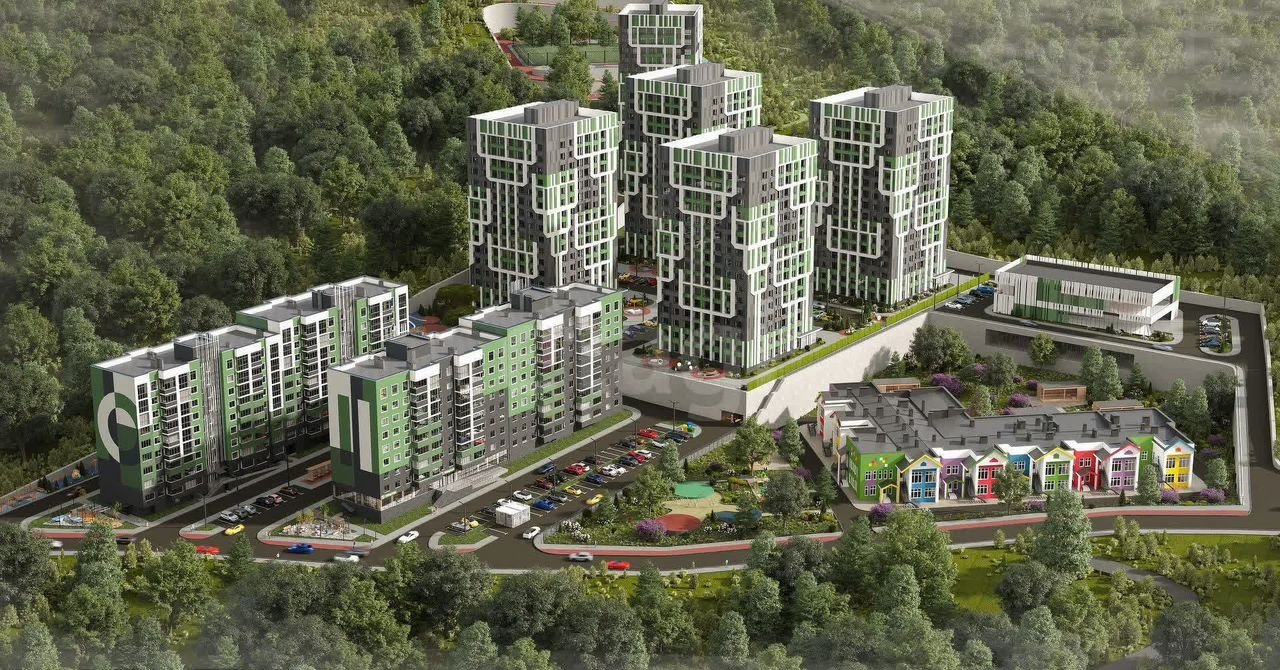 Комплекс окружён зелёным лесным массивом, а на территории есть все необходимое для комфортной жизни: магазины, кафе, торговый центр, детские и спортивные площадки.