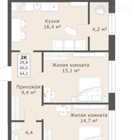 Общая площадь 64.2 м2