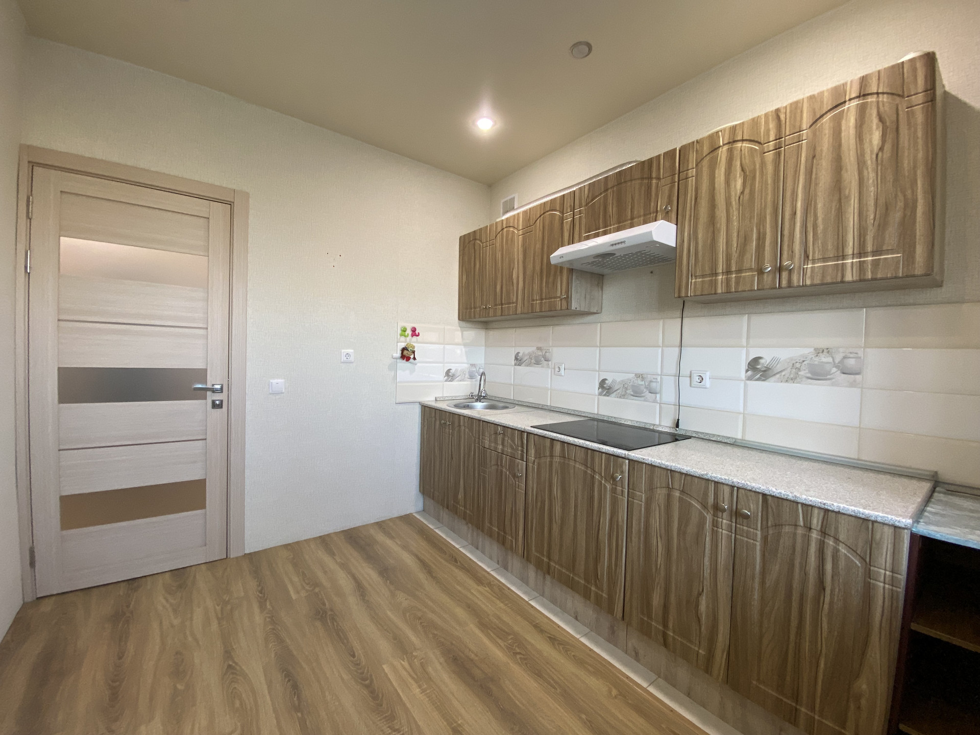 Остается кухонный гарнитур, встроенная техника, шкаф, диван, прихожая, жалюзи.