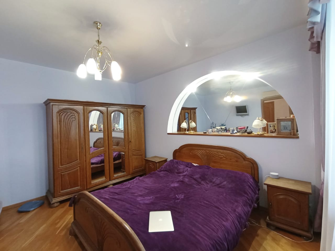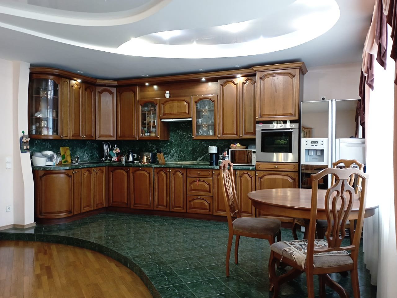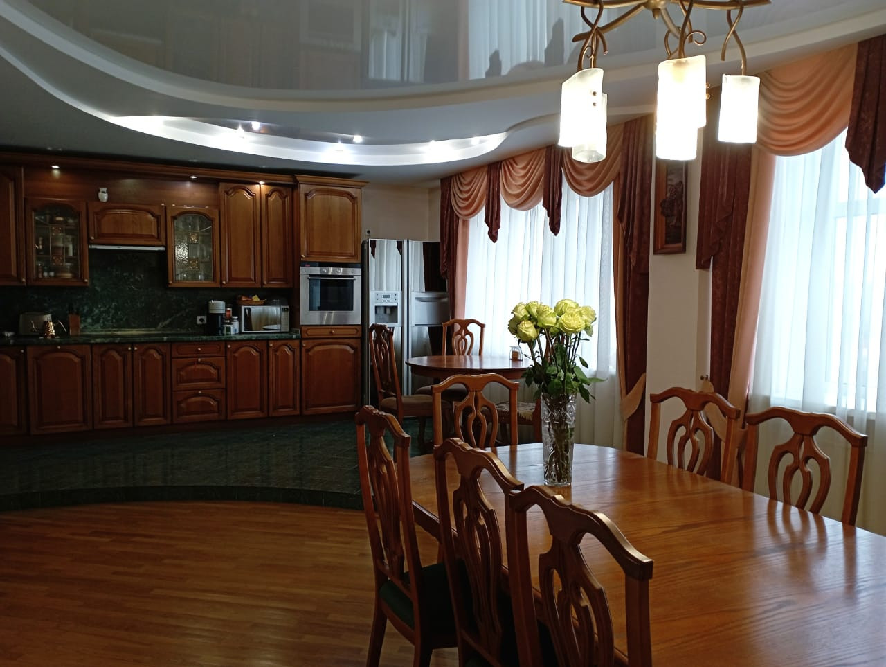 Ремонт выполнен в классическом стиле с использованием исключительно качественных, натуральных материалов - паркет, авторские потолки, выполненные с несколько уровней с достаточным количеством световых точек.