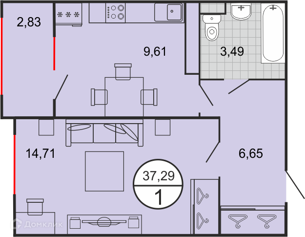 Общая площадь 37.3 м2