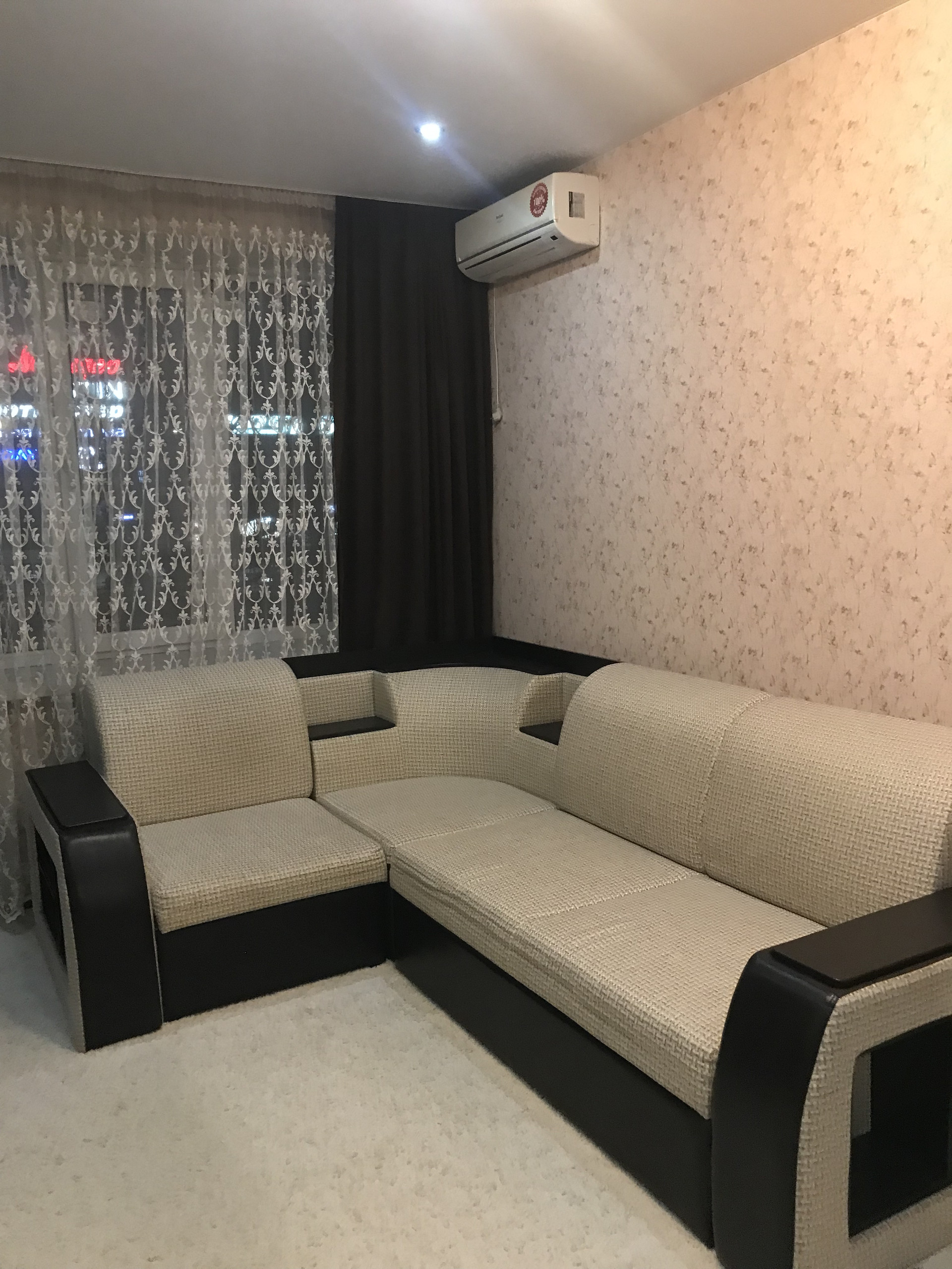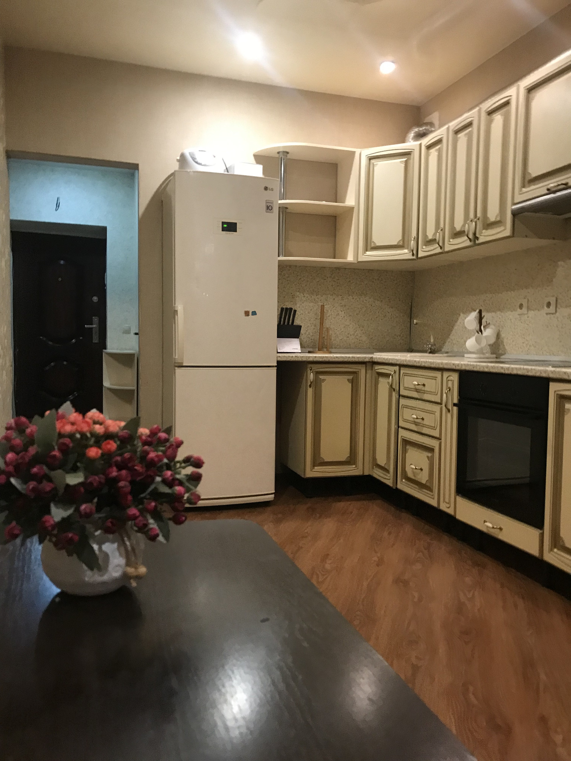 В квартире остаётся много мебели и техники(кухонный гарнитур и обеденный стол, варочная панель, вытяжка, холодильник, мебель в прихожей, горка в комнате, встроенный зеркальный шкаф-купе, угловой-раздвижной диван в комнате, стиральная машина, и даже тюль и портьера остаётся Вам в подарок!