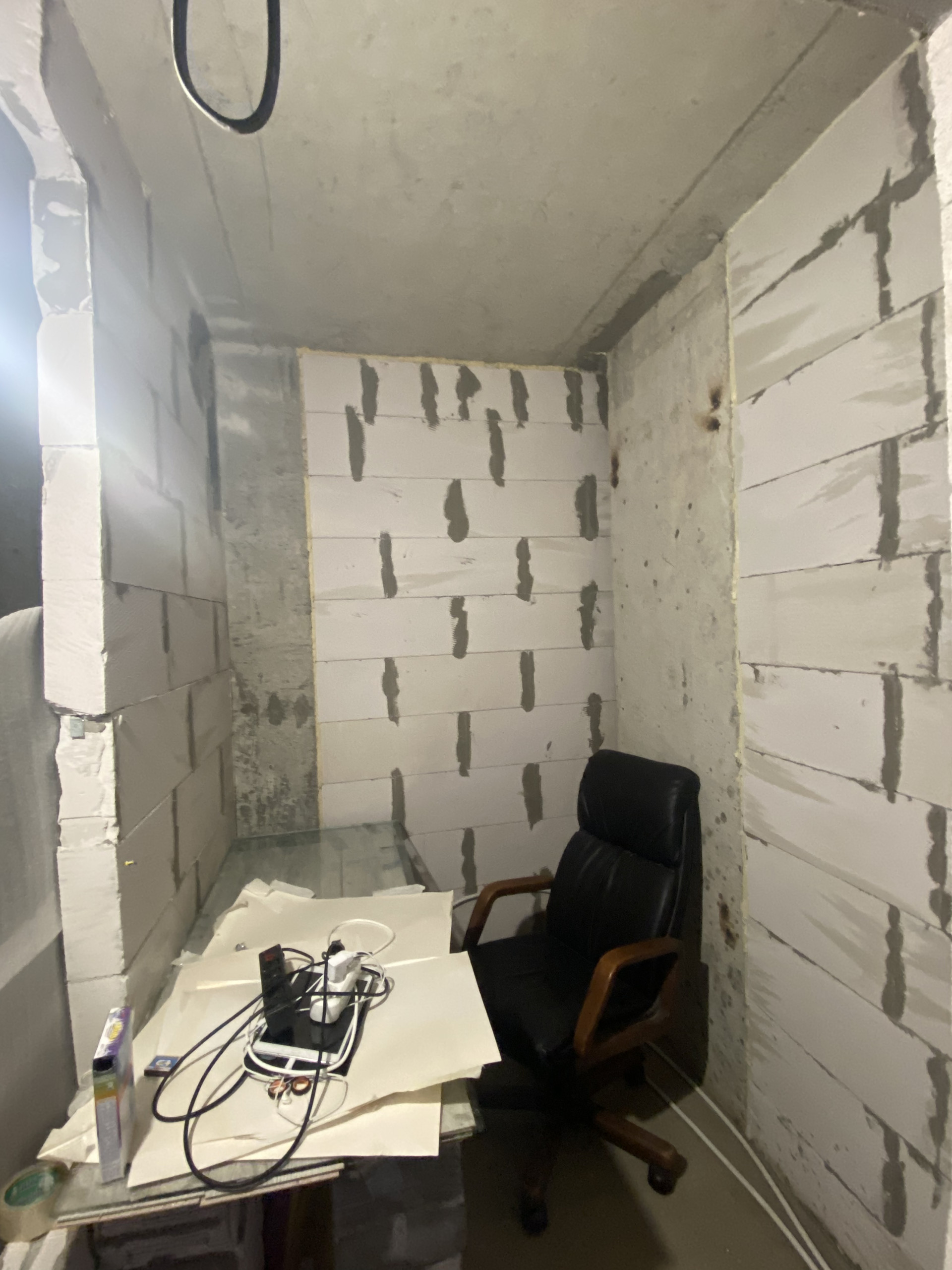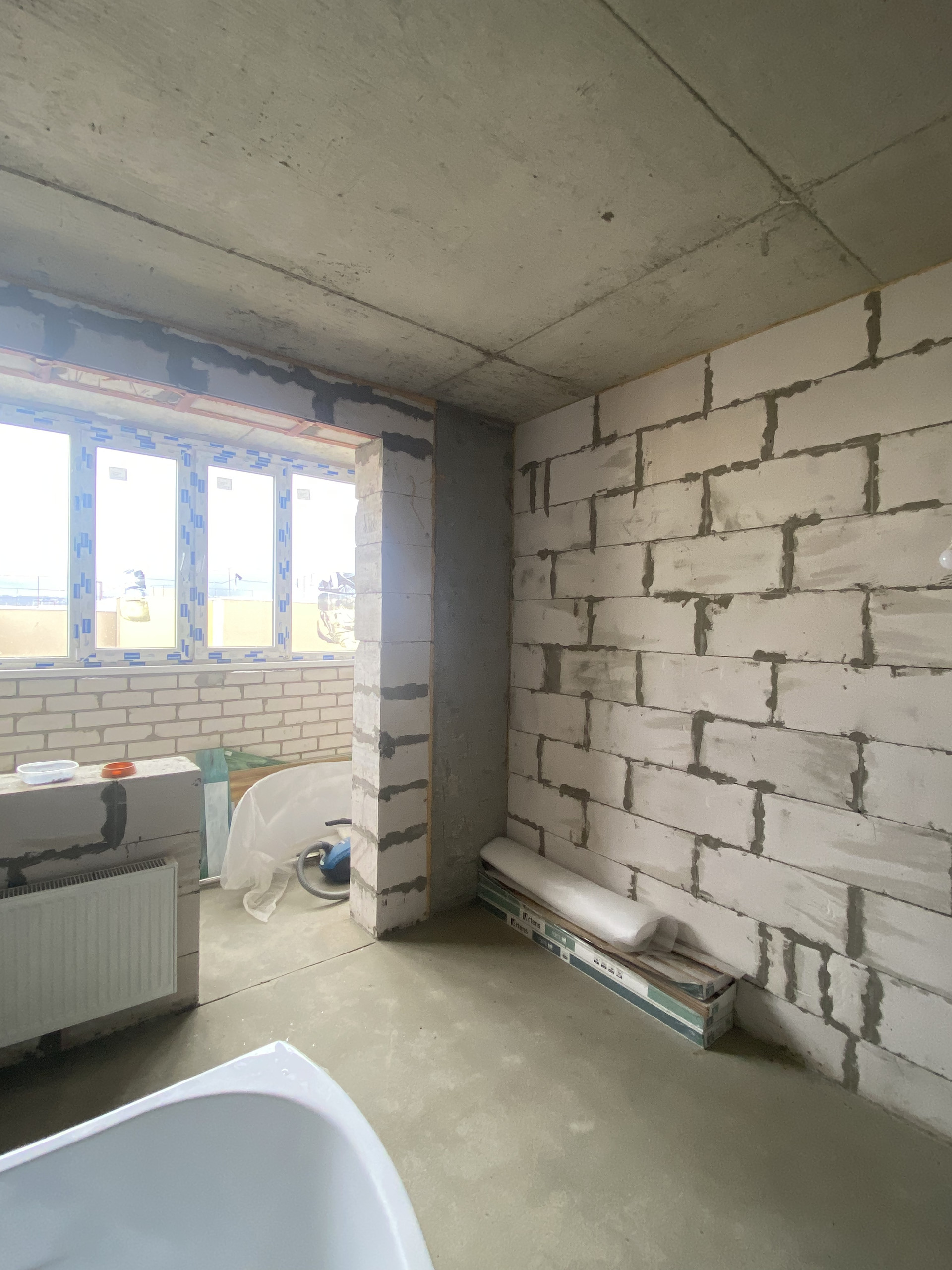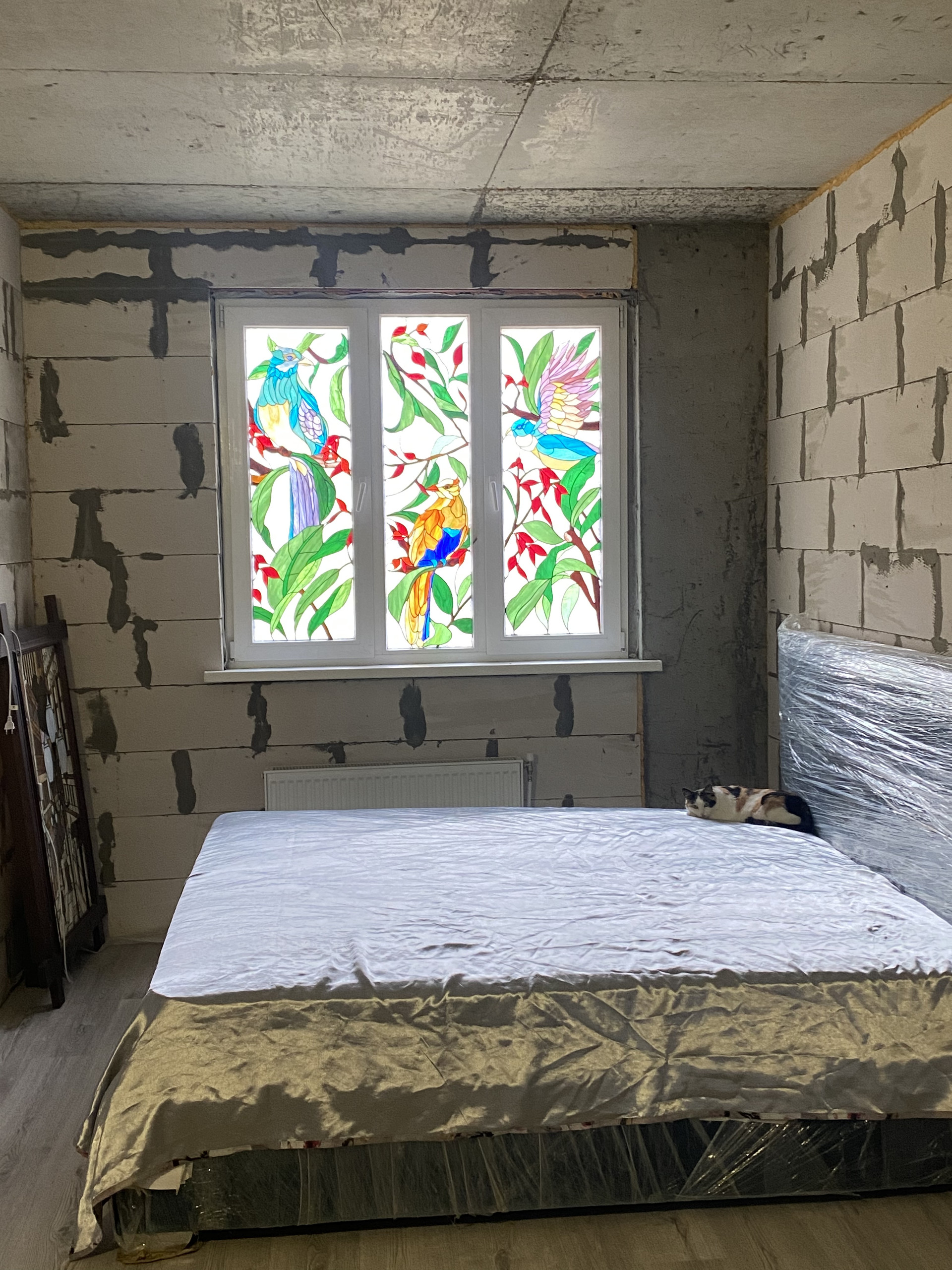 Квартира в стяжке, в одной комнате на окне сделан витраж, сверху полноценный трехметровый тех. этаж.