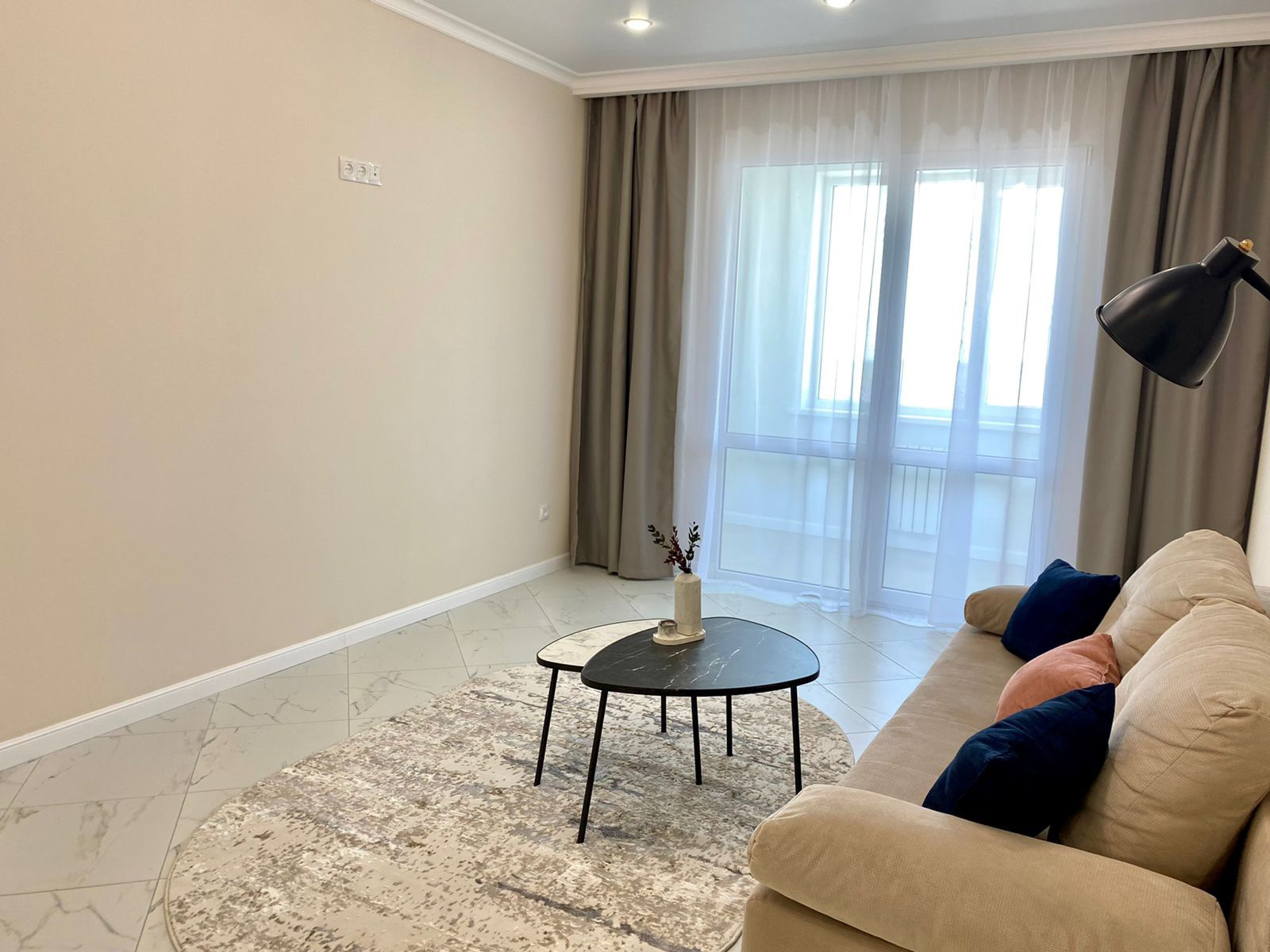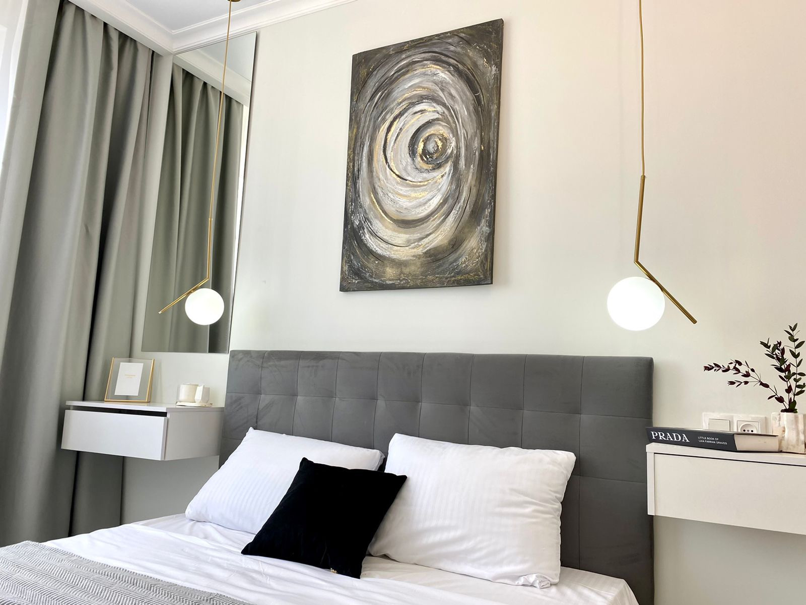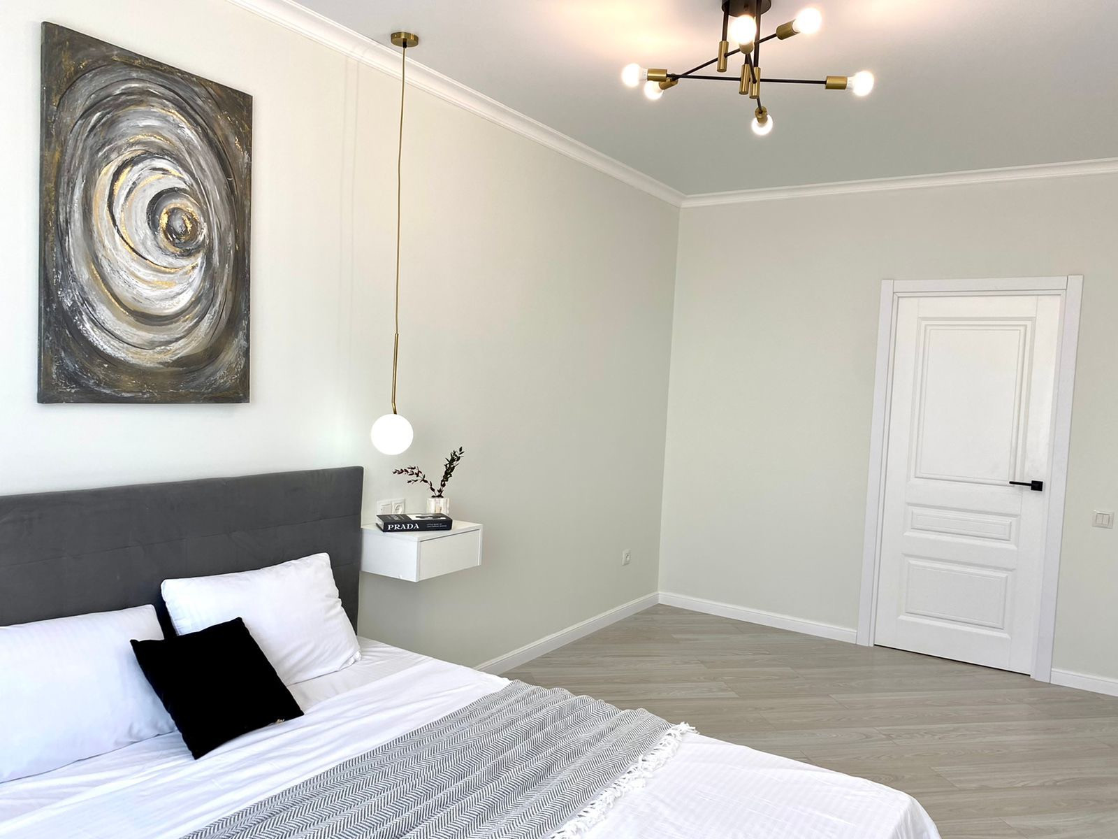 Текстиль  подбирался согласно авторской концепции квартиры, остаётся все, вплоть до комплекта нового белоснежного постельного белья.