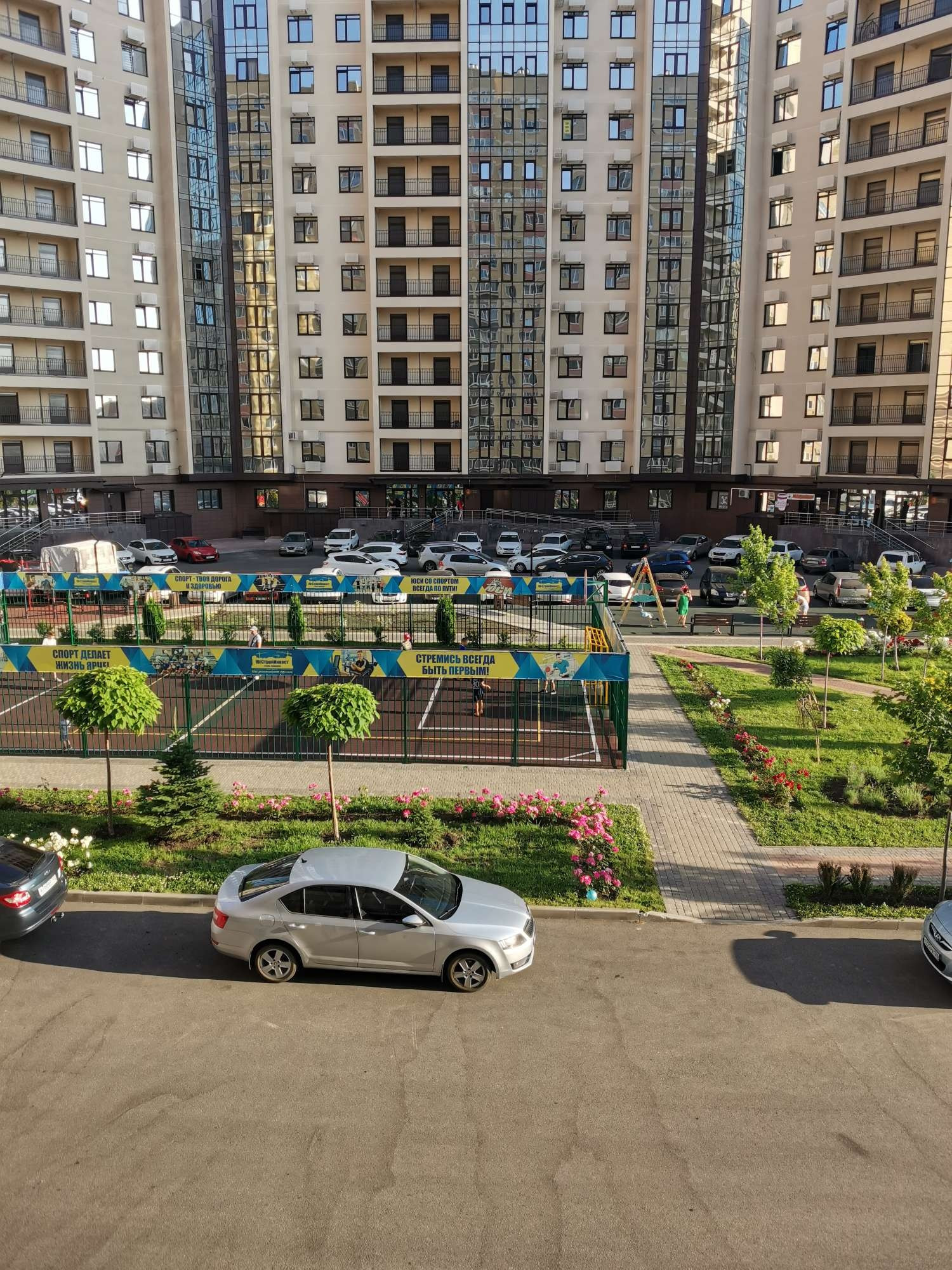 Во дворе детские и спортивные площадки.