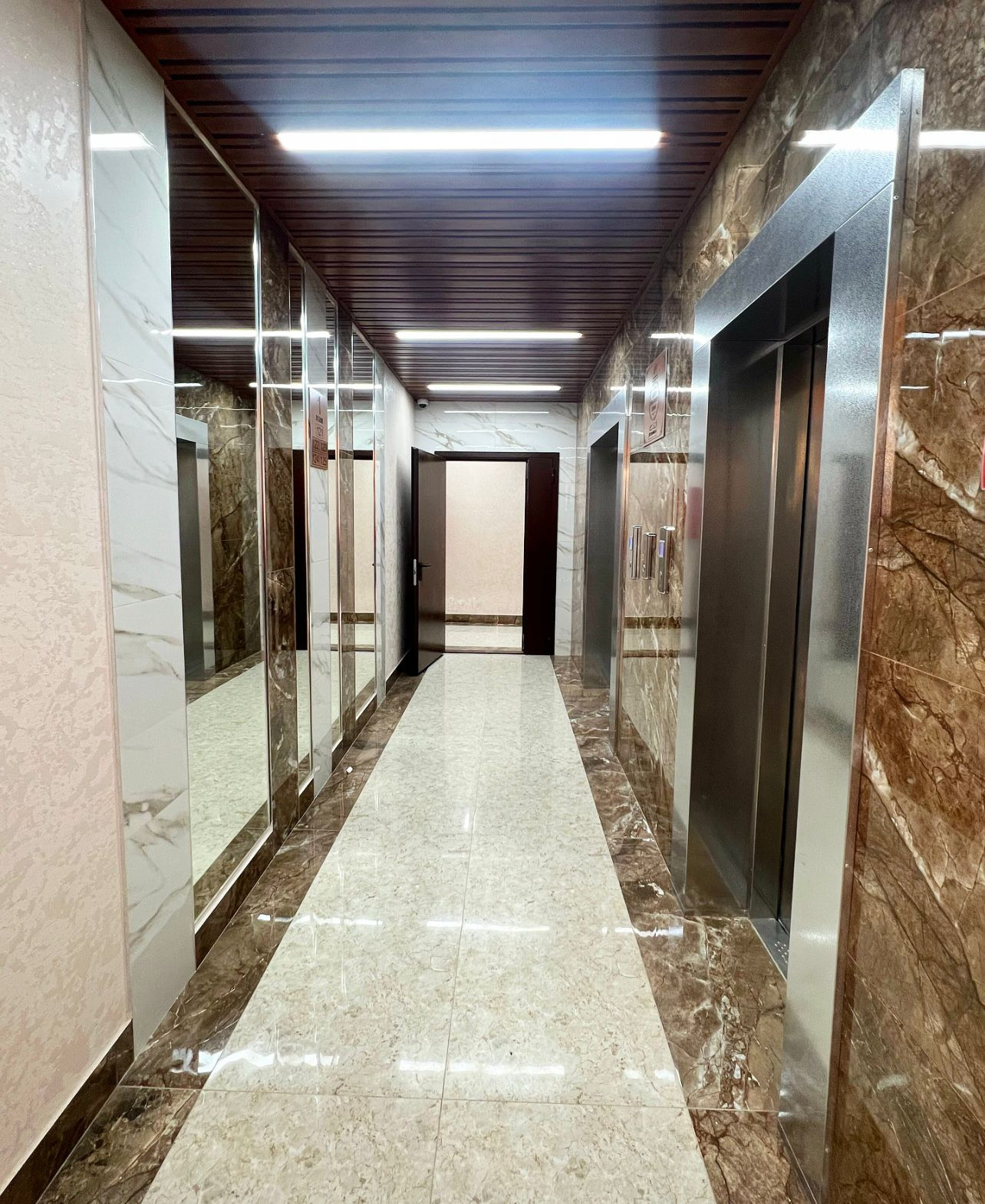 Декоративная отделка подъезда, два скоростных лифта.