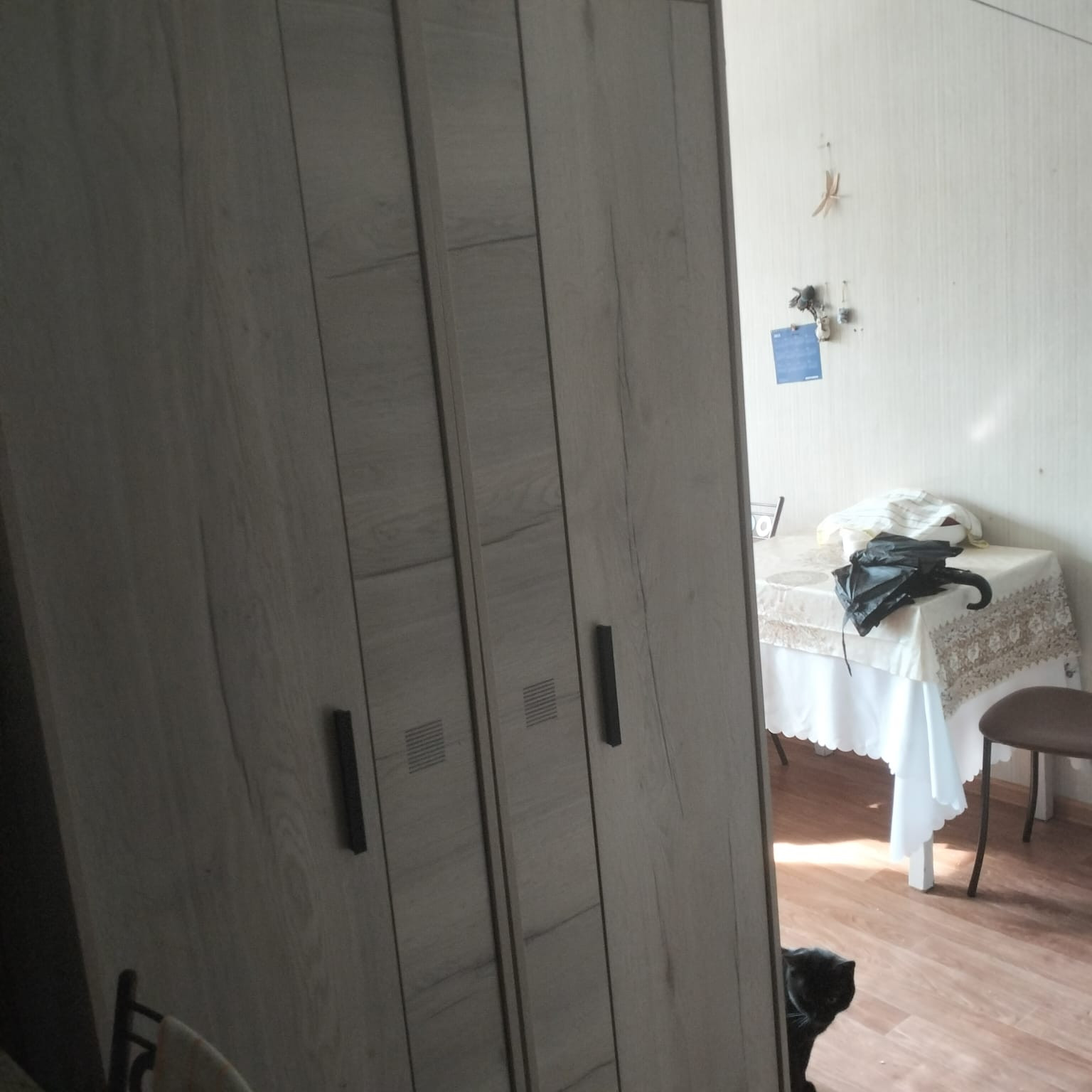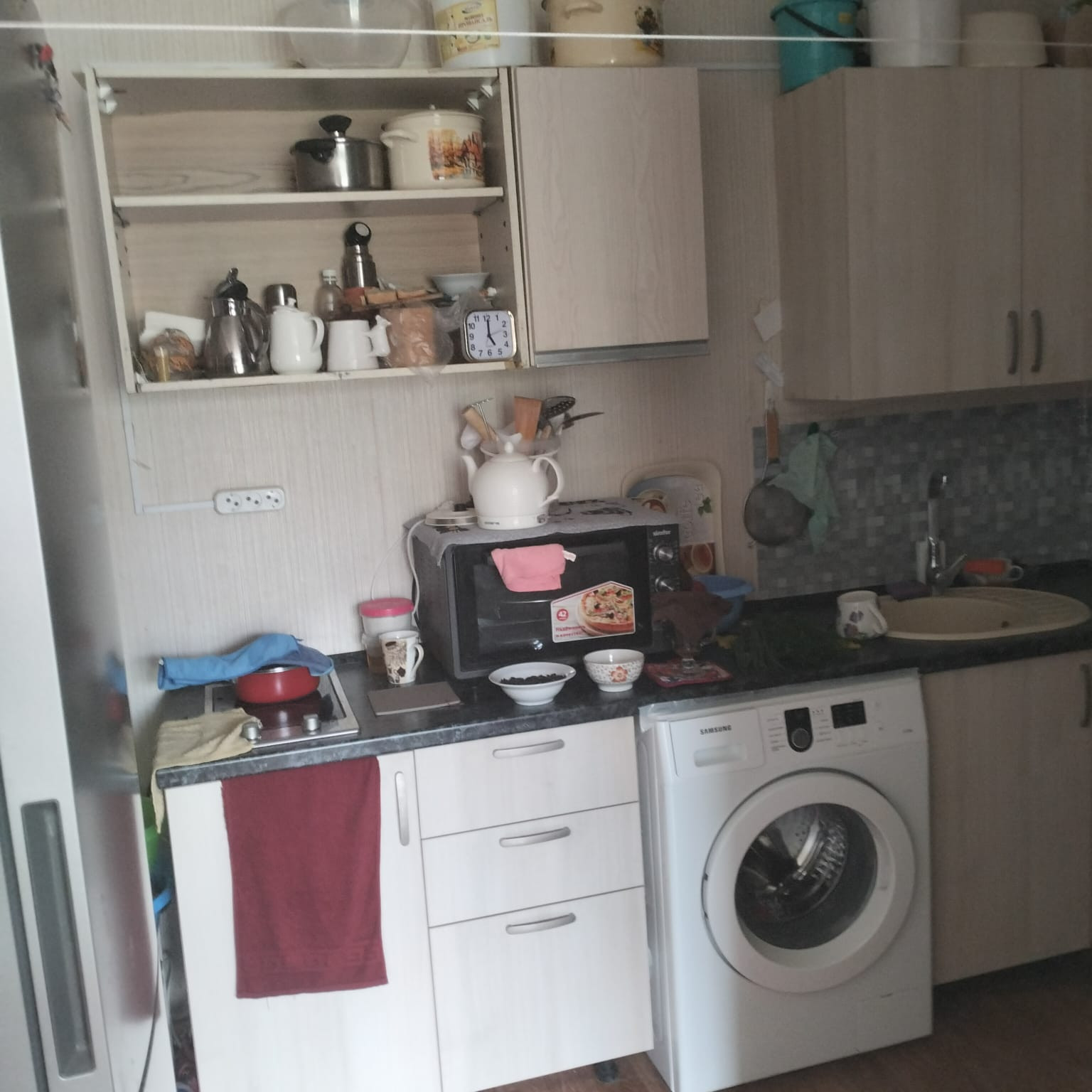 Из мебели остается встроенная кухня, шкаф, кухонный стол.