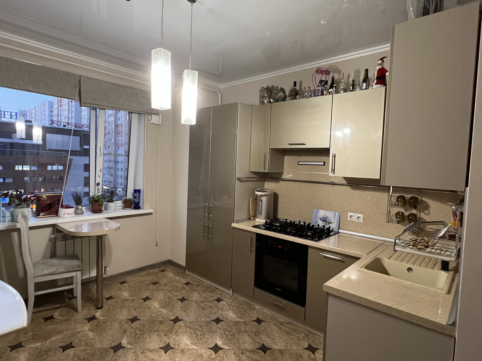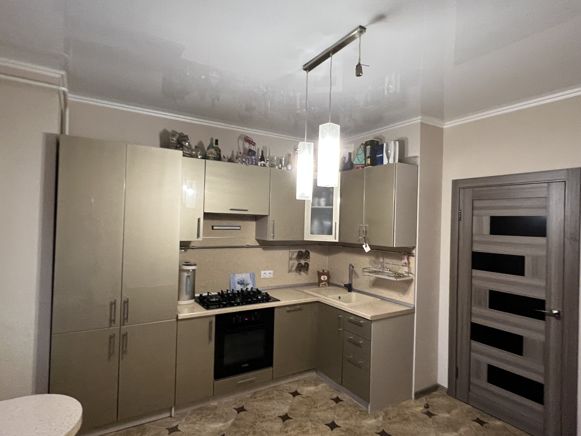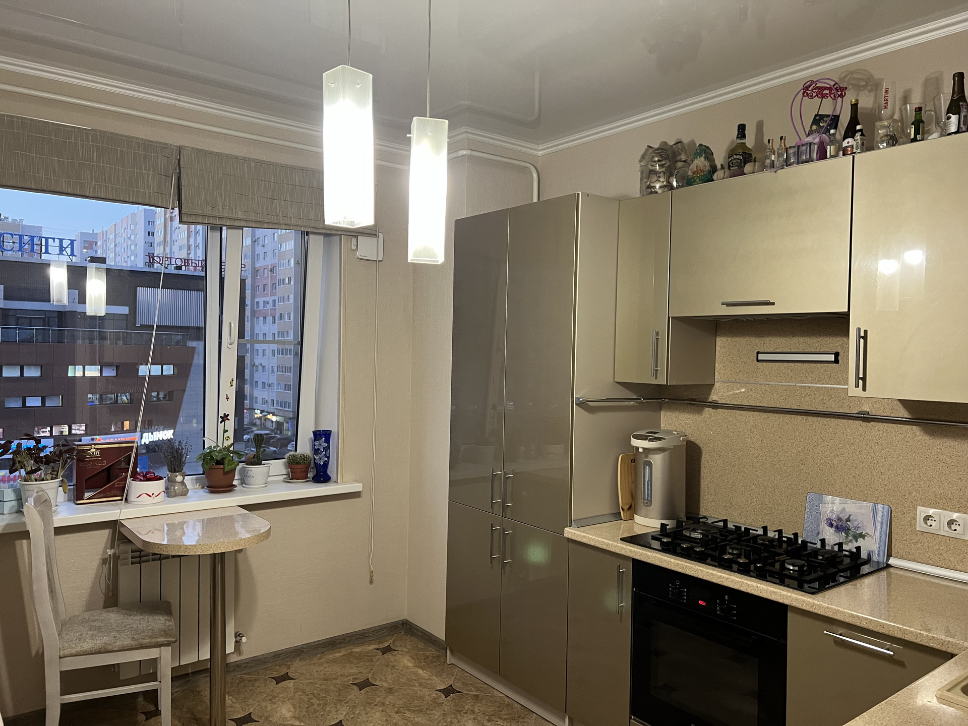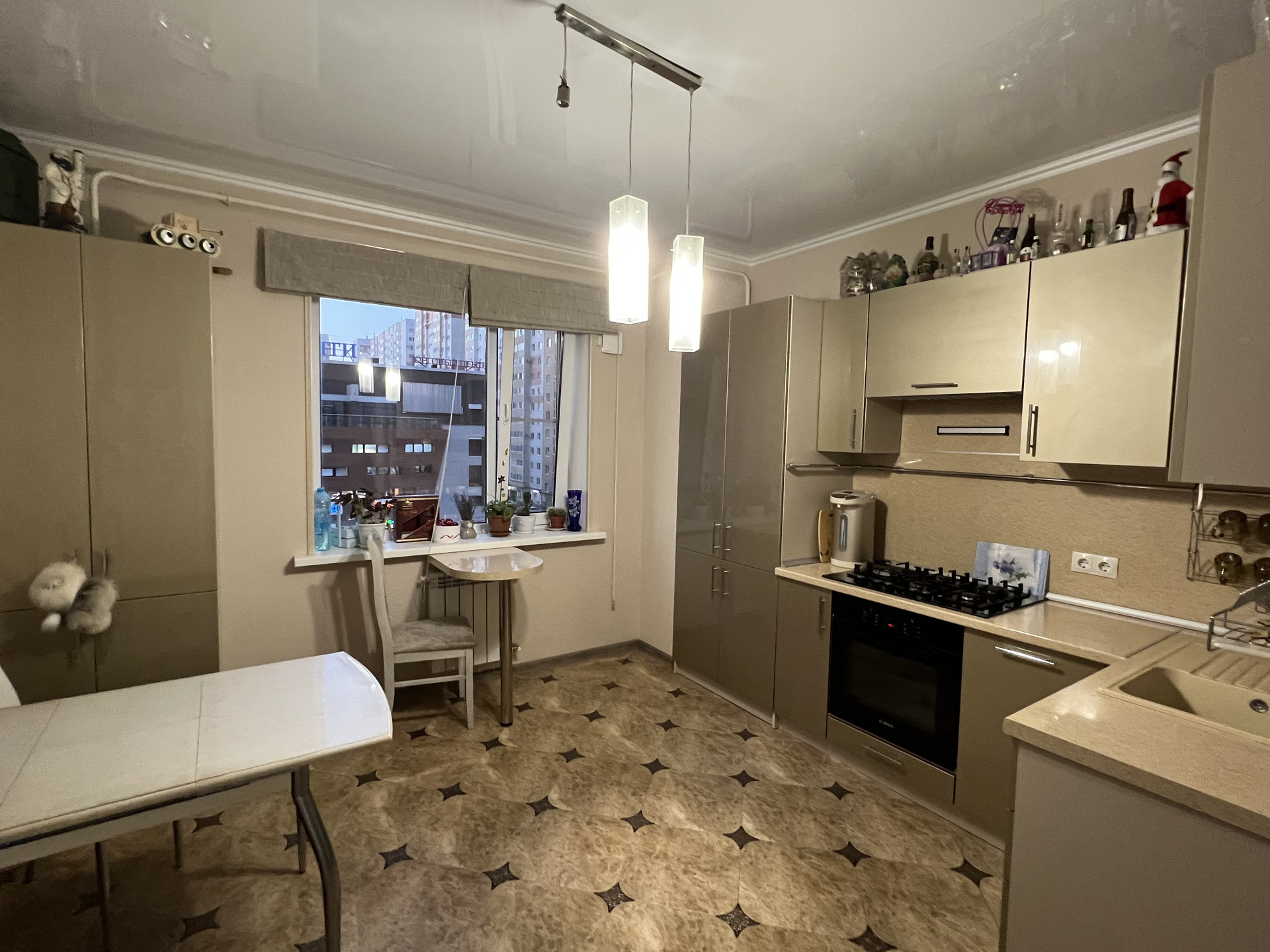 Остаётся встроенная кухня с техникой, встроенная мебель.