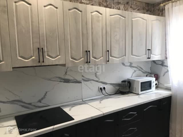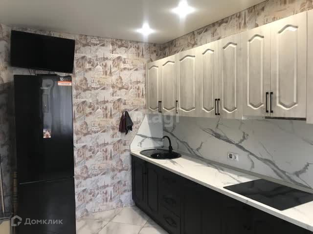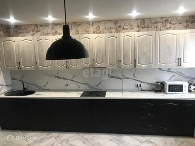 Кухня в квартире выполнена в современном стиле и оборудована всей необходимой бытовой техникой для комфортной готовки и приготовления пищи.