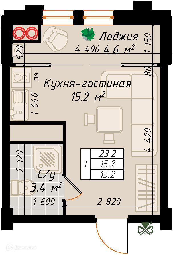 Общая площадь 23.2 м2