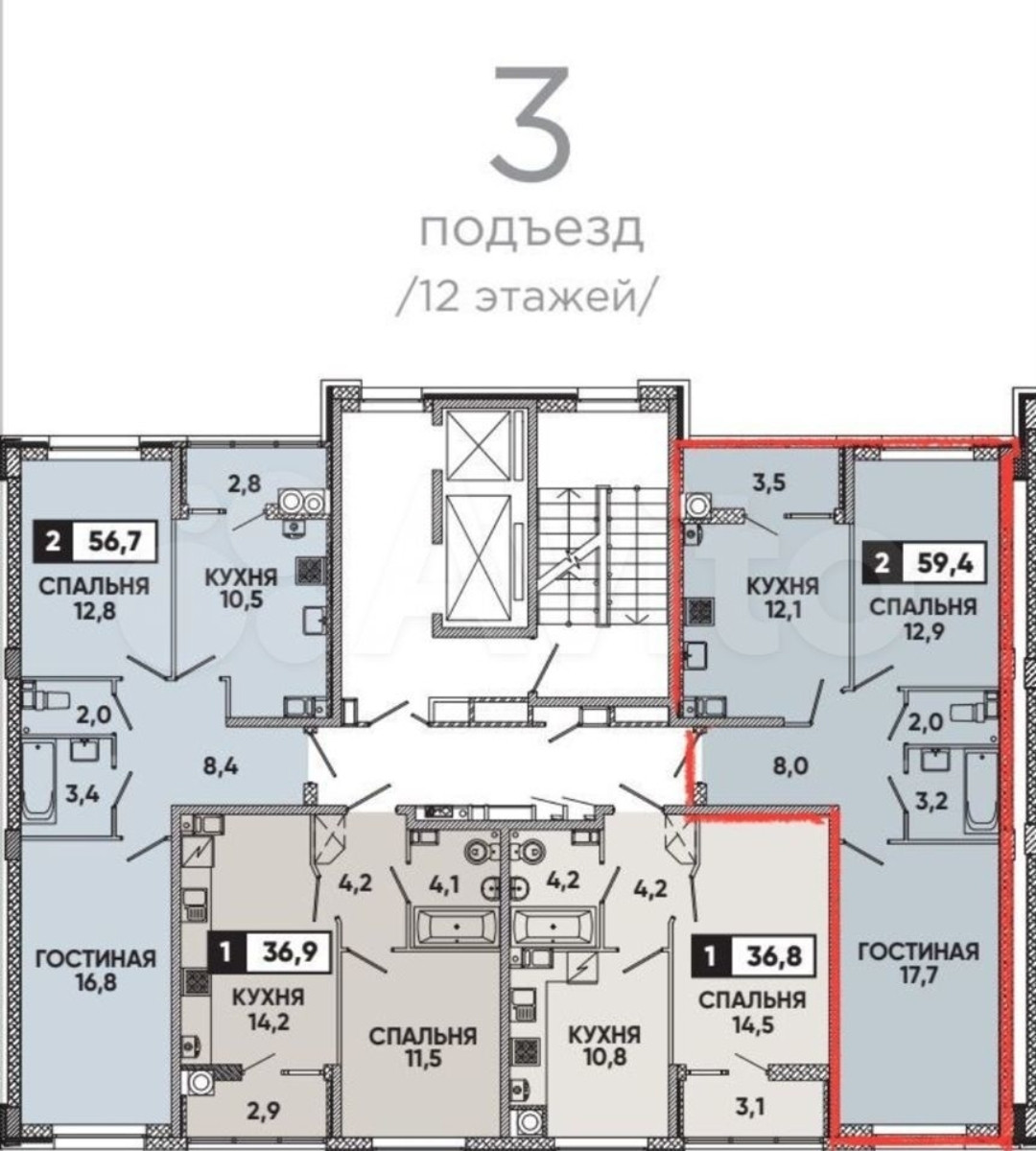 2-комнатная квартира, 59.4 м2, этаж 6 / 12, на продажу в Ставрополе, Российский проспект, 12к1