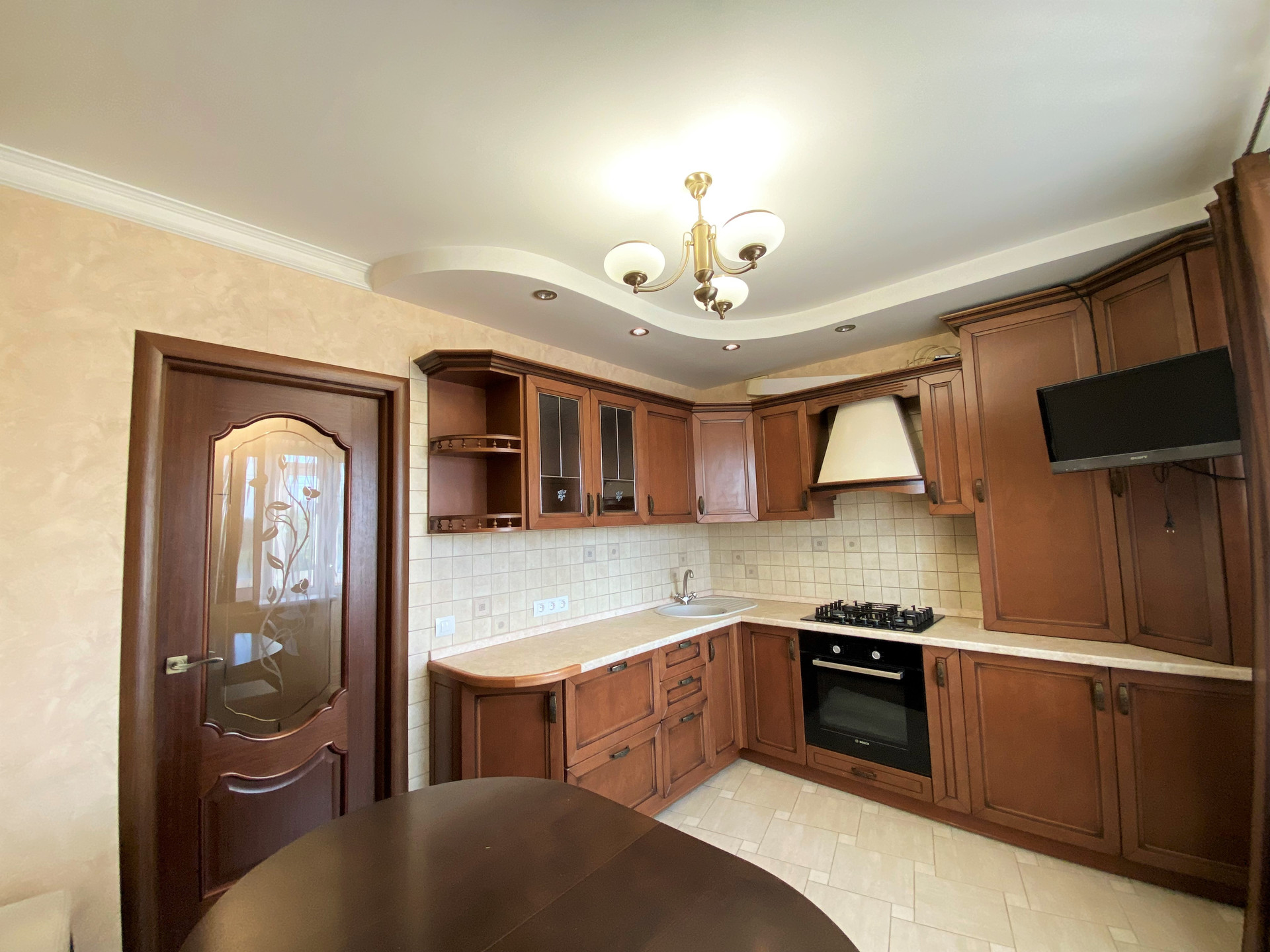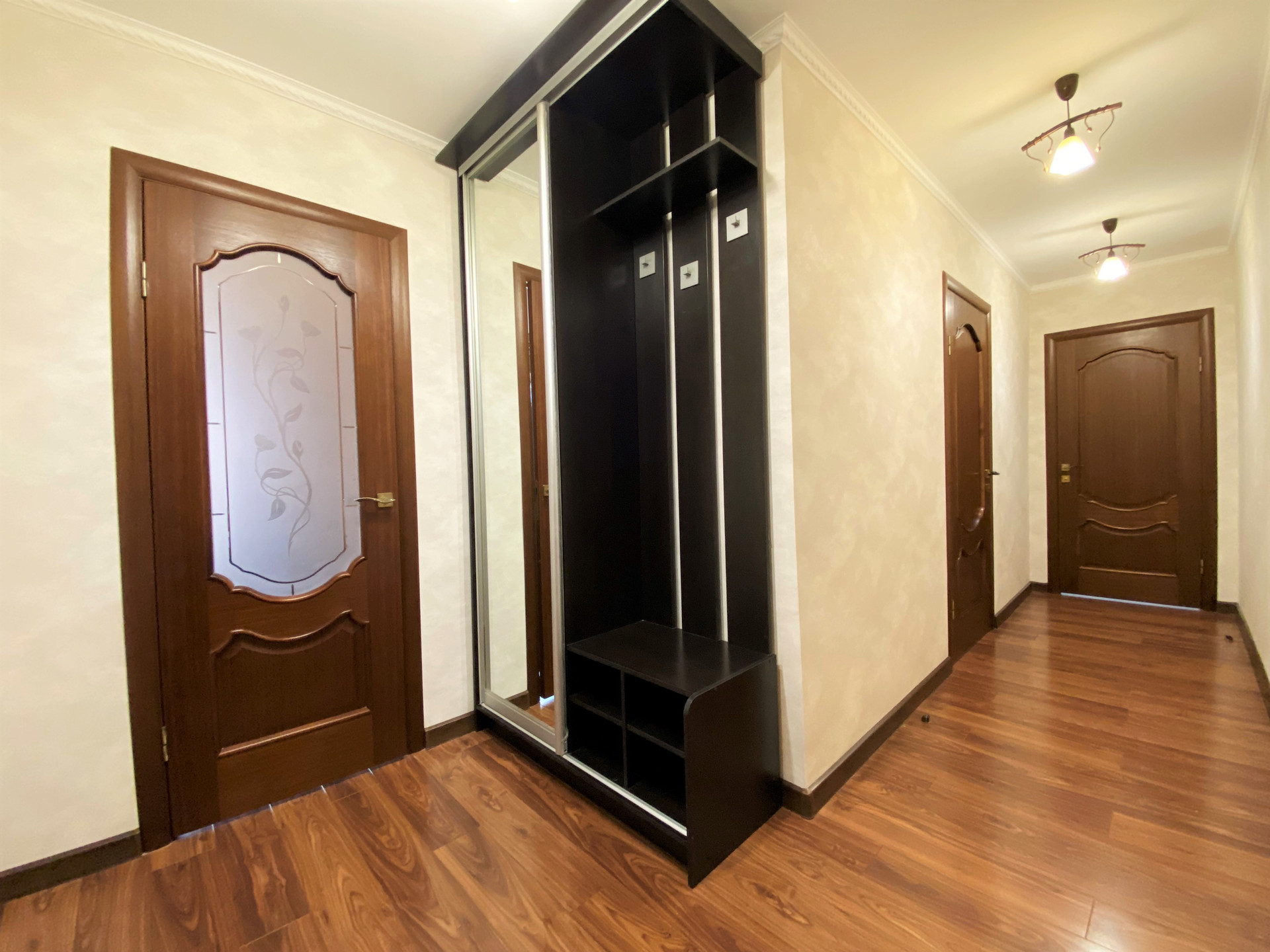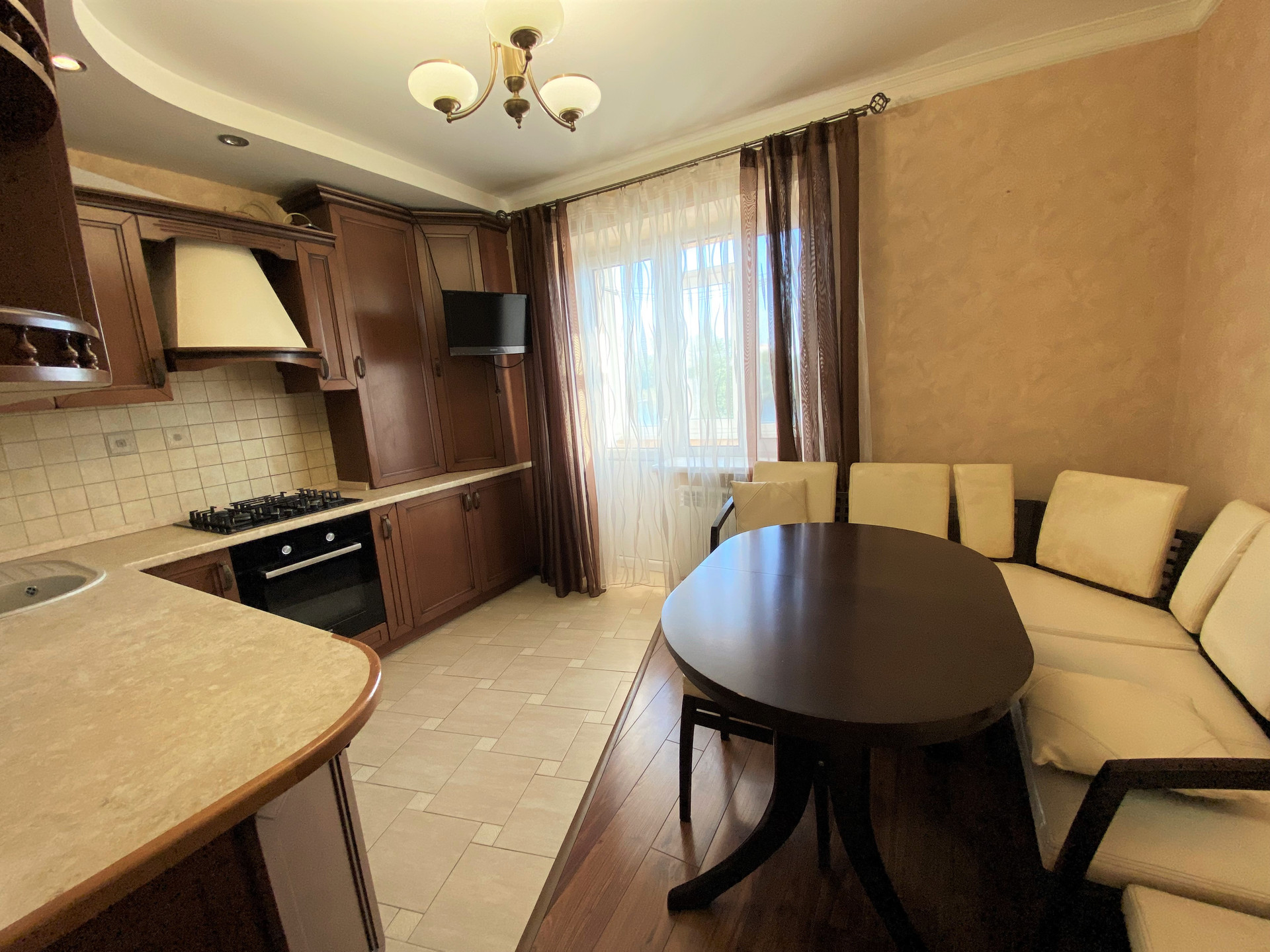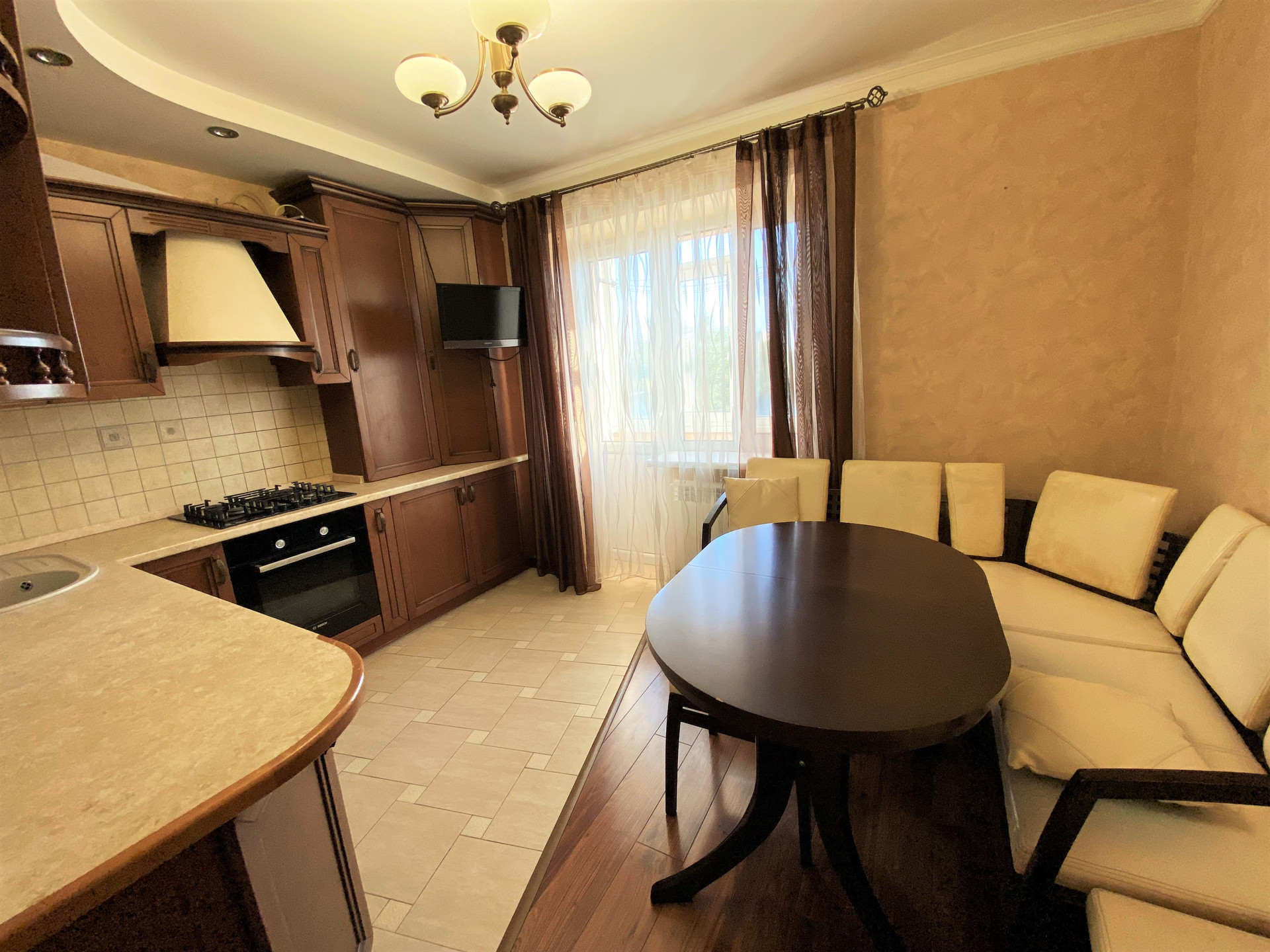 Ремонт- делался для себя. Потолок – двухуровневый с точечным освещением, в комнатах на полу бельгийский ламинат, в кухне выделена зона приготовления пищи - плиткой.