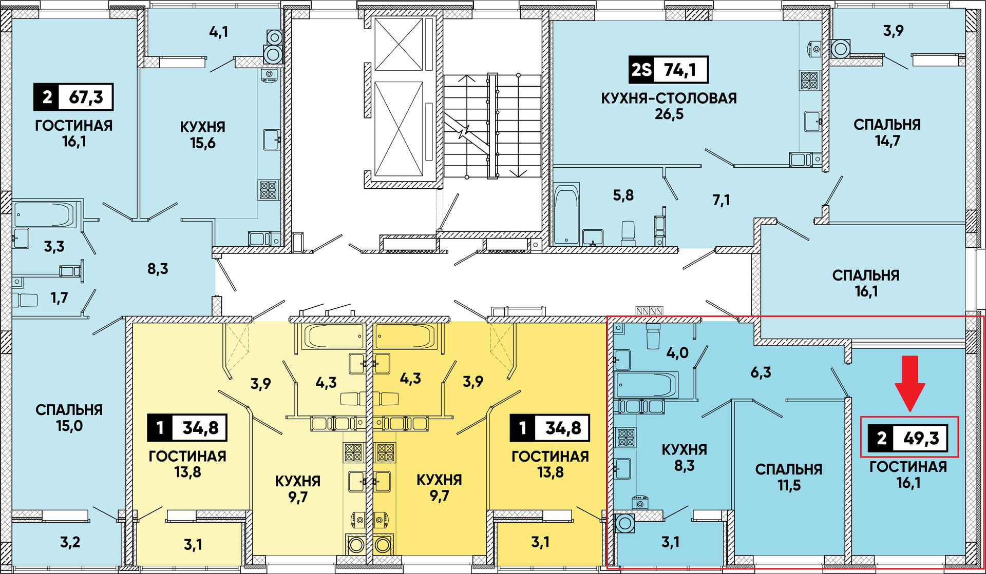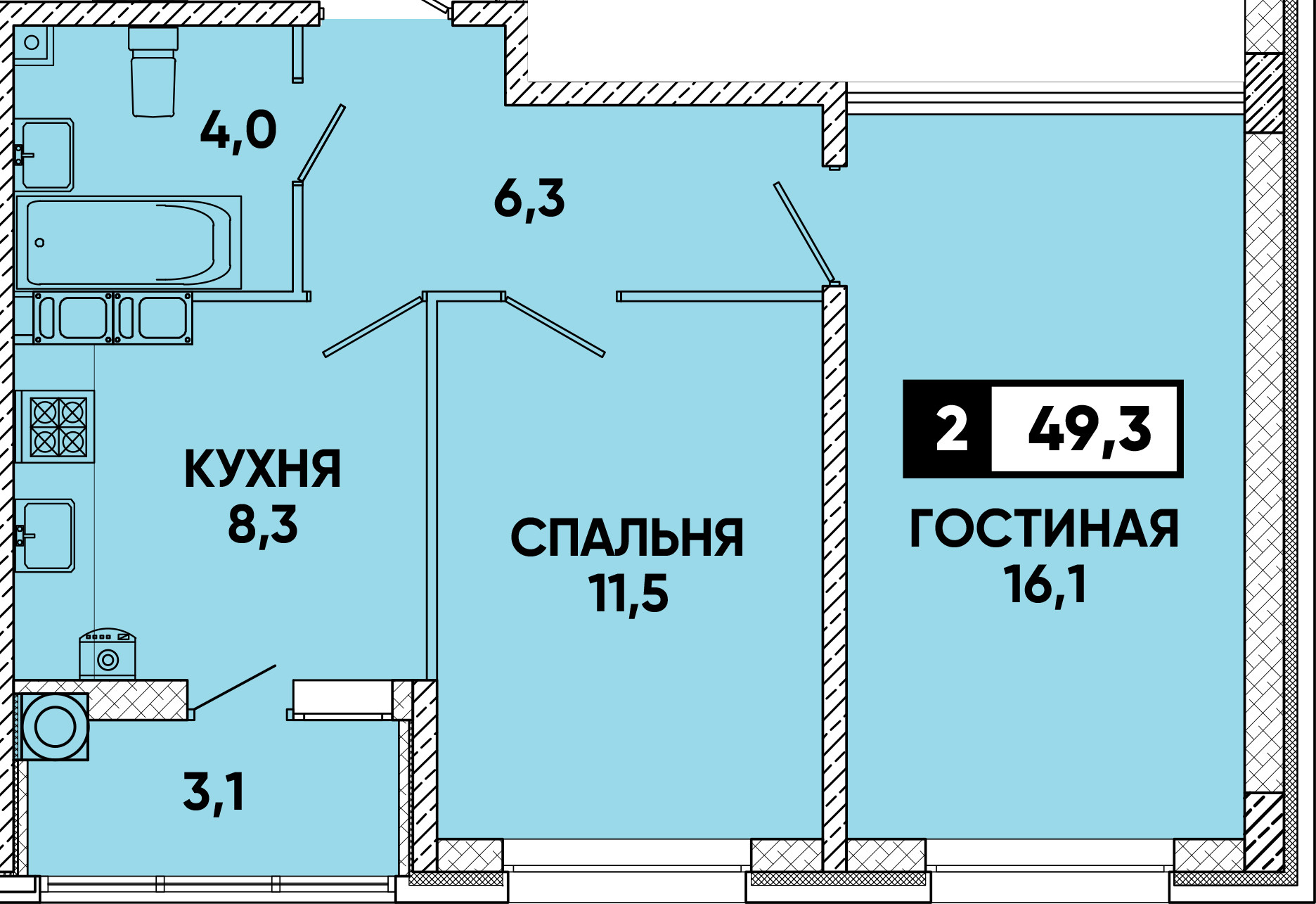 Общая площадь 49.3 м2