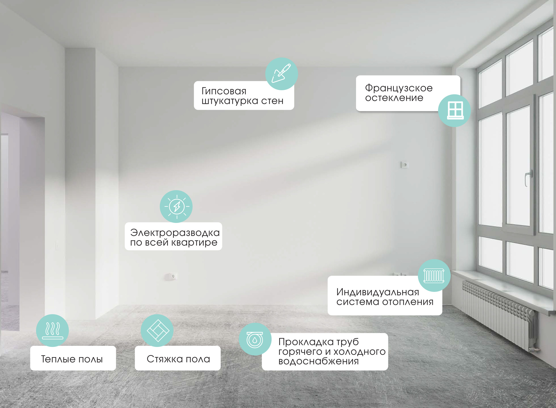 Стяжка, штукатурка, чистовая отделка под ремонт. Индивидуальное отопление, теплый пол (кухня, прихожая, санузел), газовая плита, розетки, приборы учета, лоджия застеклена, окна выходят на пр-т Российский.