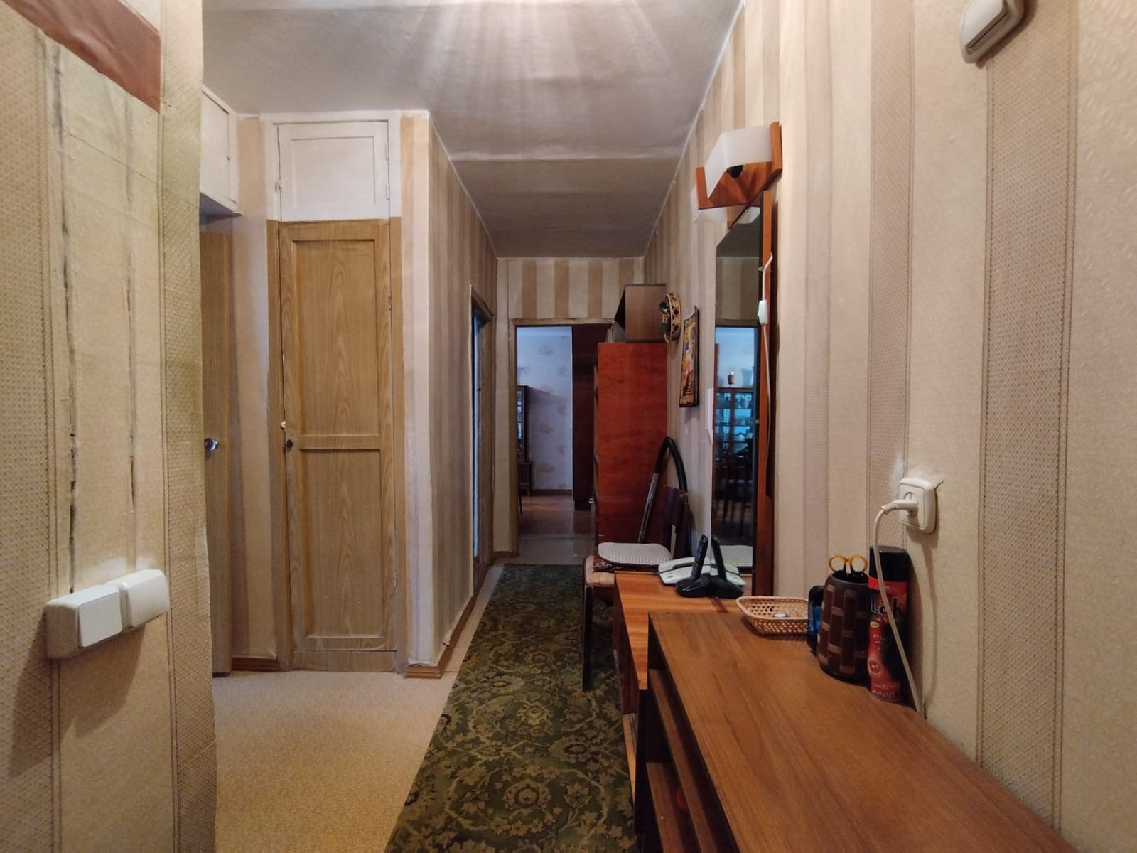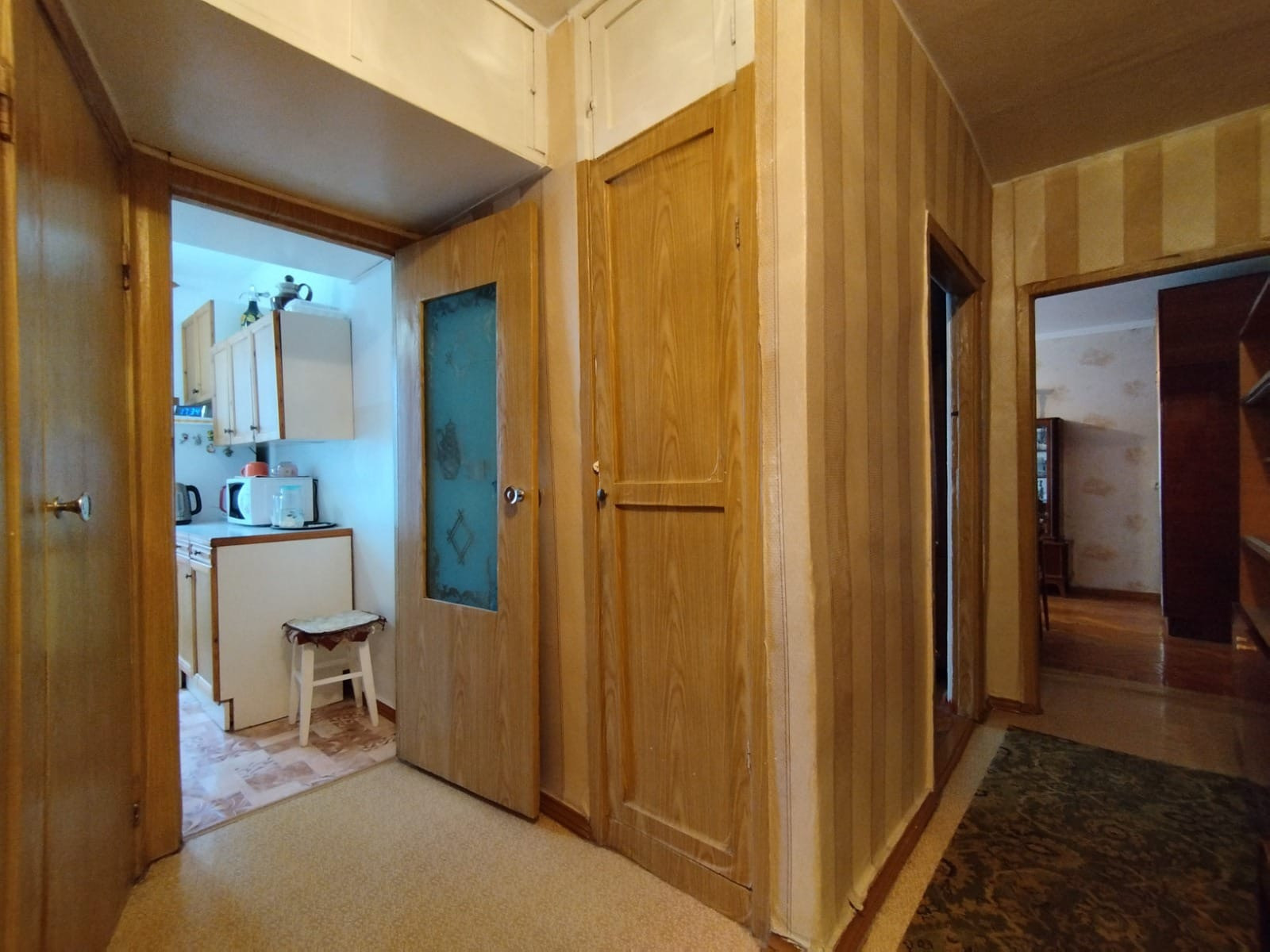 Комнаты светлые, окна выходят на обе стороны дома (распашонка). Общая площадь - 61.8. кв м (без учета лоджии - 58.8 кв м), жилая - 41.9 (17.4/14/10.5), кухня - 6.2 кв м, лоджия - 3 кв м, коридор - 7.3 кв м, ванная - 2.1 кв м, туалет - 1 кв м. Высота потолков - 2.5 м. В кухне и лоджии - стеклопакеты, в комнатах окна деревянные. Пол в комнатах - паркет, в коридоре и кухне - линолеум.