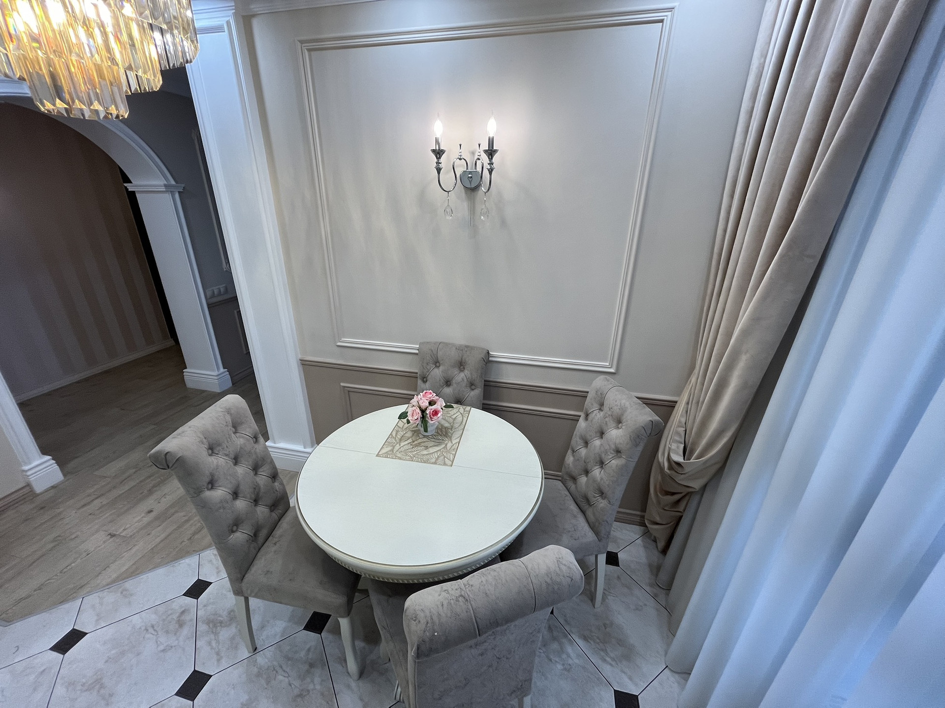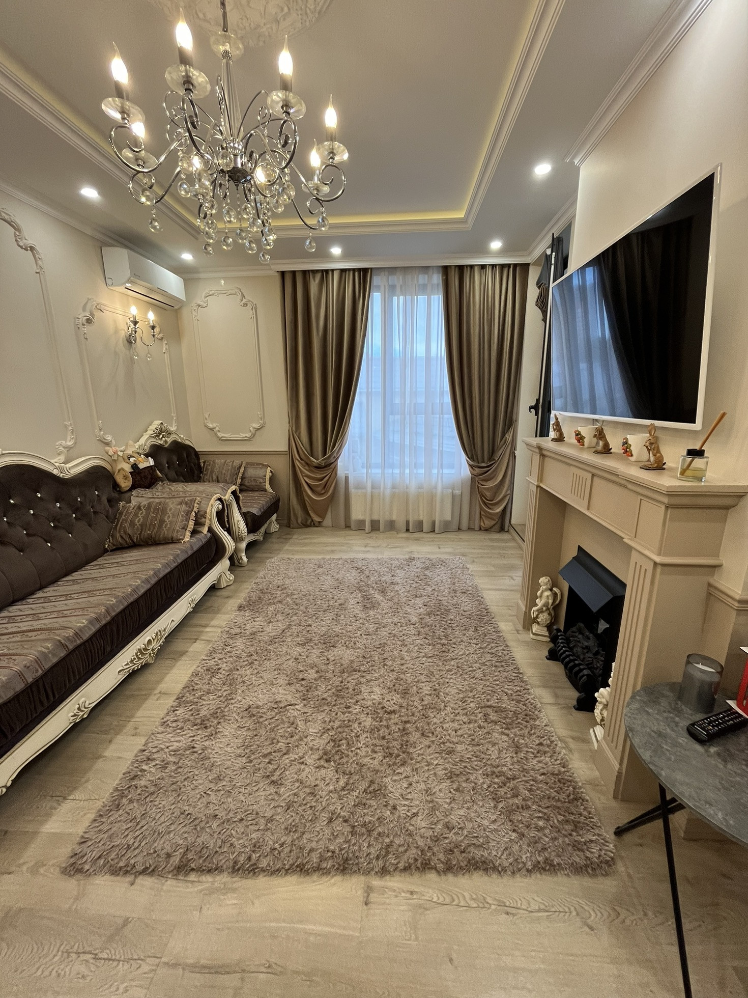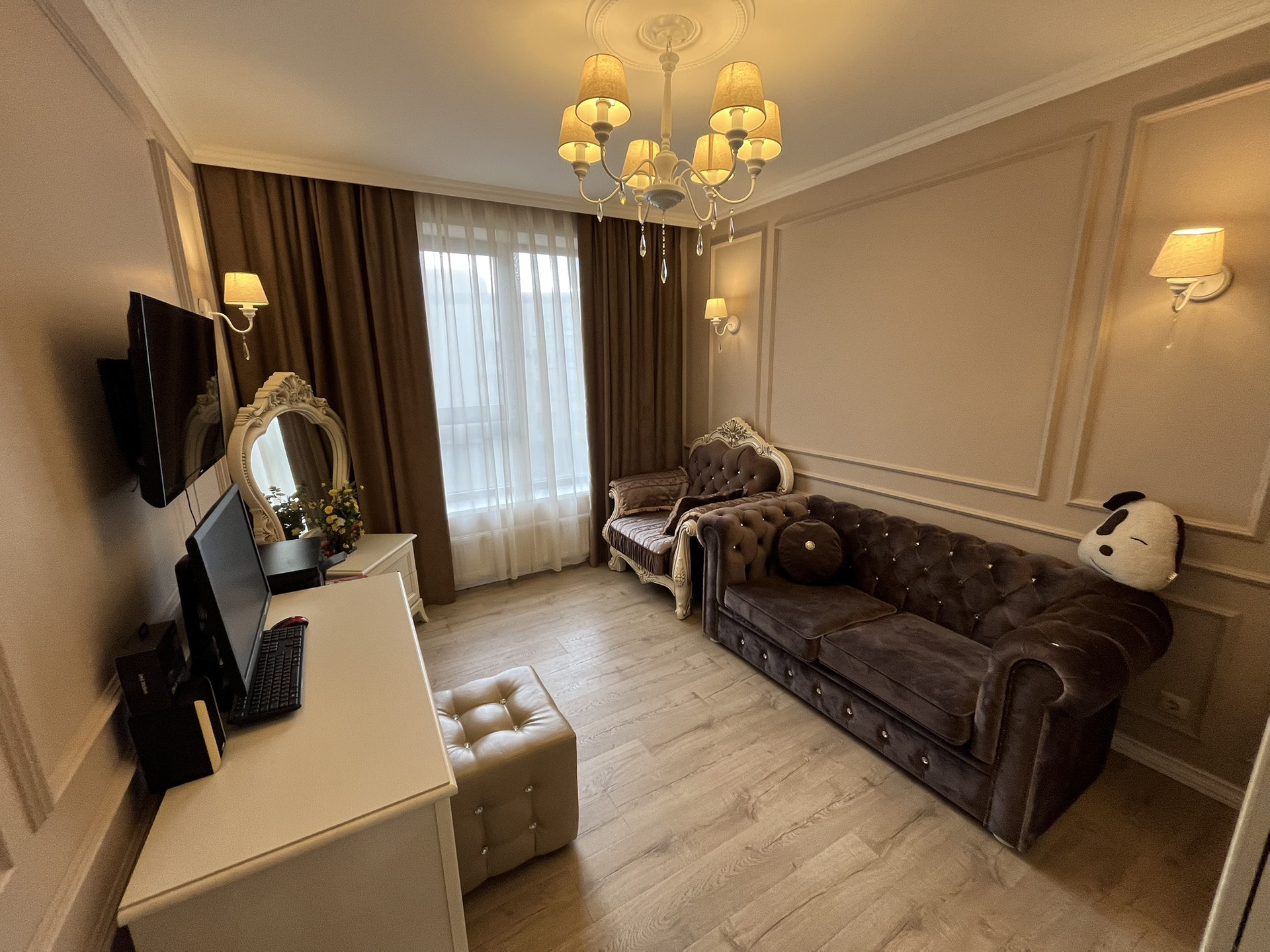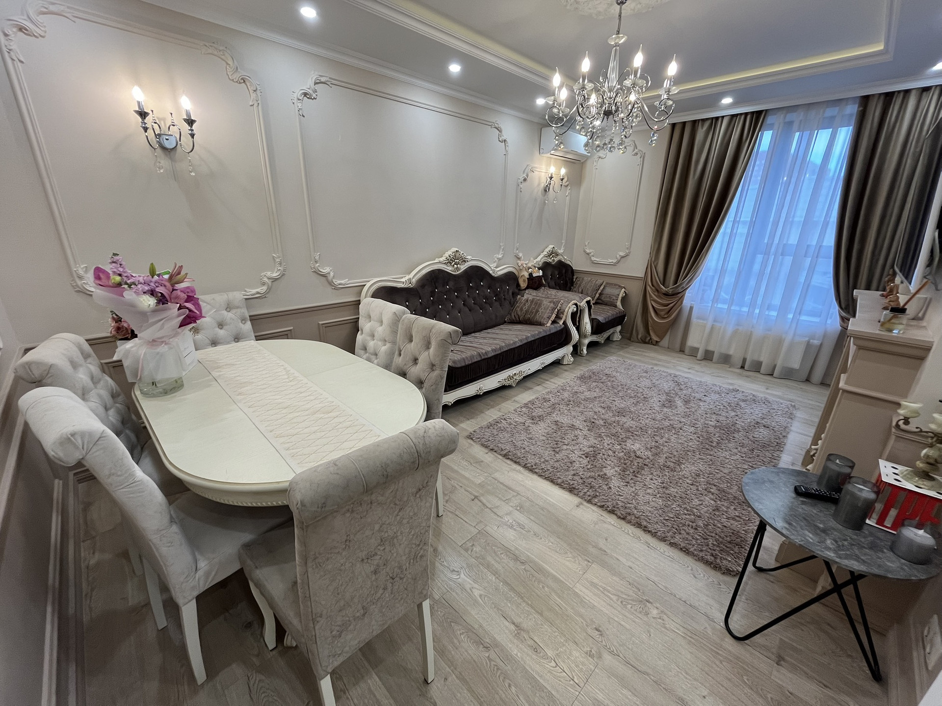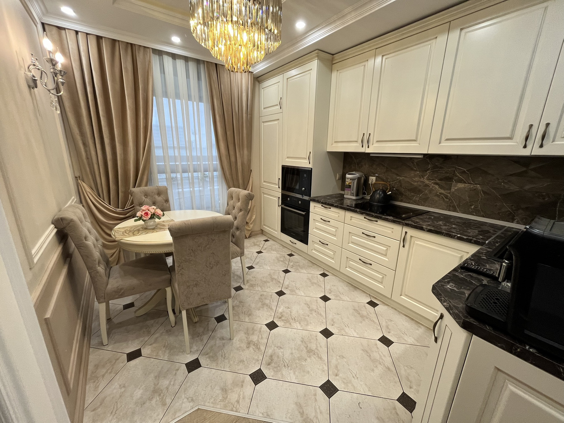 Качественный ремонт, выполнен по индивидуальному дизайн проекту. Шкафы и кухонный гарнитур из массива дерева, хрустальные люстры, качественные двери.