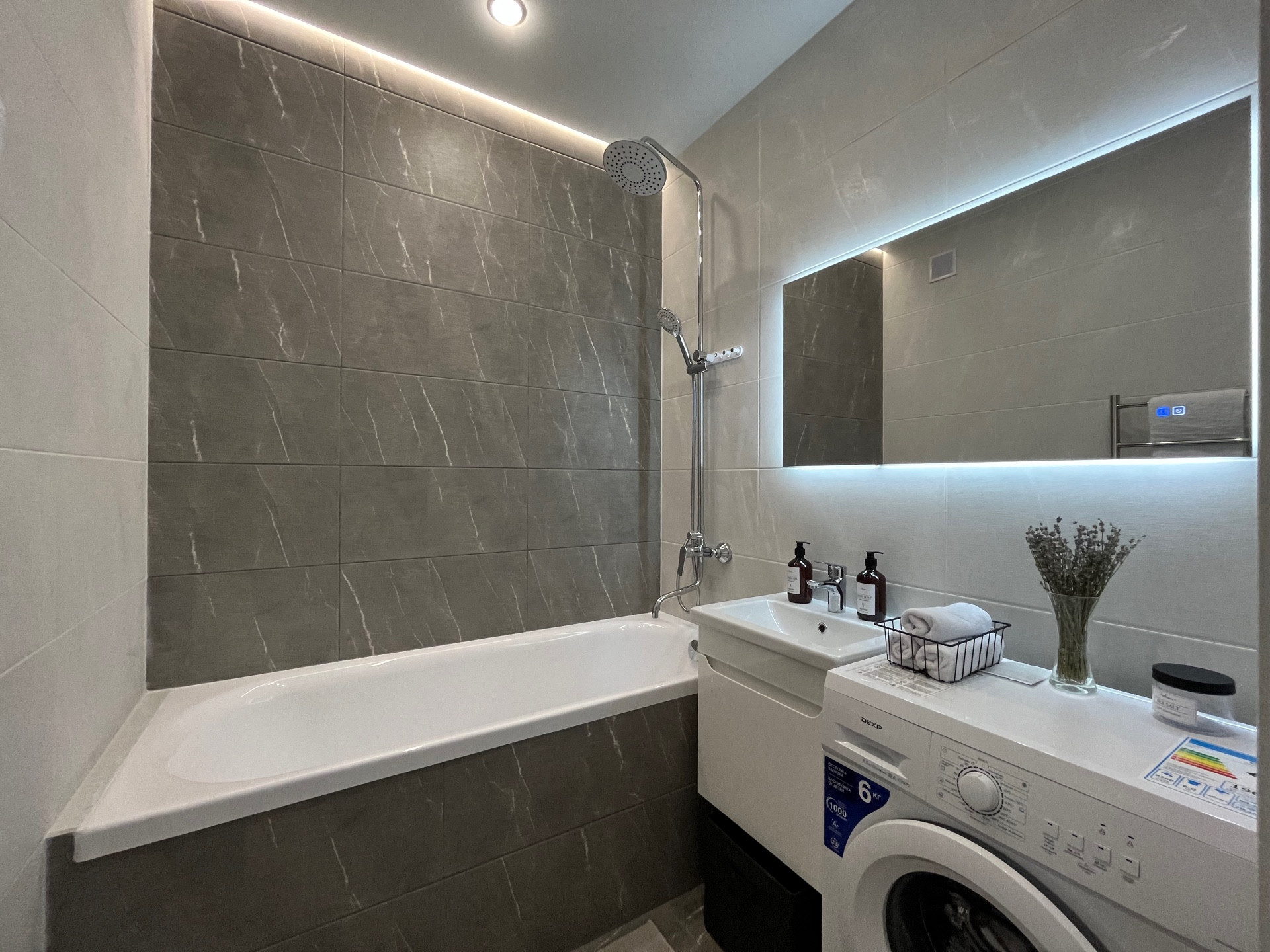 С/у раздельный. В с/у качественная сантехника. Установлены: тропический душ, ванная, инсталляция, встроенная раковина, зеркала с дополнительным освещением, а так же стиральная машинка.