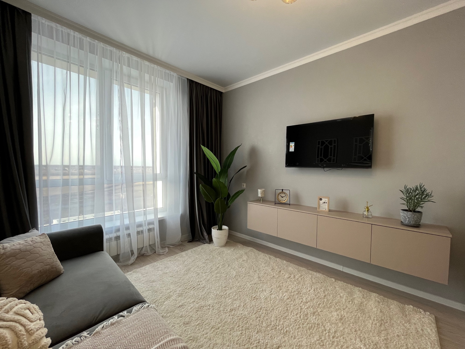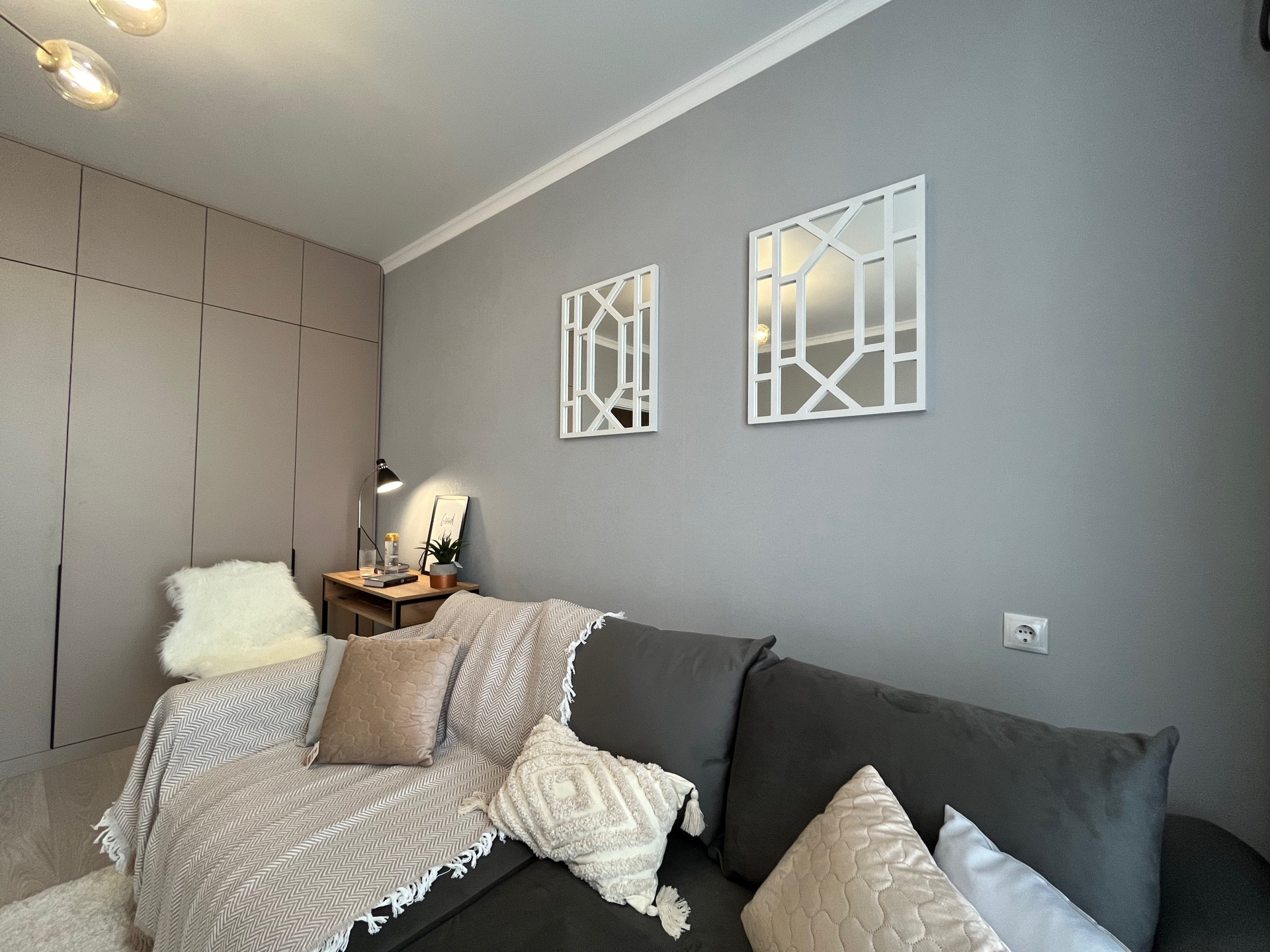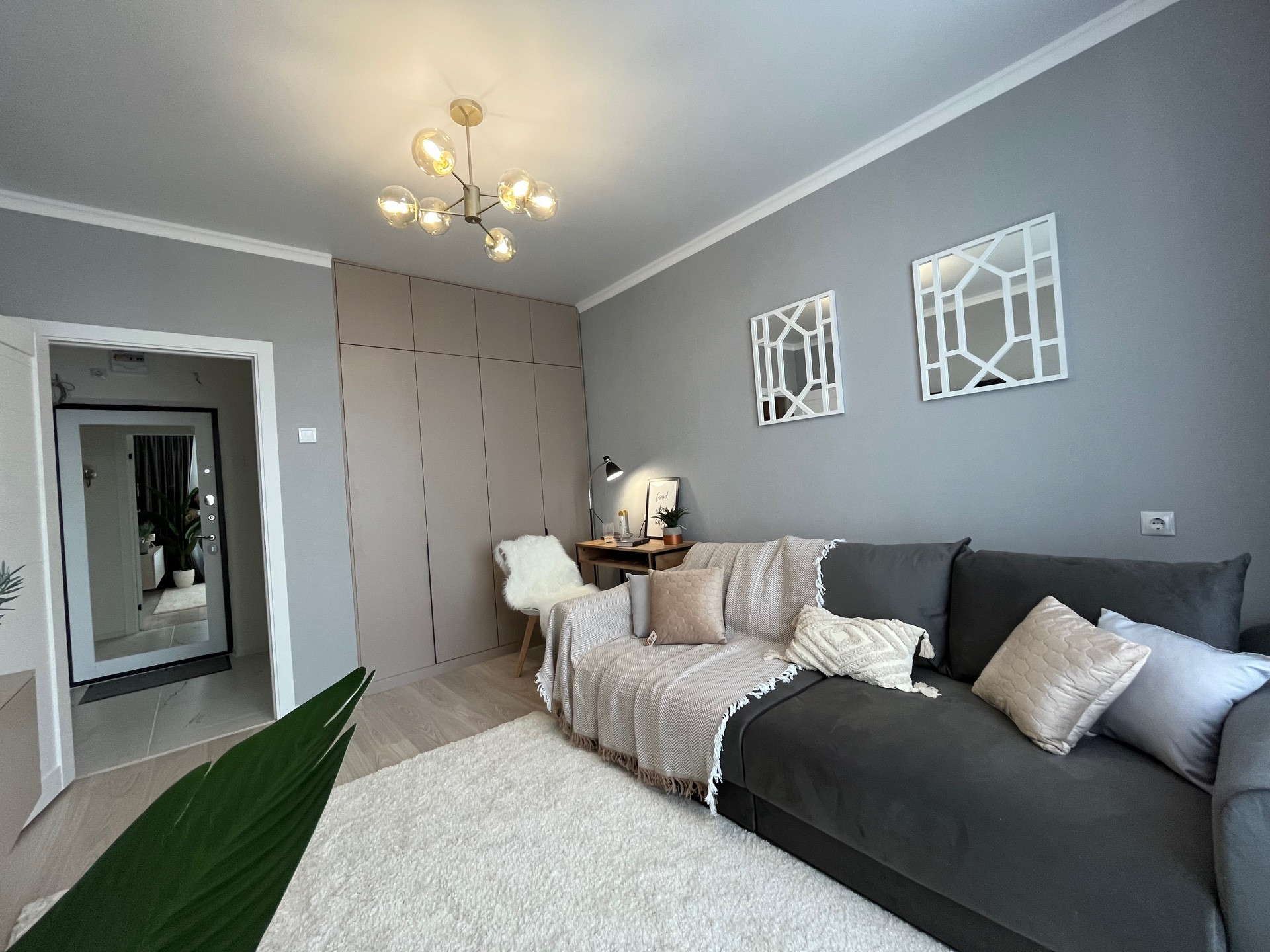 Спальня оснащена большим мягким диваном. Установлен большой Smаrt-телевизор с настенным креплением и подвесной тумбой. В комнате находится вместительный шкаф. За освещение отвечает дизайнерская люстра. Оборудована рабочая зона.