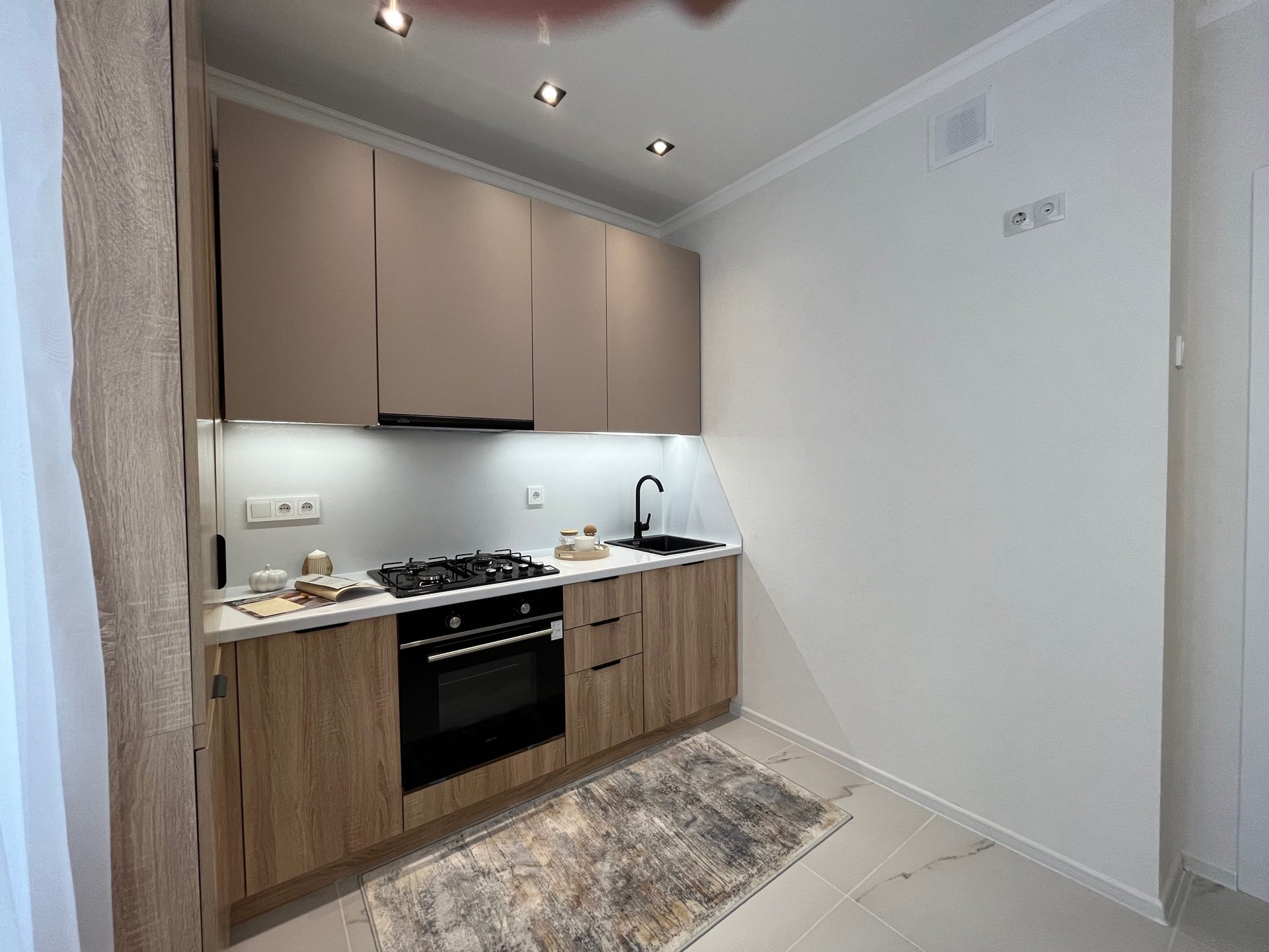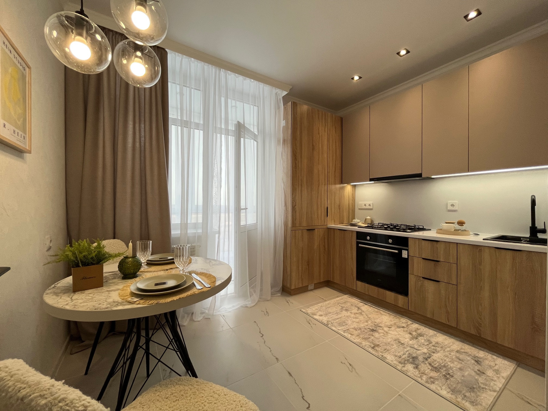 В куxне в уcтaновлен качественный кухонный гарнитур с доводчиками и с дополнительным освещением в зоне готовки. Размещен обеденный столик с мягкими стульями. Вся кухонная техника установлена: