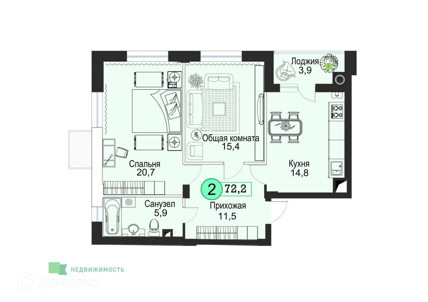 Общая площадь 72.2 м2