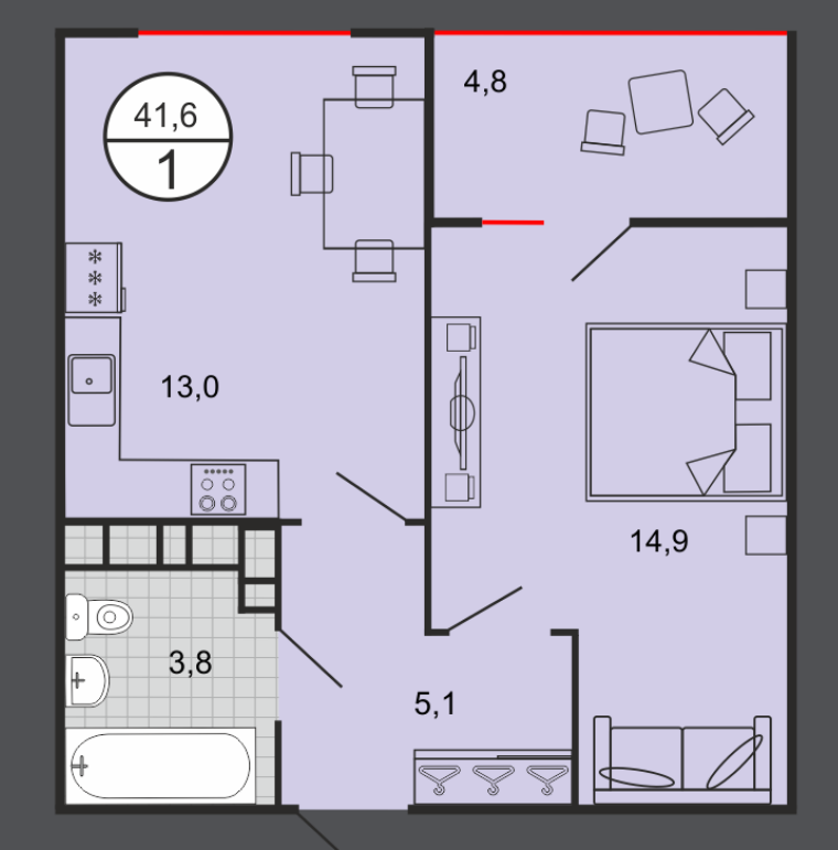 Общая площадь 41.6 м2