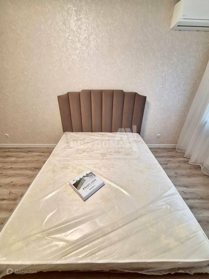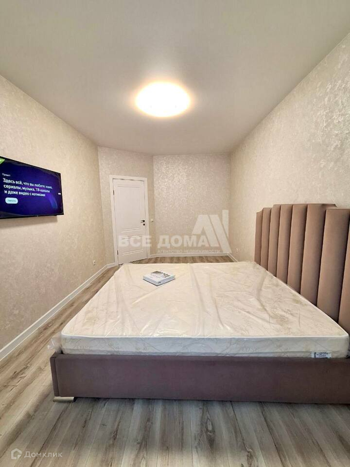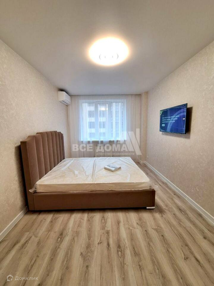 Комната с установленной сплит системой, телевизором 50 дюймов и шикарной кроватью, на полу ламинат.