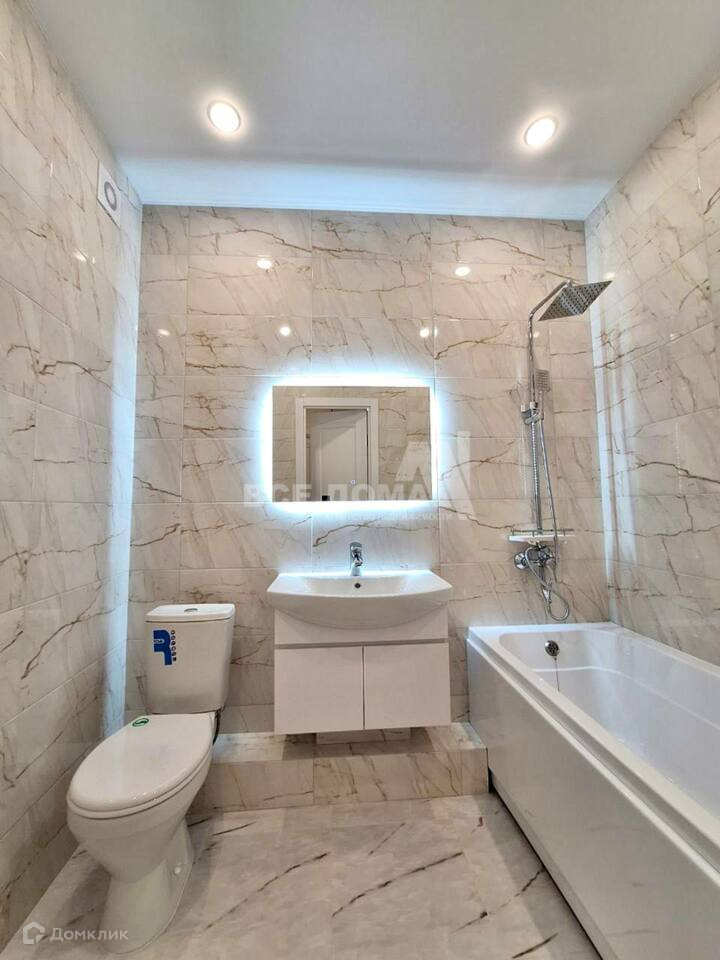 В ванной комнате керамическая плитка, зеркало с подсветкой, тропический душ.