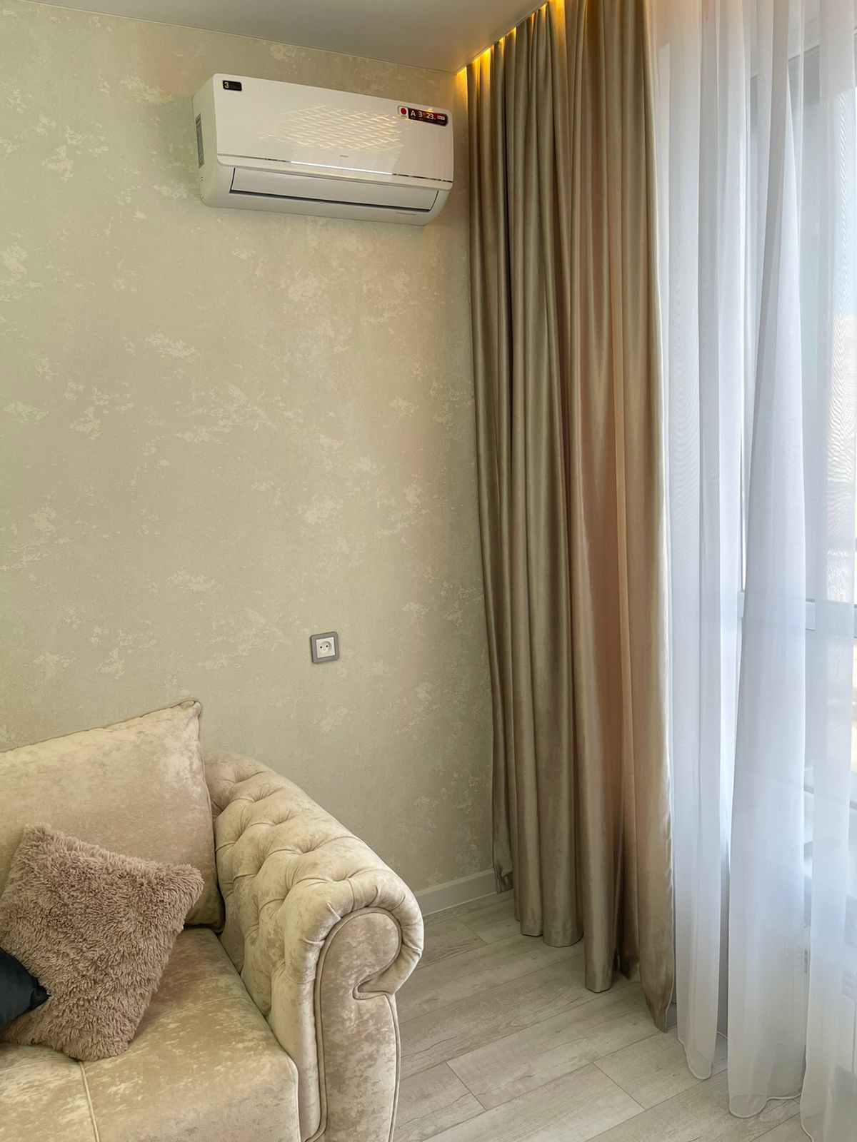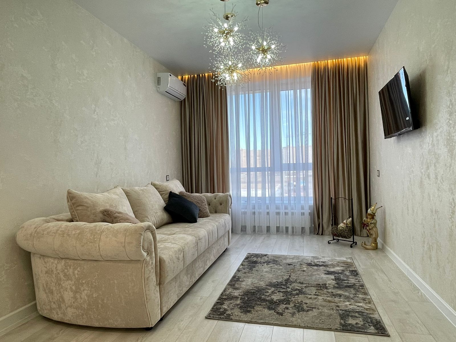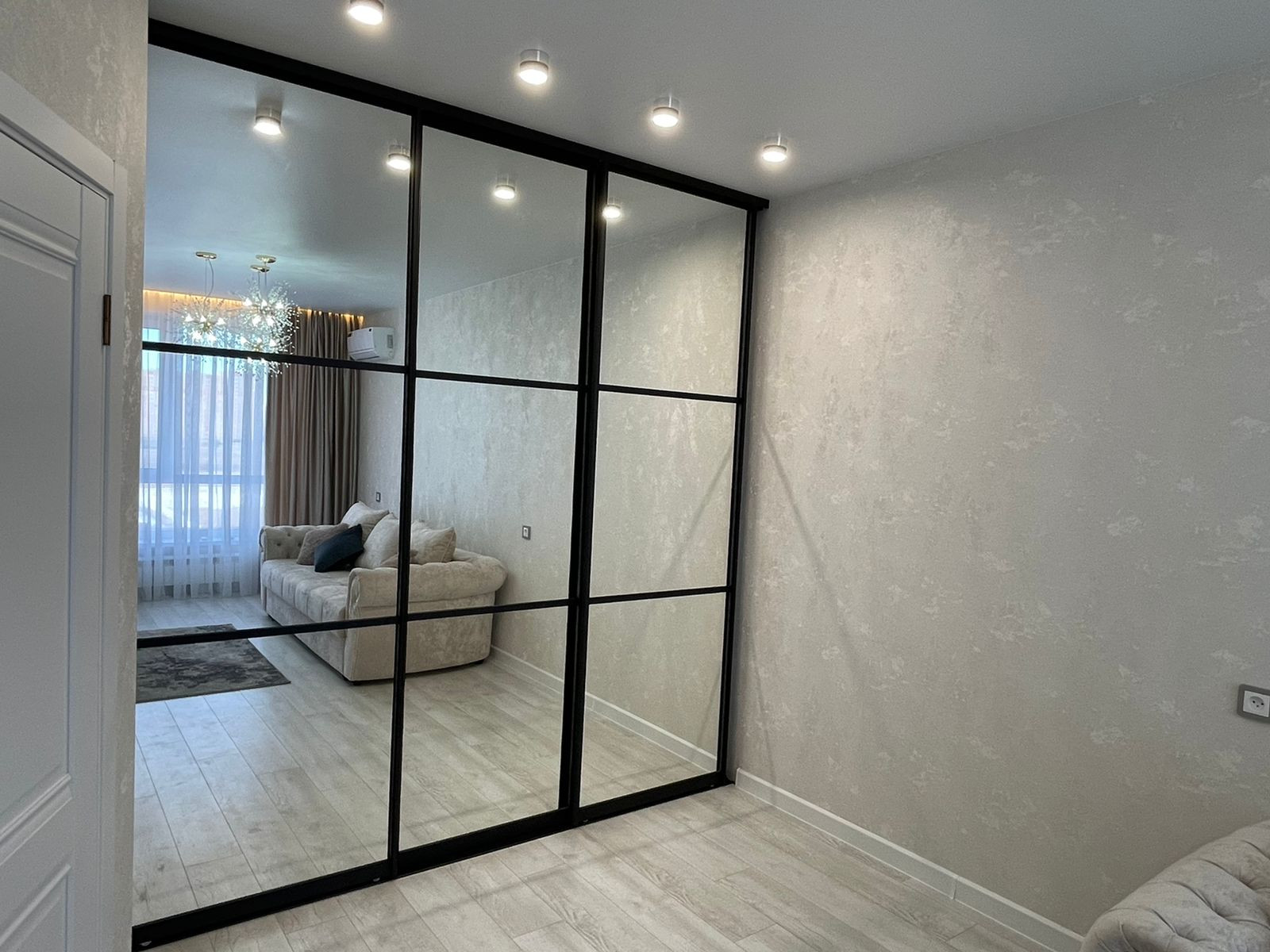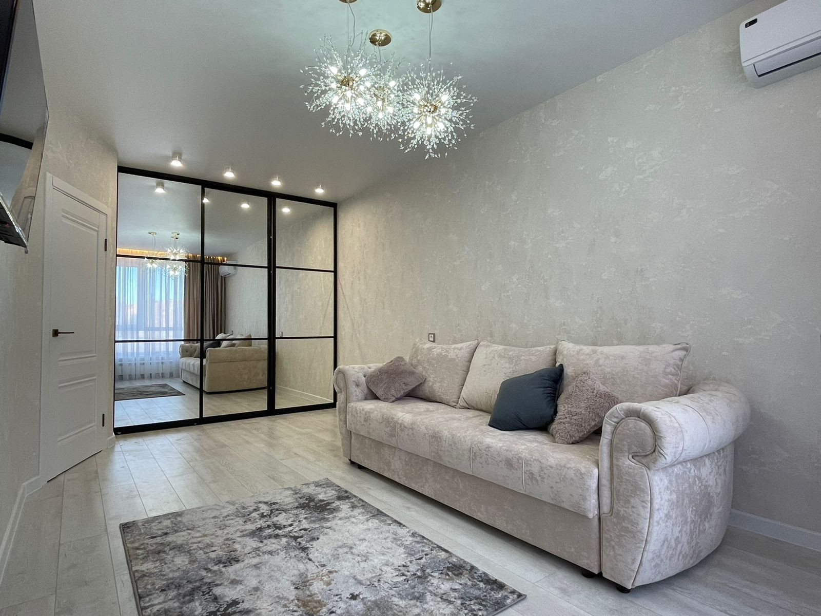 в комнате установлен шкаф-купе, удобный раскладной диван, установлена сплит-система, телевизор.