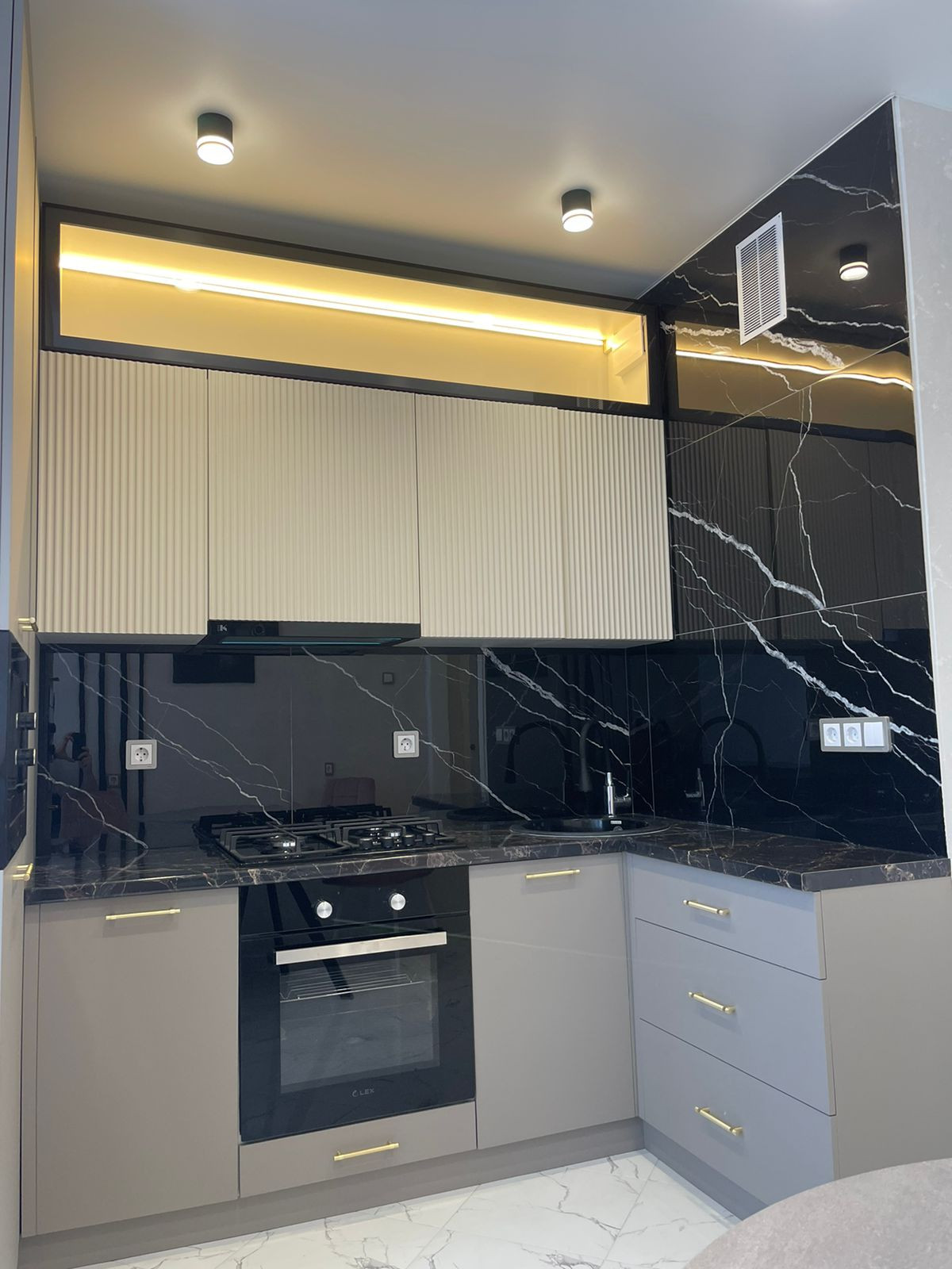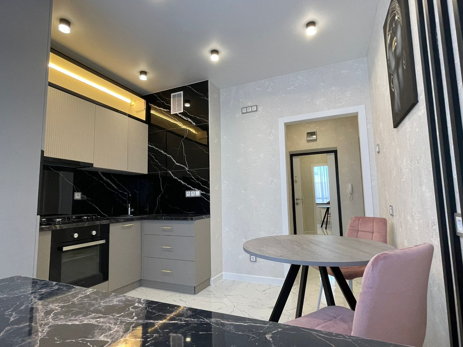 на кухне качественный гарнитур с доводчиками со встроенный техникой - варочная панель, вытяжка, духовой шкаф, встроенная микроволновая печь.