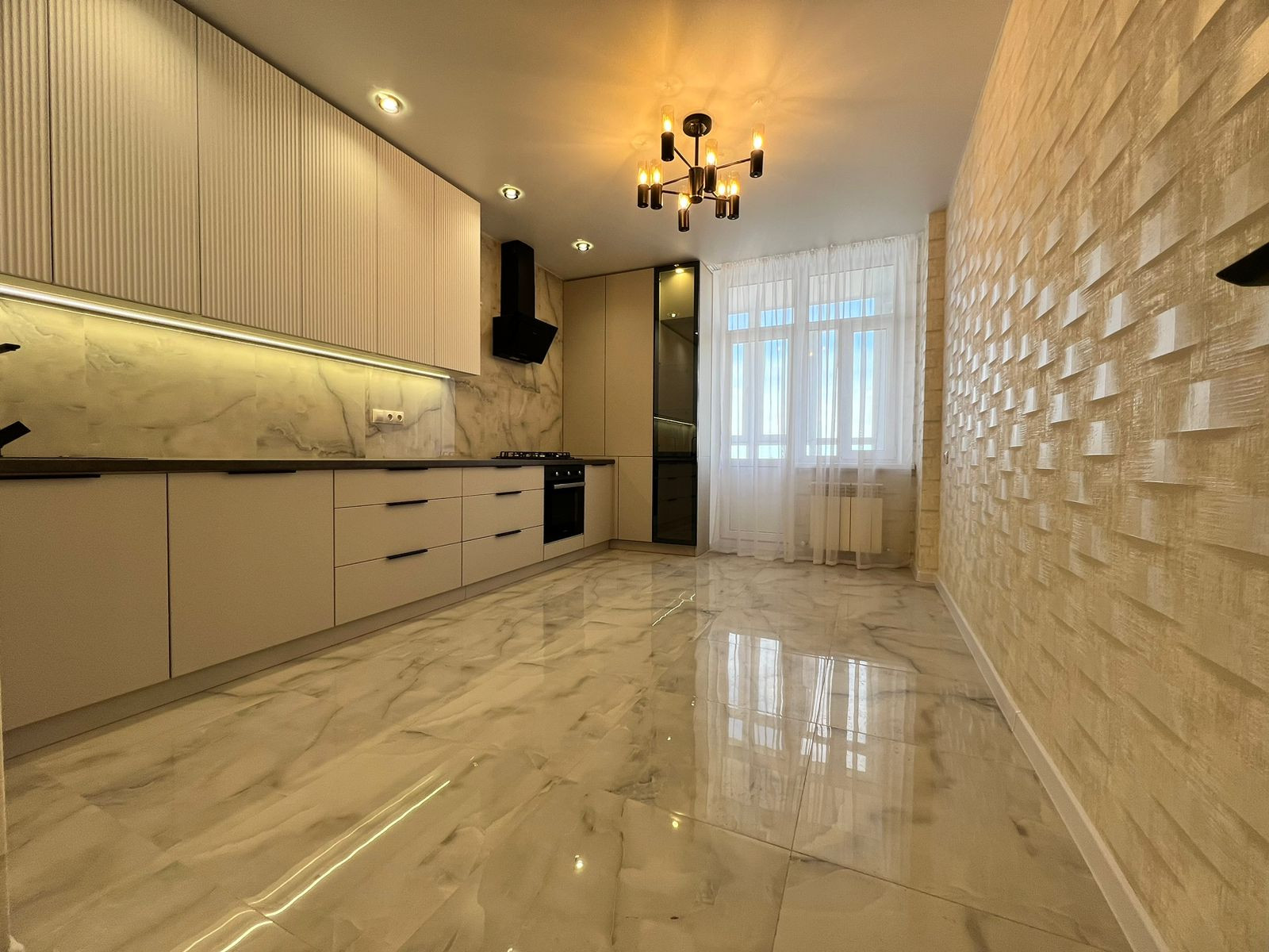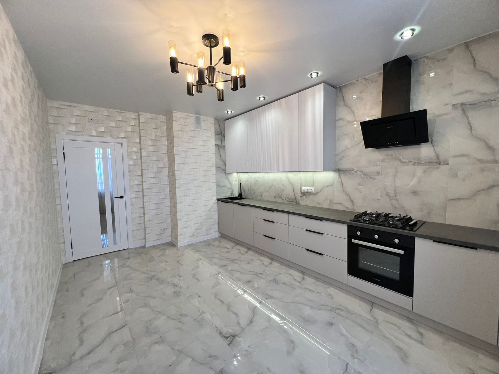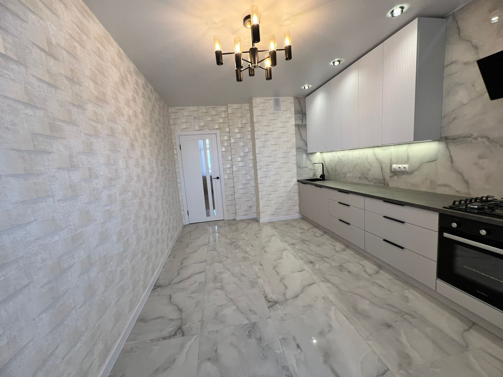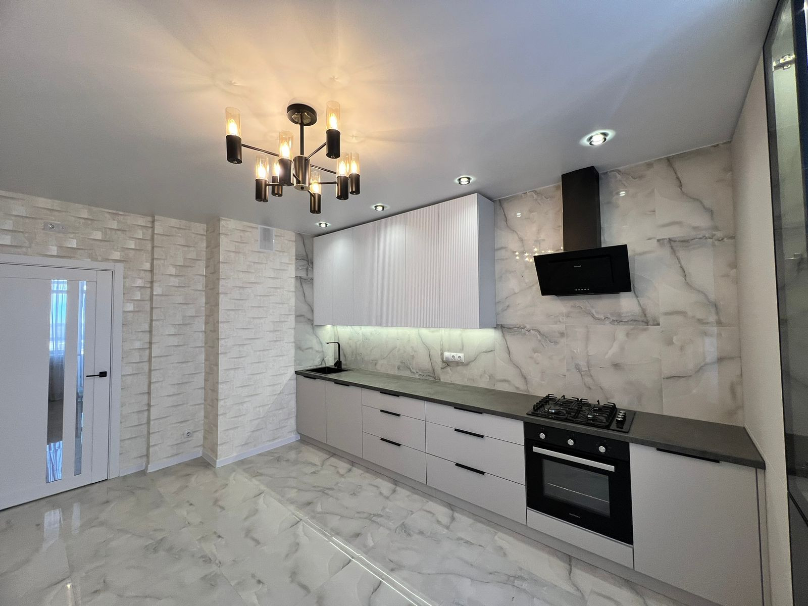 В квартире встроенная кухня с бытовой техникой (духовой шкаф, вытяжка, варочная панель.)